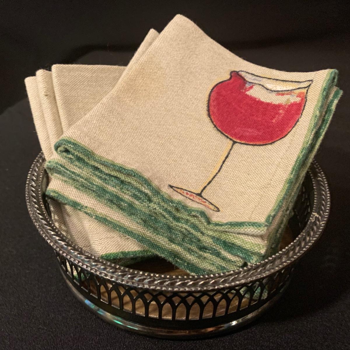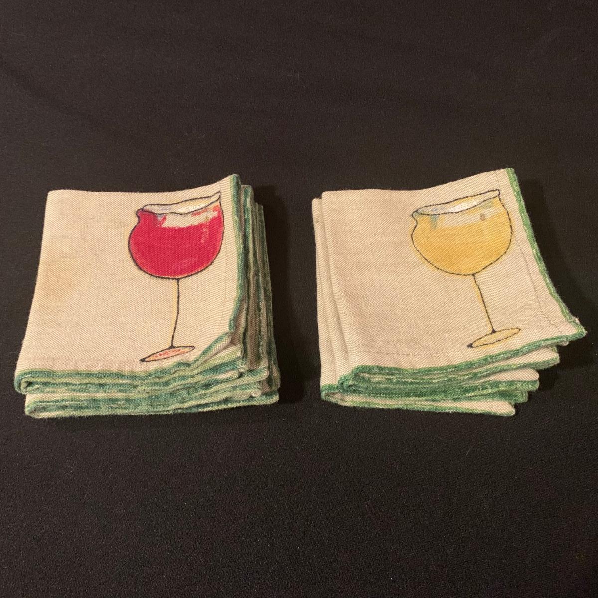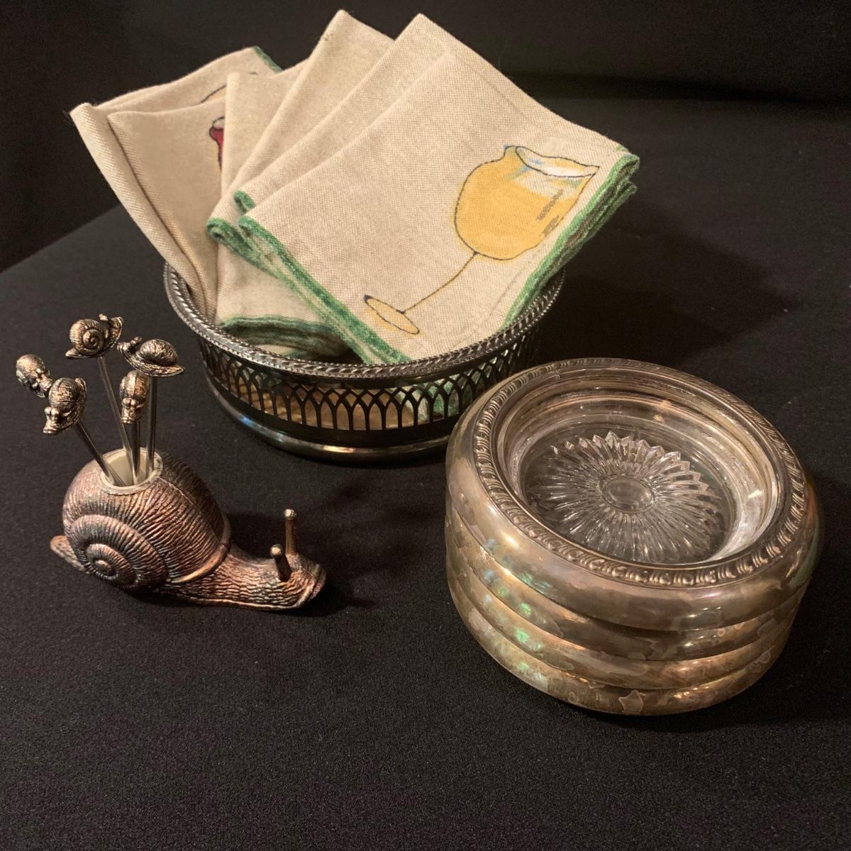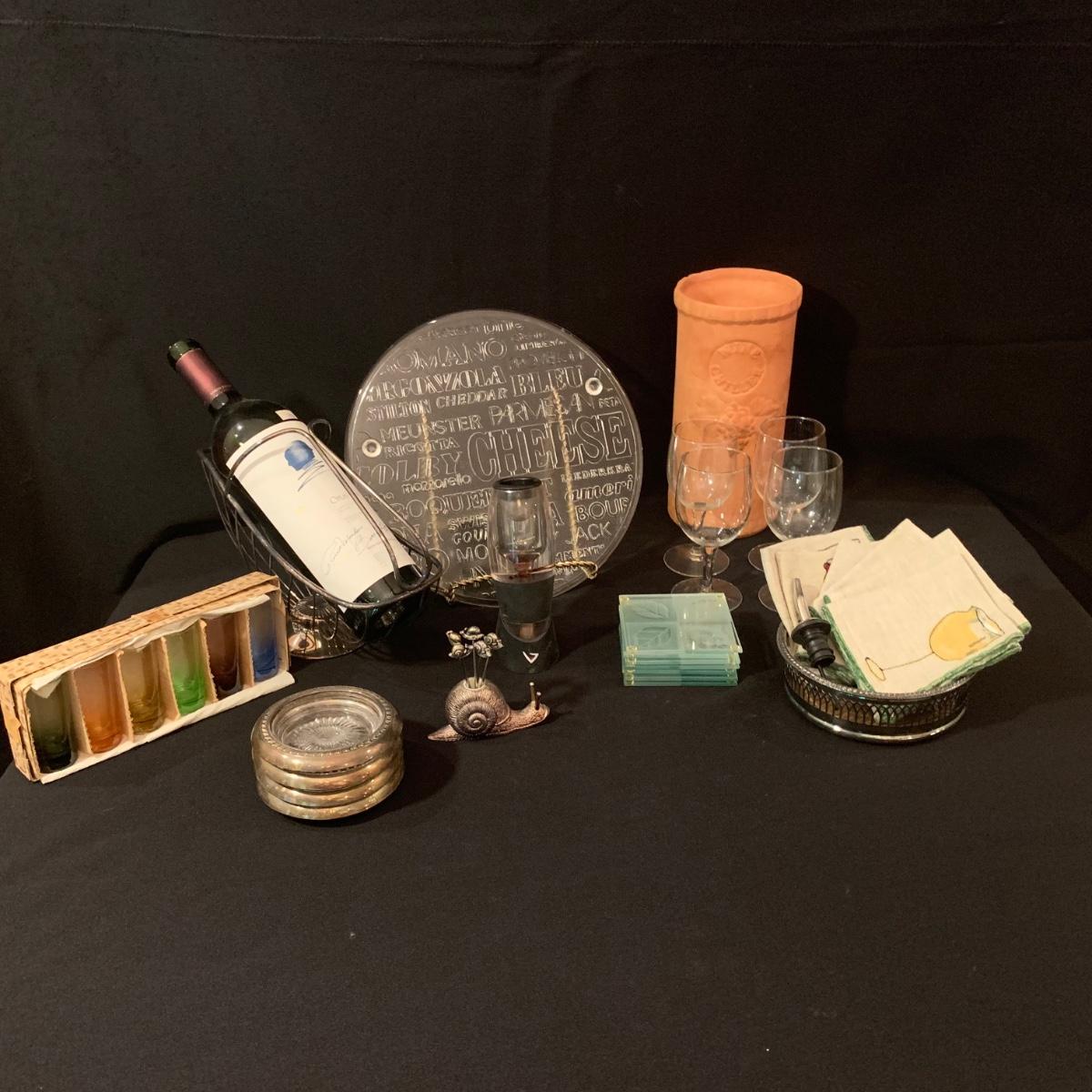 Wine and Cocktail Hour accessories lot includes four Sterling silver and glass ashtrays, four wine tasting glasses, glass cheese plate, Venturi wine aerator, terracotta wine chiller, six cocktail napkins with holder, seven glass coasters, snail cocktail forks, metal wine glass holder, and six colorful shot glasses. Please see photos for more details. Terracotta wine chiller measures, 4.5”D x 9.5”H. Wine bottle only in photos to show bottle holder use. Wine bottle is not included. Shipping available.
