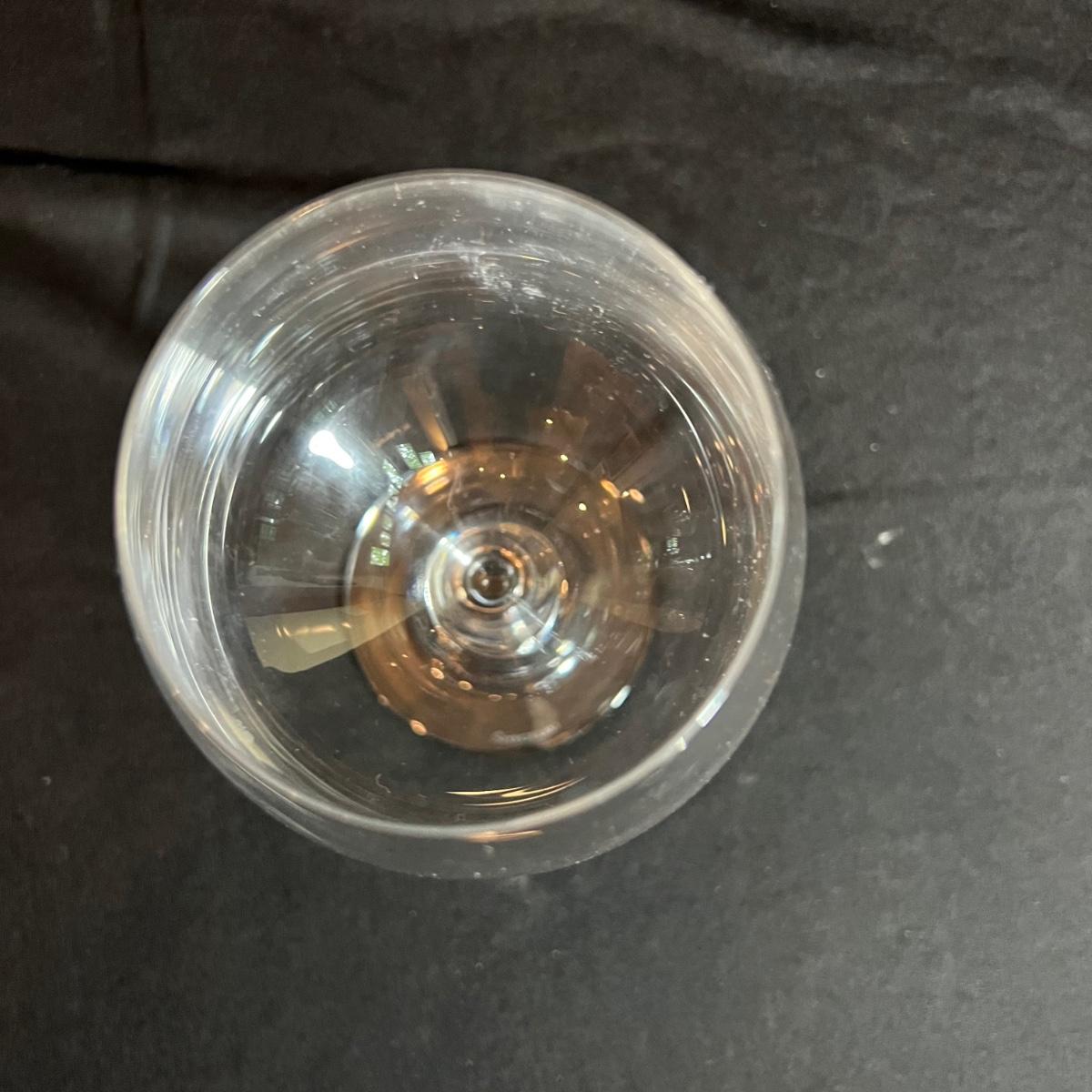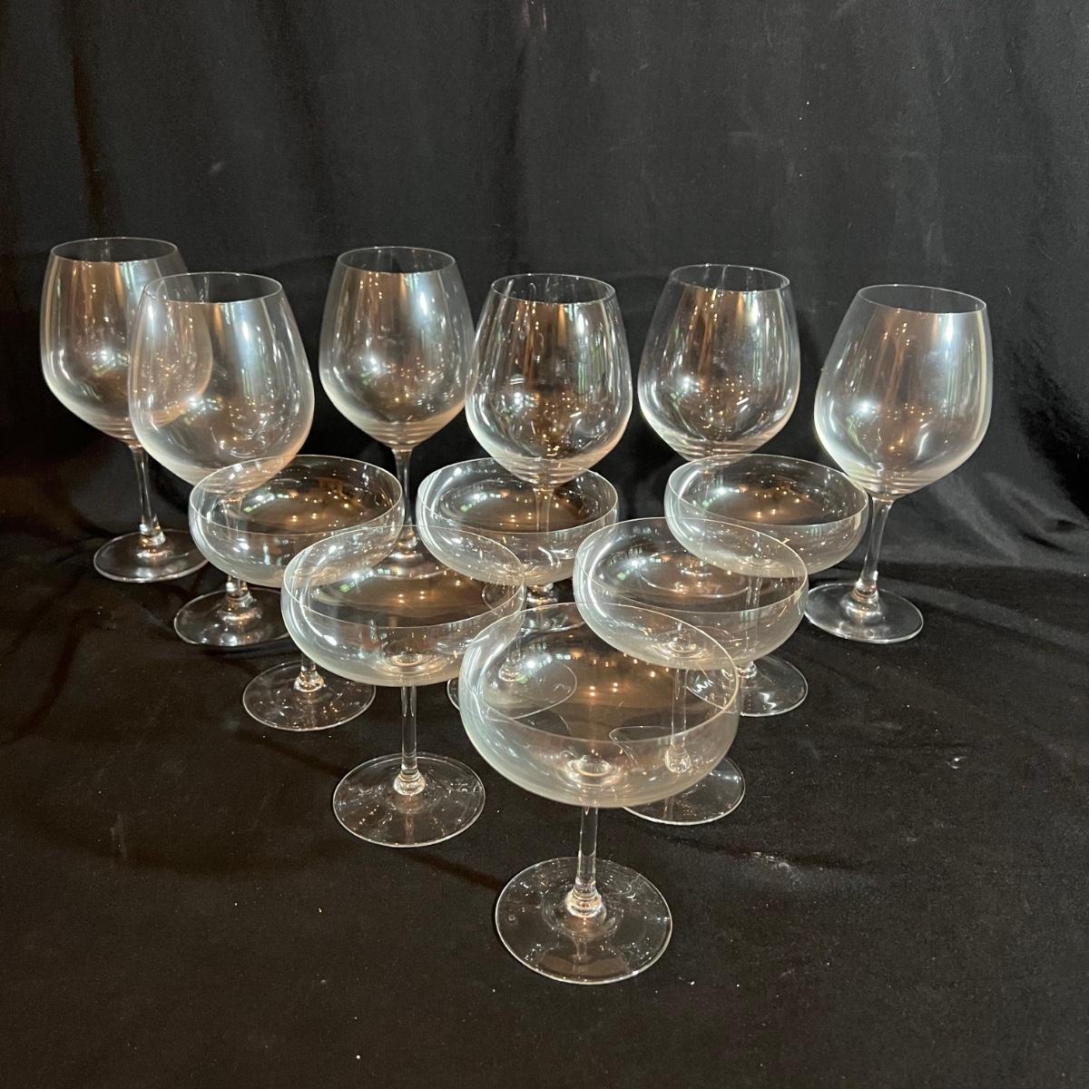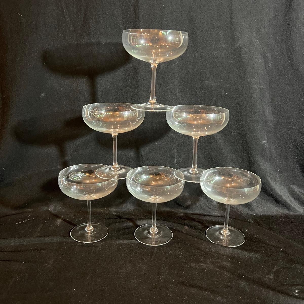 Six margarita-style glasses each 4.5”D x 5”H and six Spiegelau wine glasses approximately 4”D x 9”H.