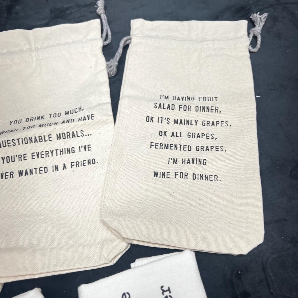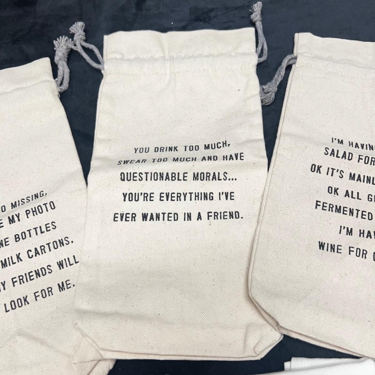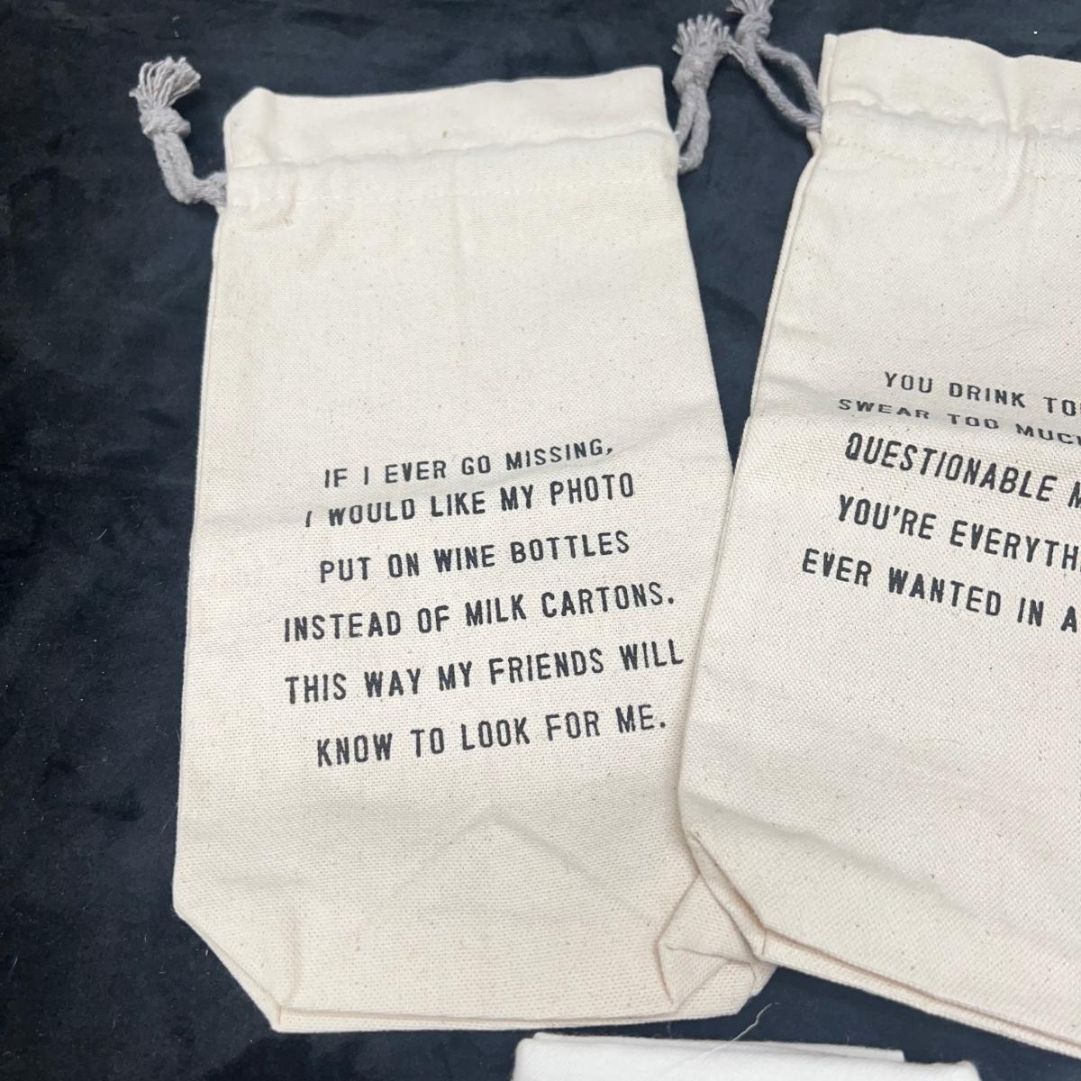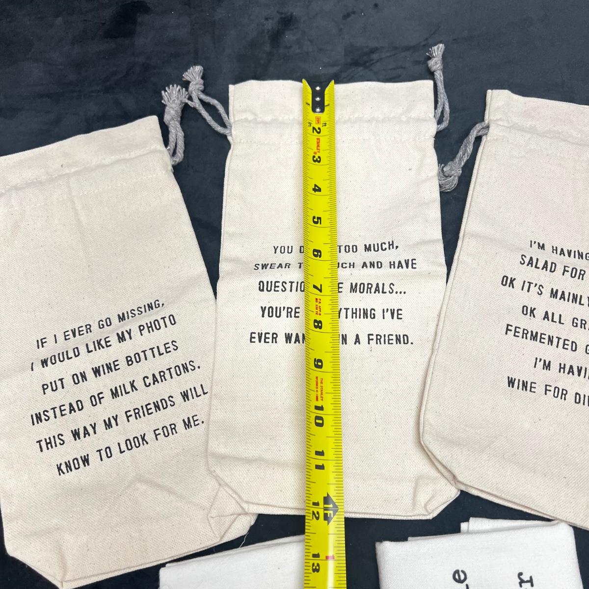 These durable canvas wine bags make carrying your wine bottles easier and more stylish. With drawstring closures and cute sayings, they are perfect for gifting or transporting wine. Made with high-quality materials, these bags provide added protection for your bottles.