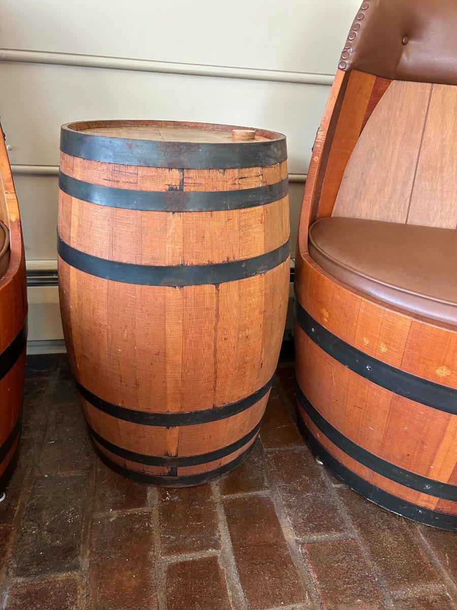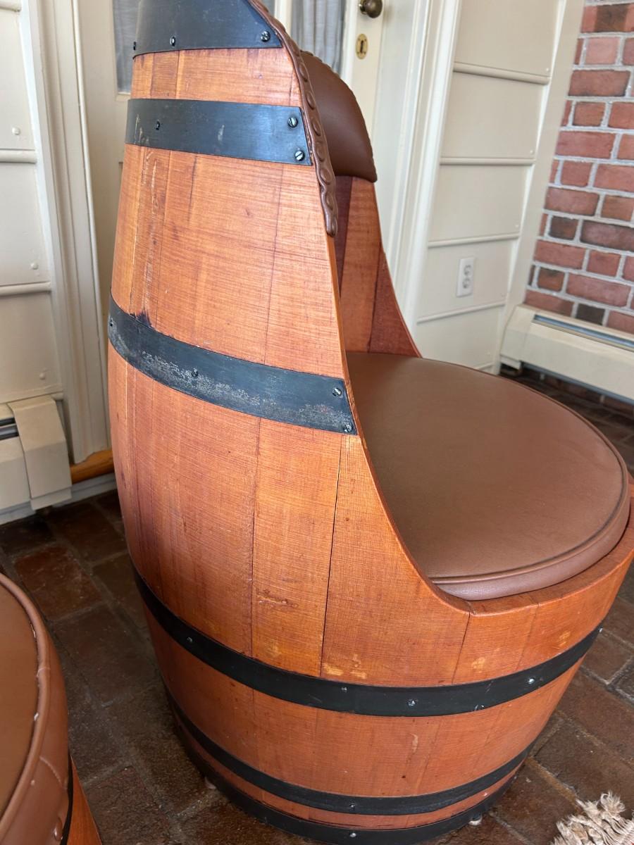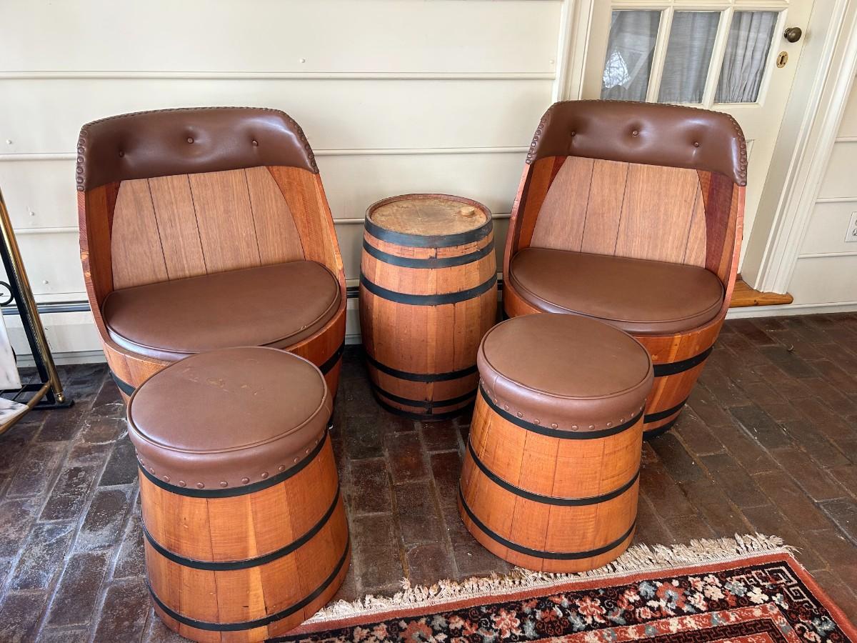 Be the first (and only) to own this amazing one-of-a-kind set handmade out of wine barrels. Two chairs with stools and small table make the perfect place to try a new bottle of wine with your friend.