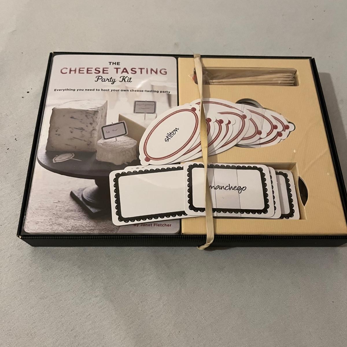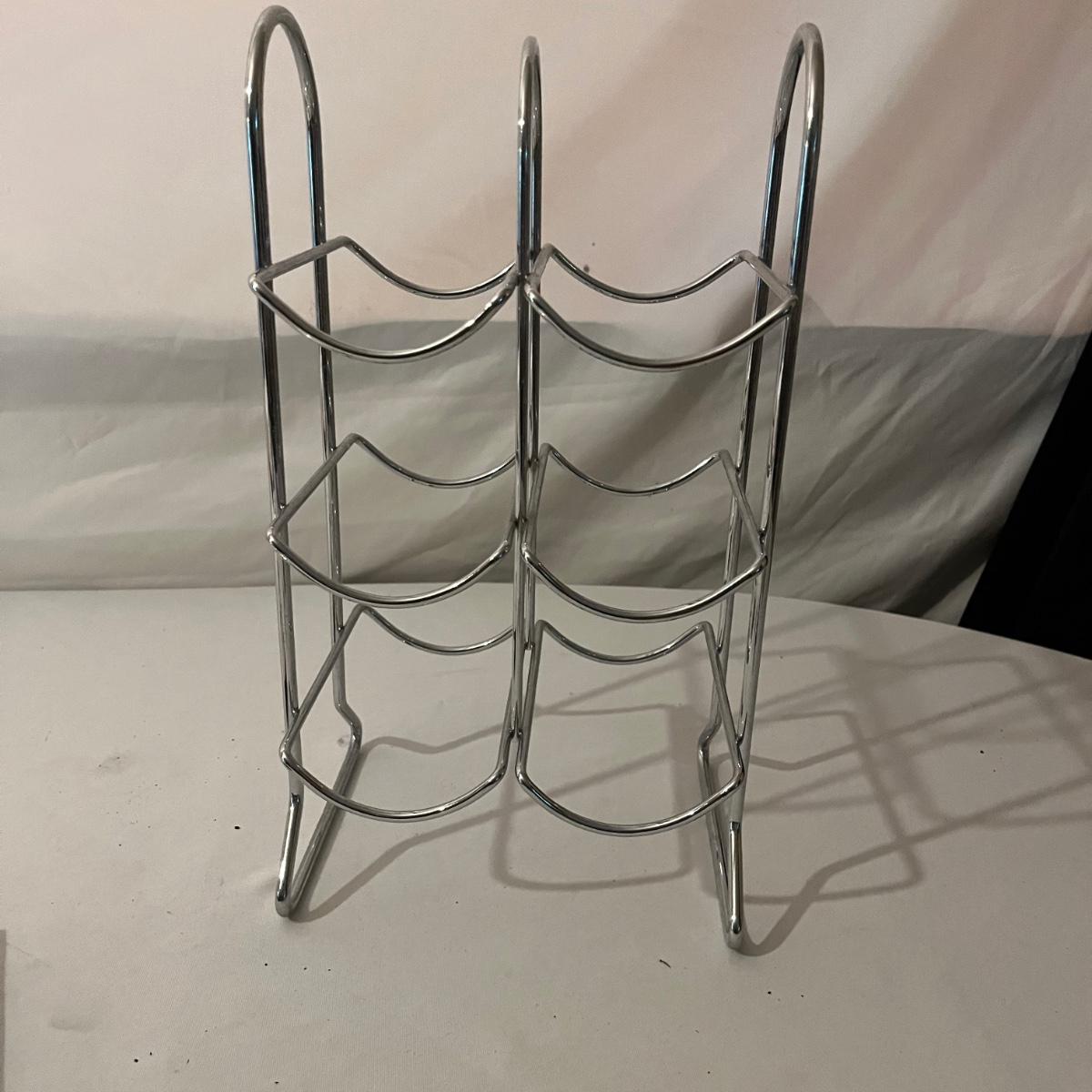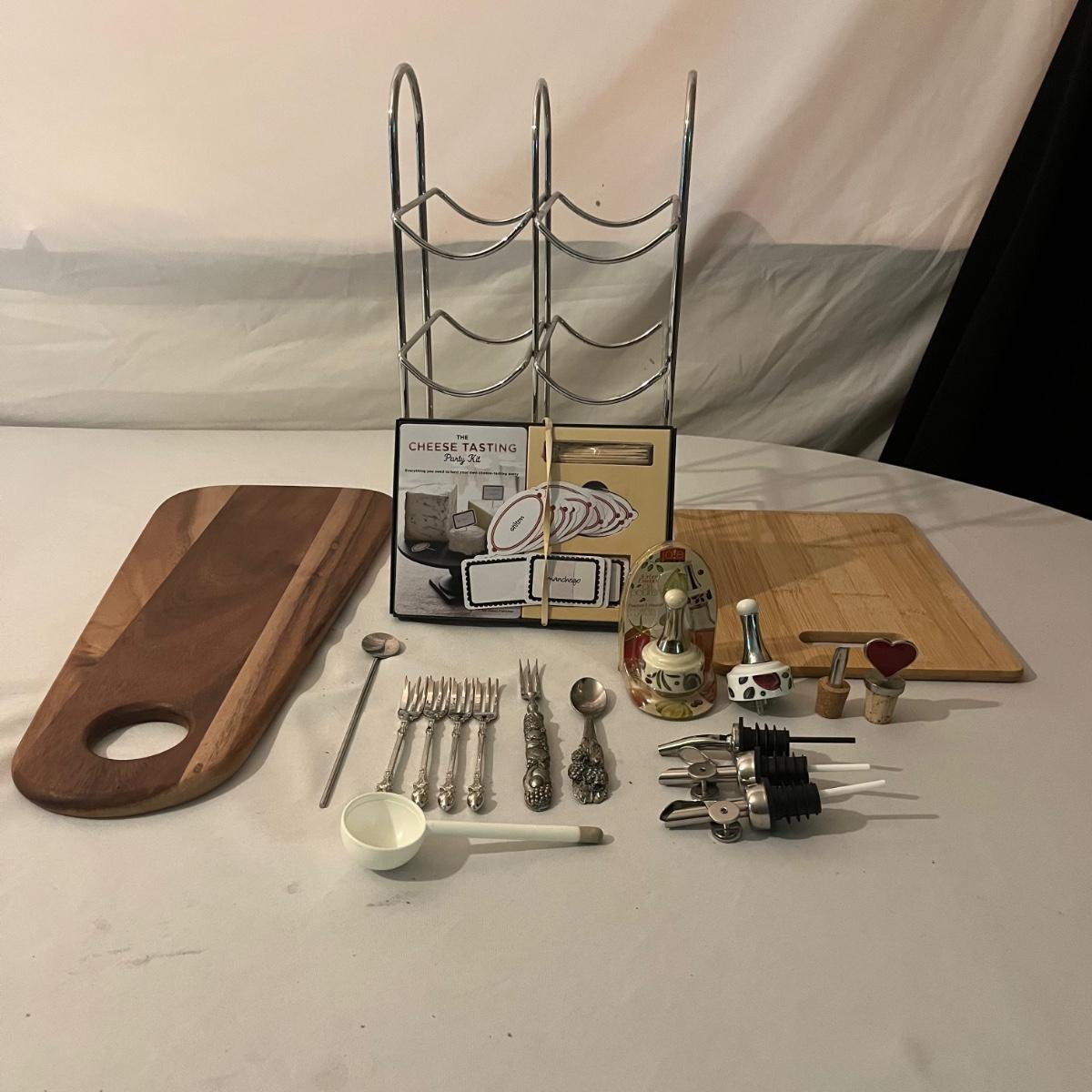 Lot includes a chrome wine rack, four bottle pourers, one heart bottle stopper, two oil pourers, pewter knife and fork, four small forks, cheese tasting party kit and two cutting boards. Wine rack measures 6.5” x 8” x 15”.
