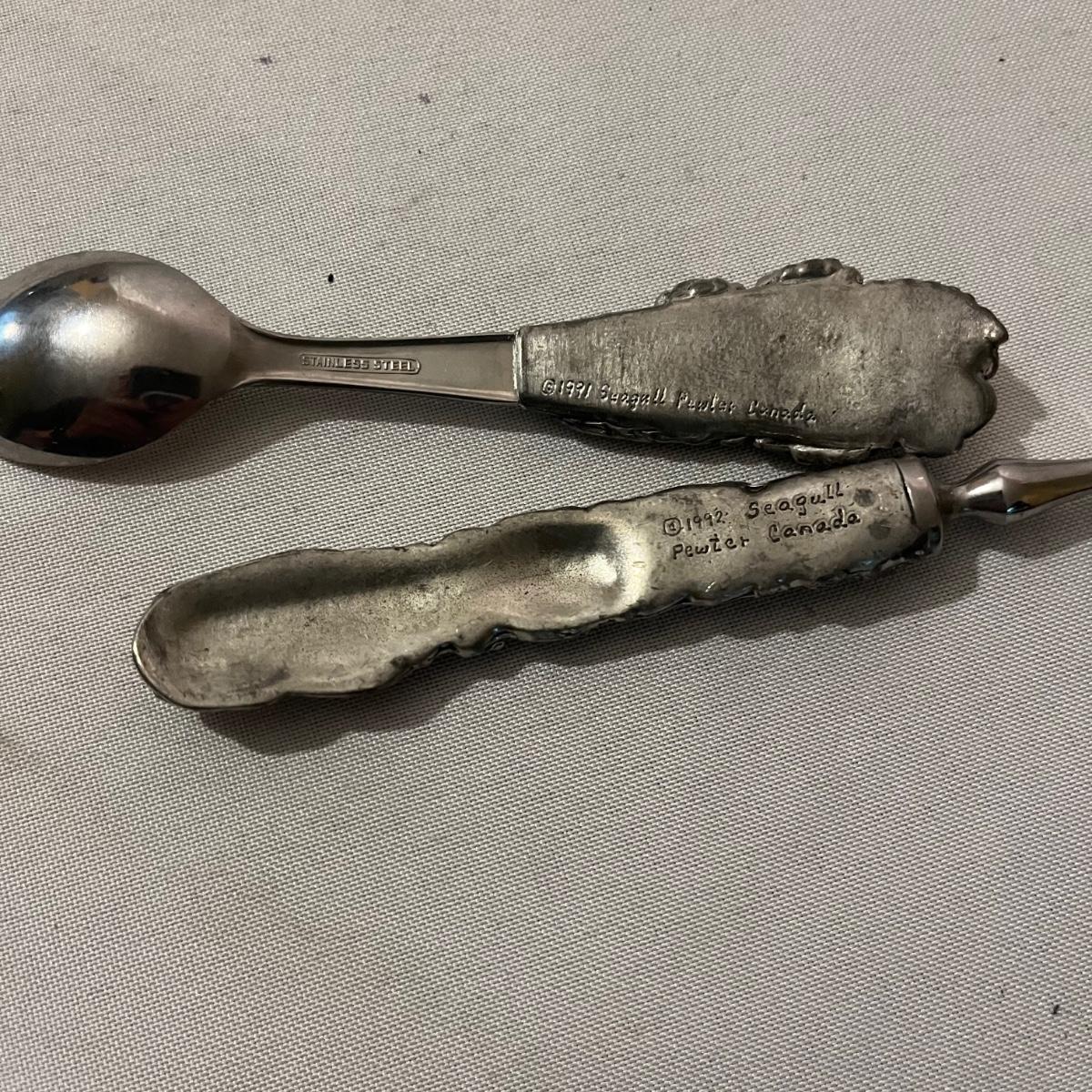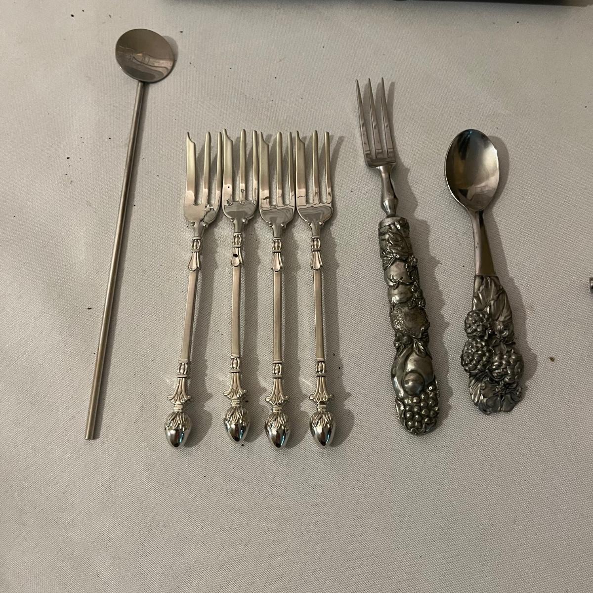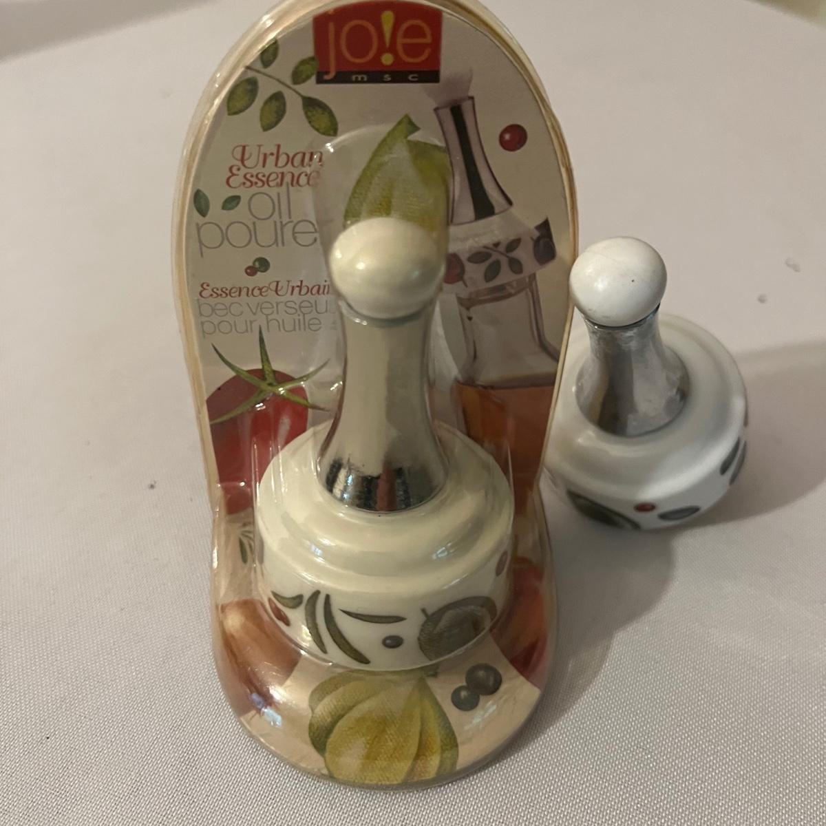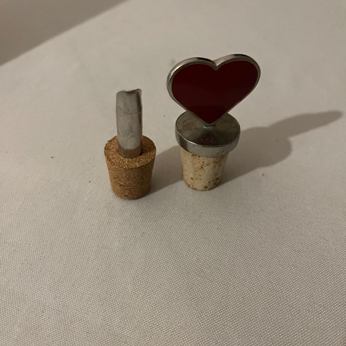 Lot includes a chrome wine rack, four bottle pourers, one heart bottle stopper, two oil pourers, pewter knife and fork, four small forks, cheese tasting party kit and two cutting boards. Wine rack measures 6.5” x 8” x 15”.