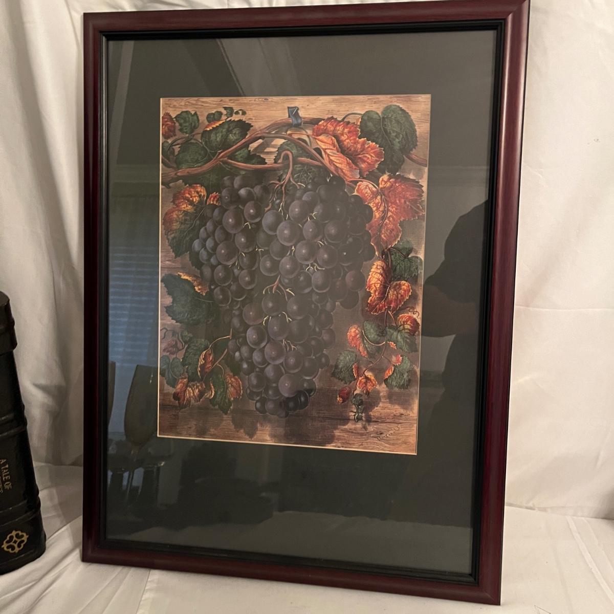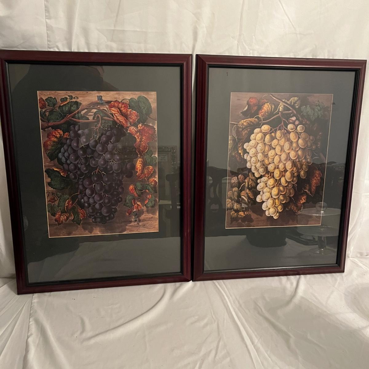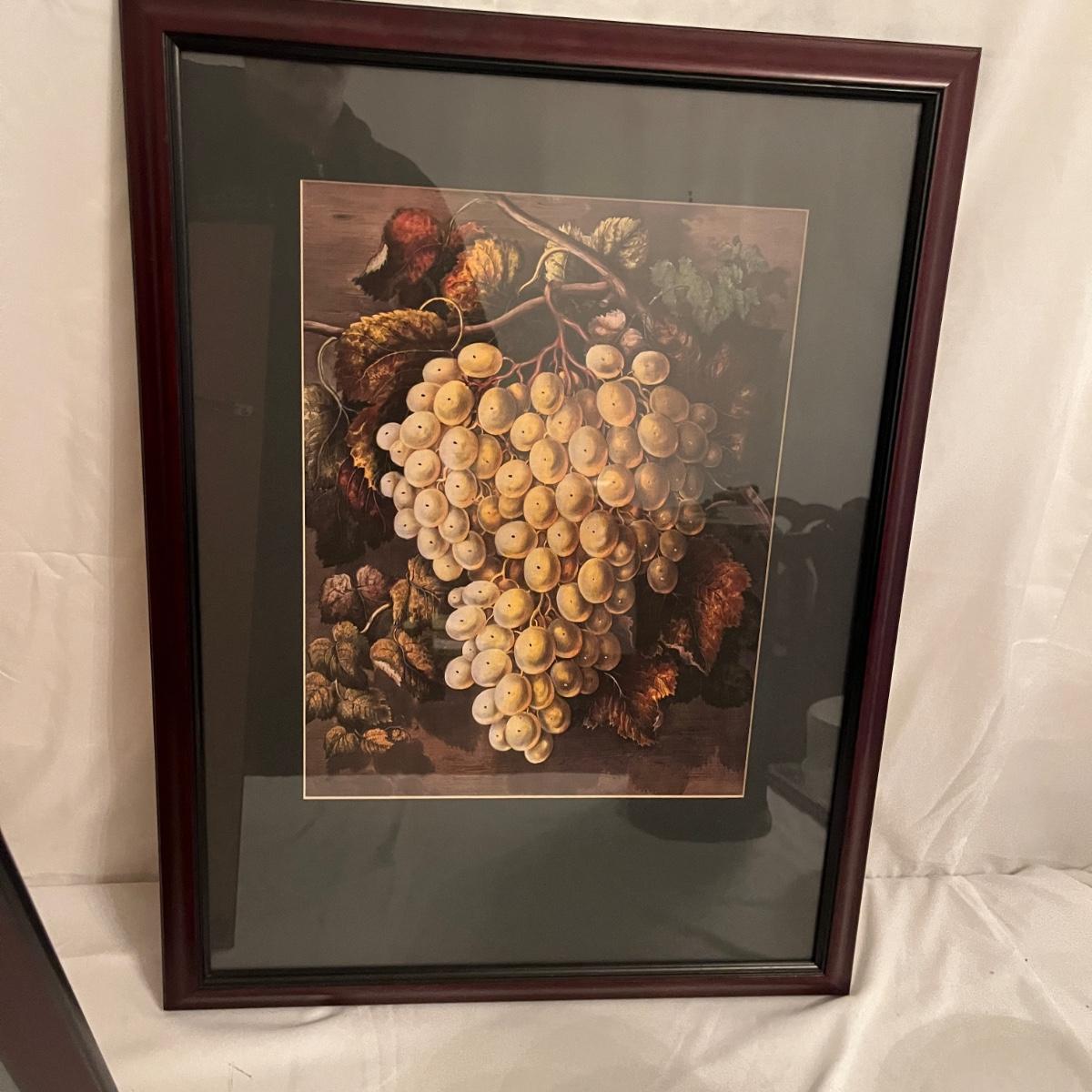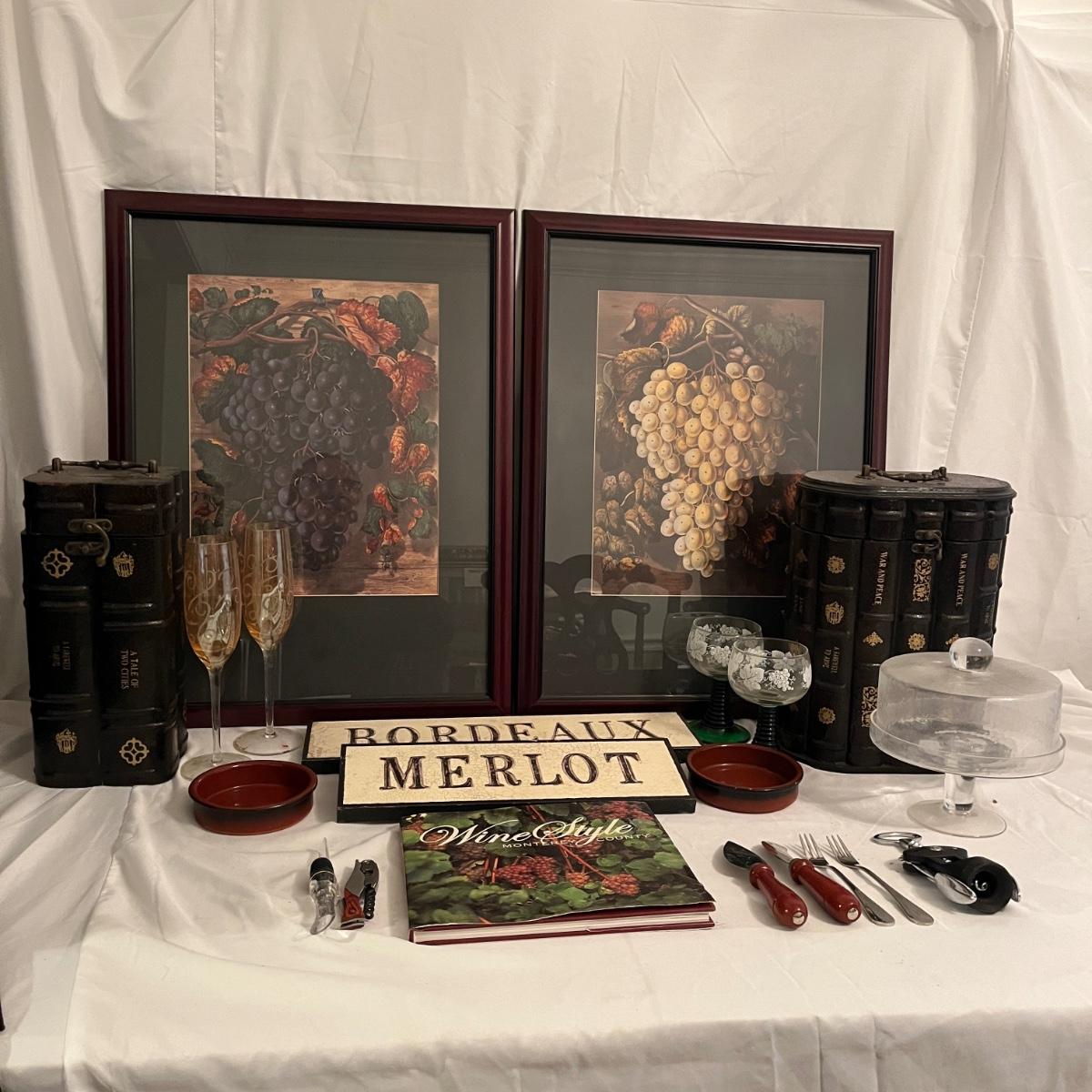Lot includes two wooden wine carrying cases, two wine decor framed artwork, wine opener, glasses, cheese dish and more. Frames measure 18” x 24”H.