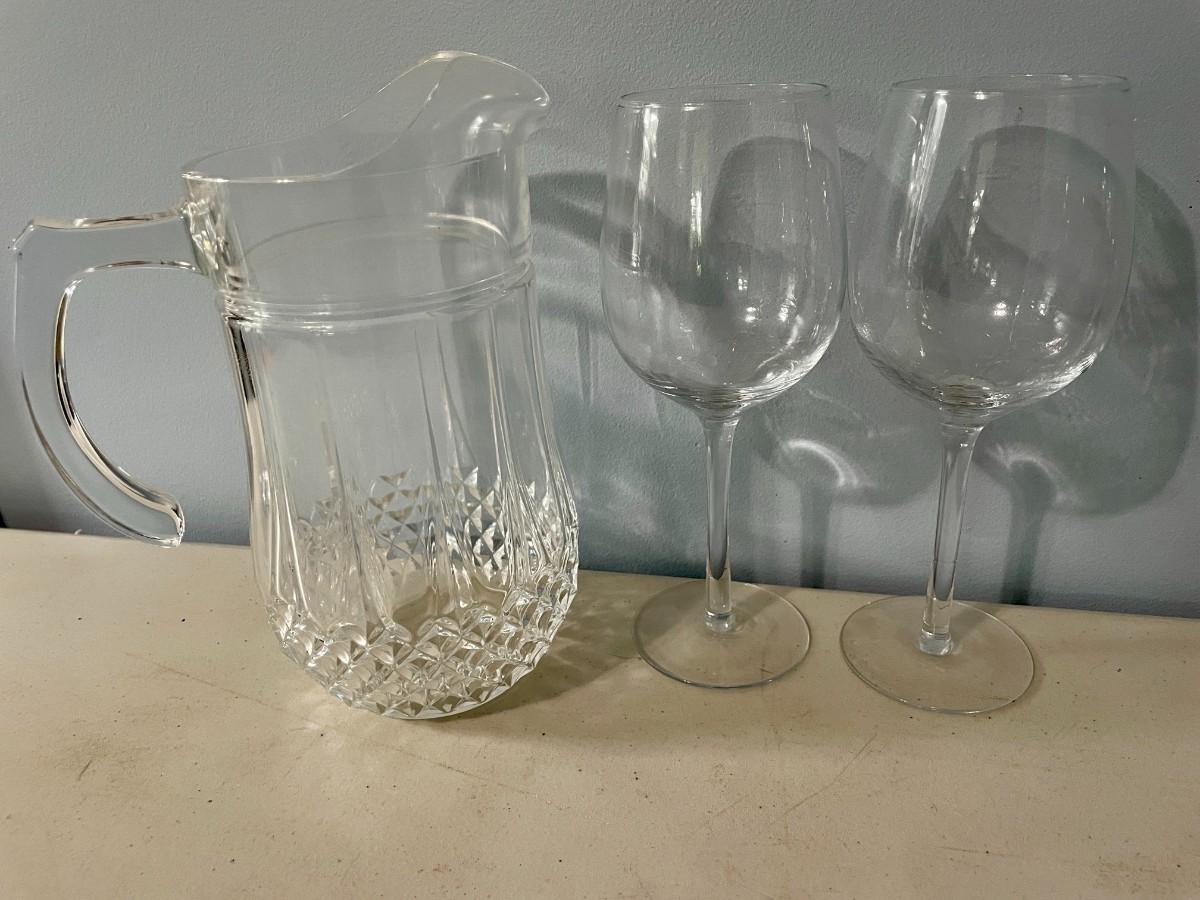 Includes a pair of white wine glasses, 4 red wine glasses and a water pitcher.