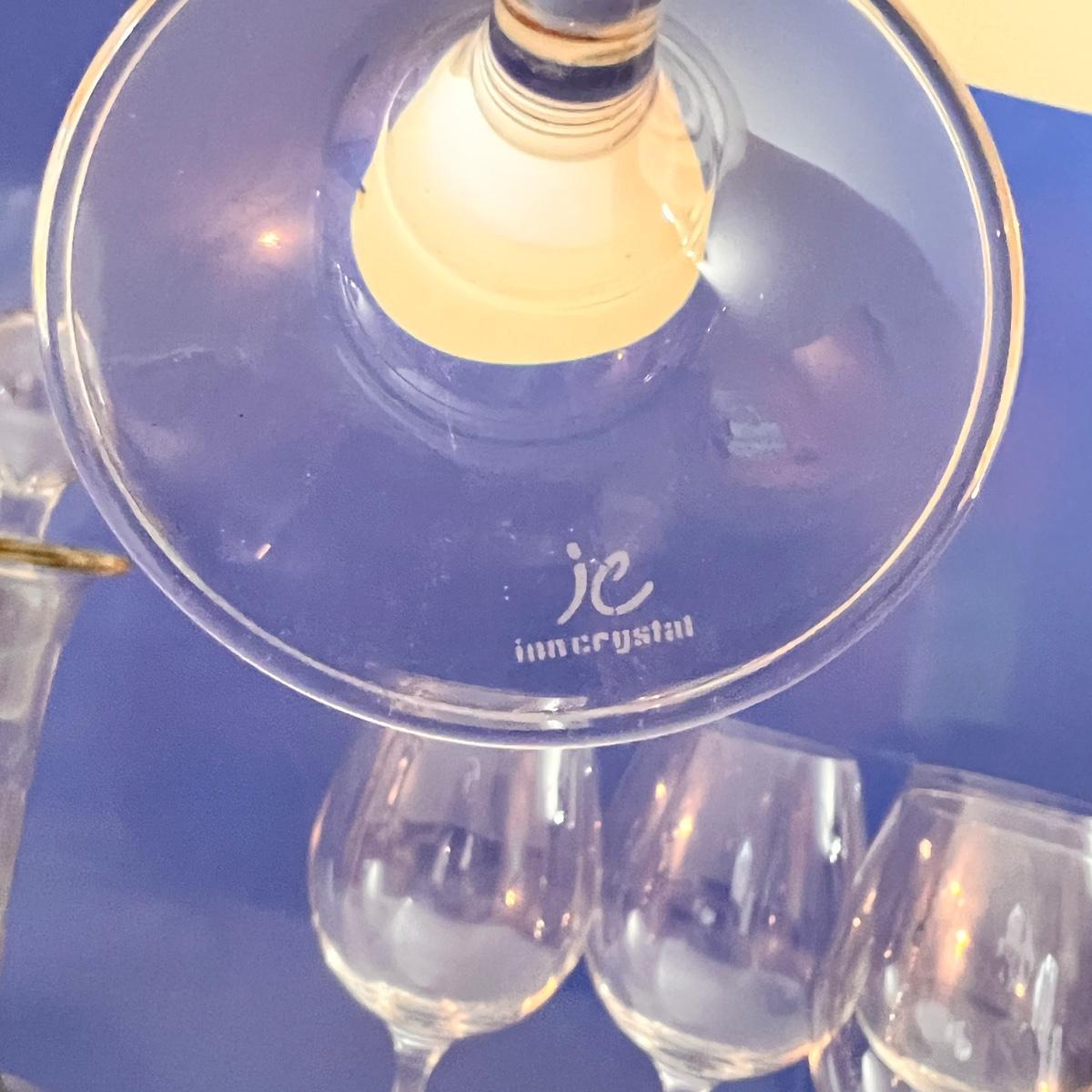 5 IC Inn Crystal Wine Glasses + Etched Antique Decanter