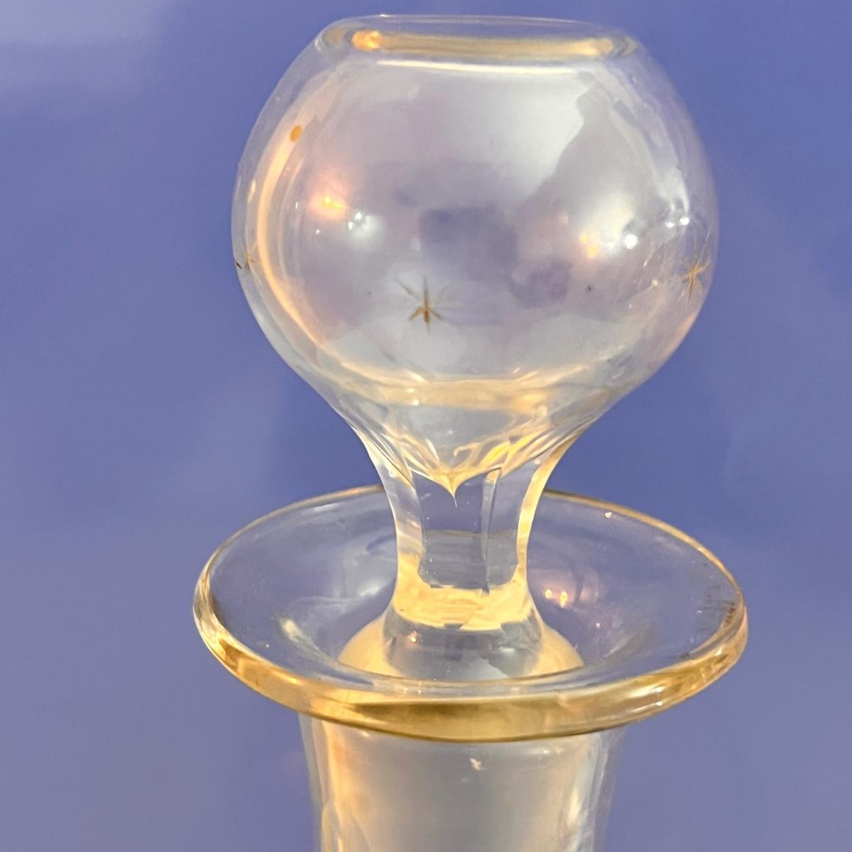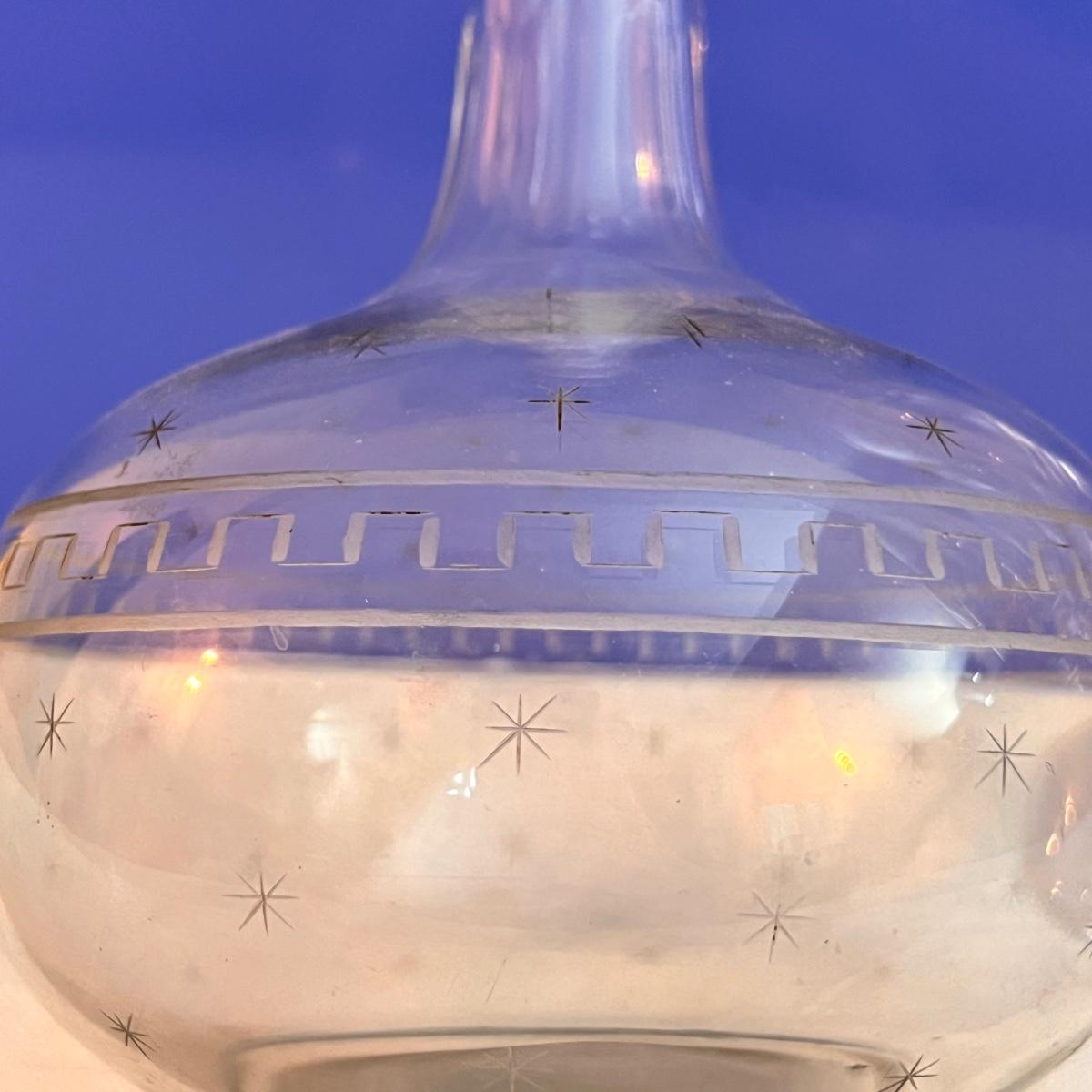 Etched blown glass decanter with "Roman Key and Star" pattern - possibly made by Boston & Sandwich Glass Co. Stopper has etched stars. 5 crystal wine glasses by IC Inn Crystal. This is an awesome lot of high end barware.