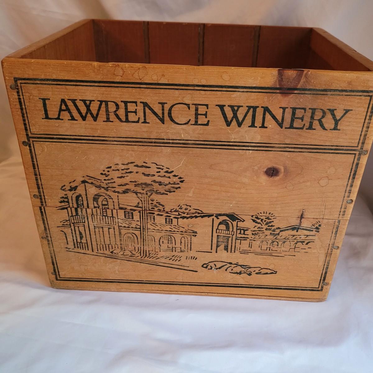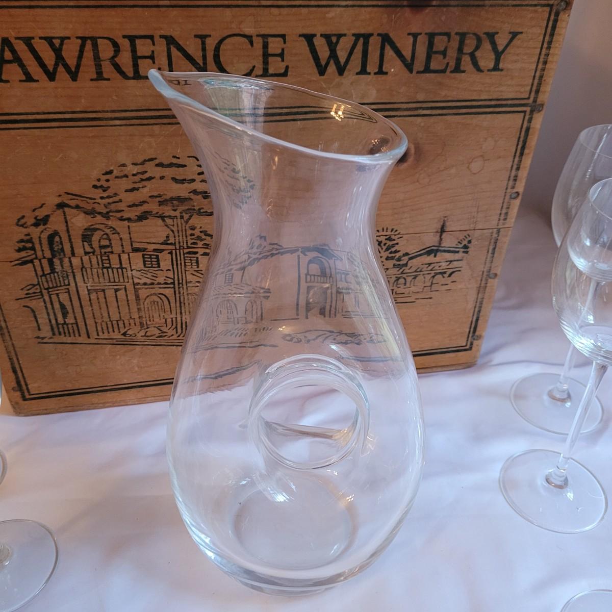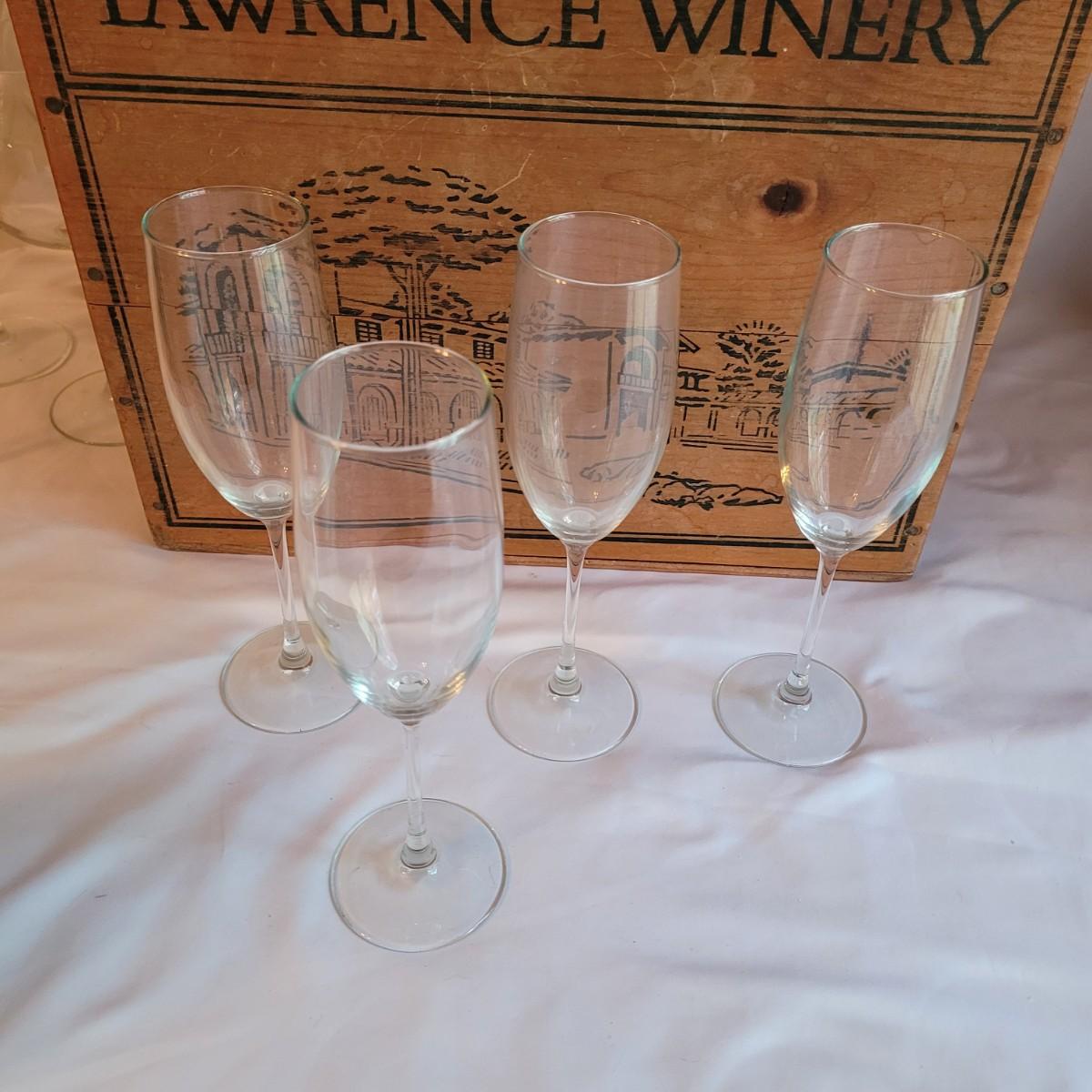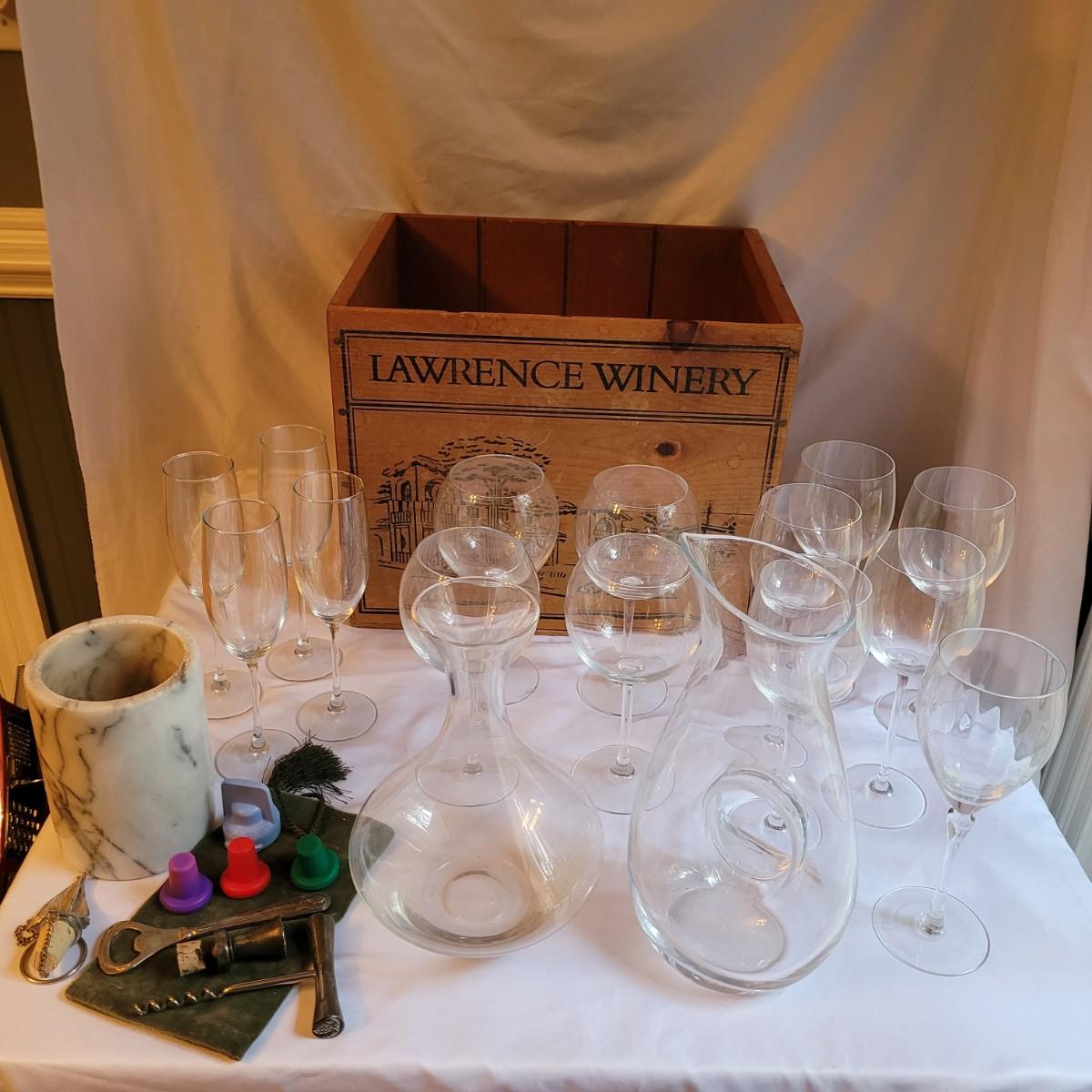 A variety of wine and champagne glasses, wine carafes, bottle stoppers and more are accompanied by a Lawrence Winery wooden wine case. 14 glasses total, crate measures 12" x 15.5" x 12.5"H. Shipping available.