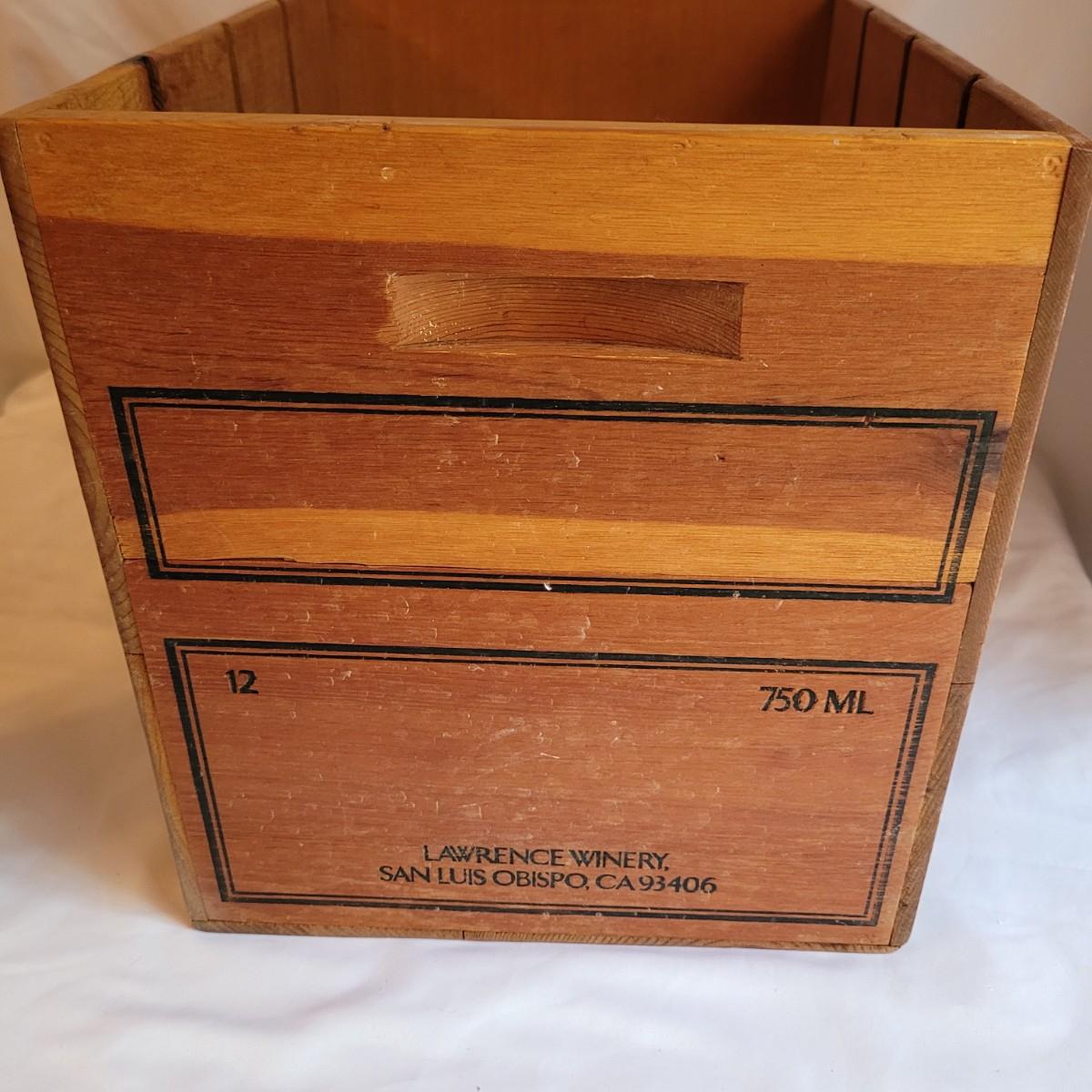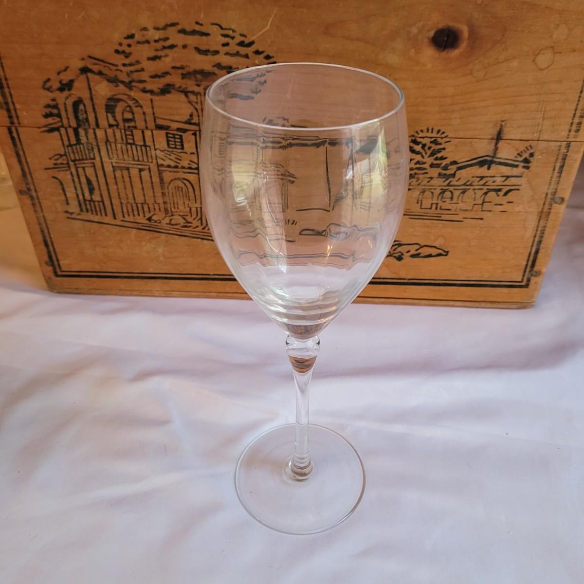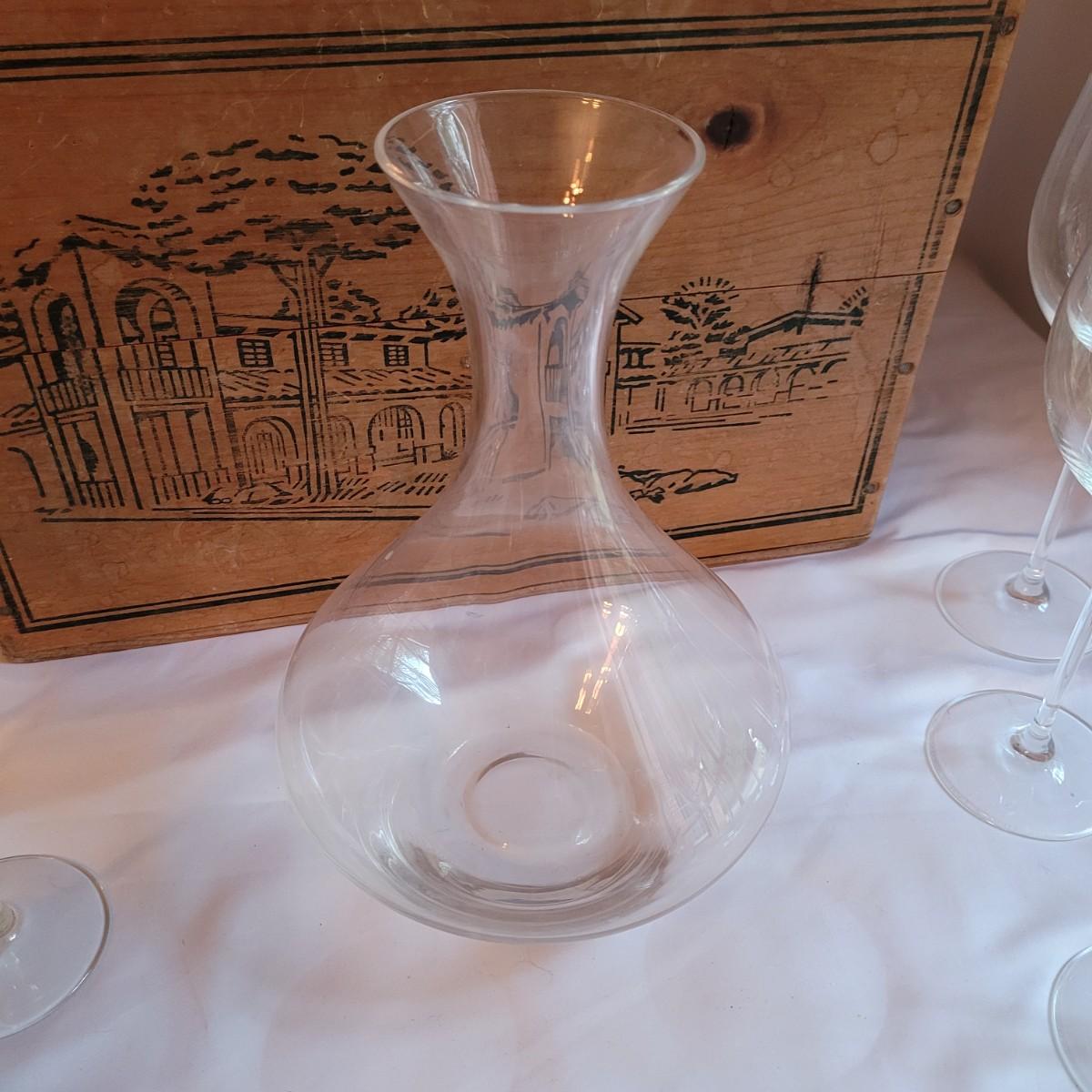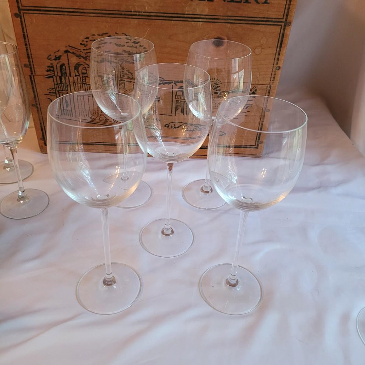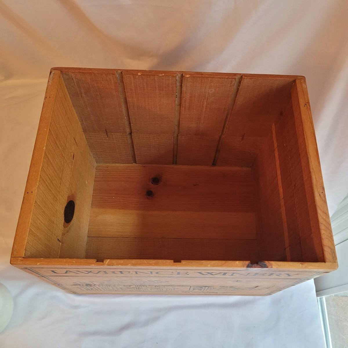 A variety of wine and champagne glasses, wine carafes, bottle stoppers and more are accompanied by a Lawrence Winery wooden wine case. 14 glasses total, crate measures 12" x 15.5" x 12.5"H. Shipping available.