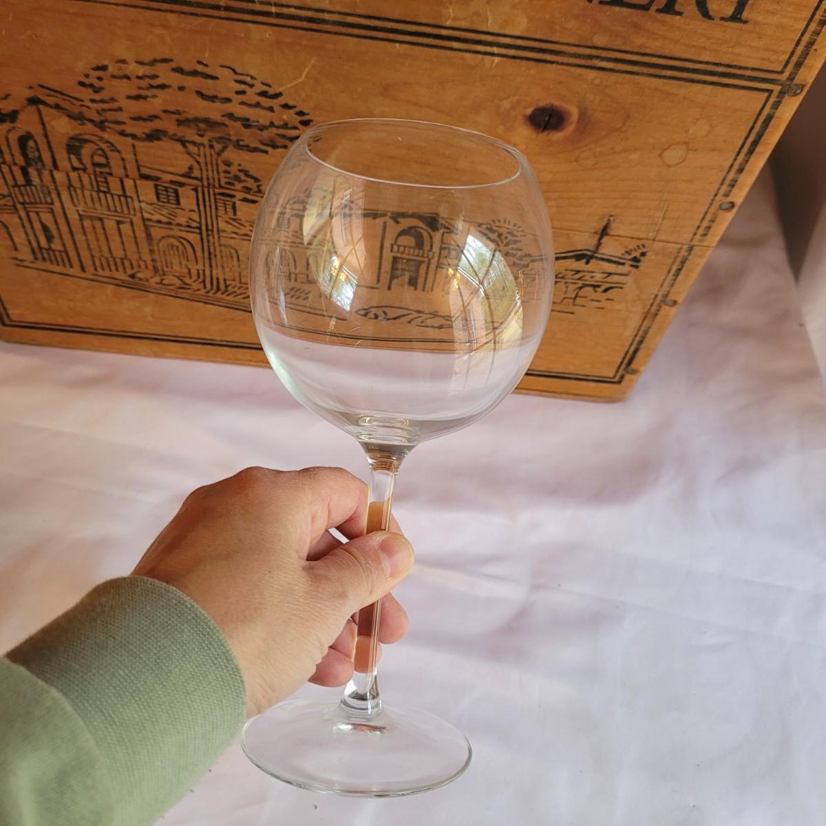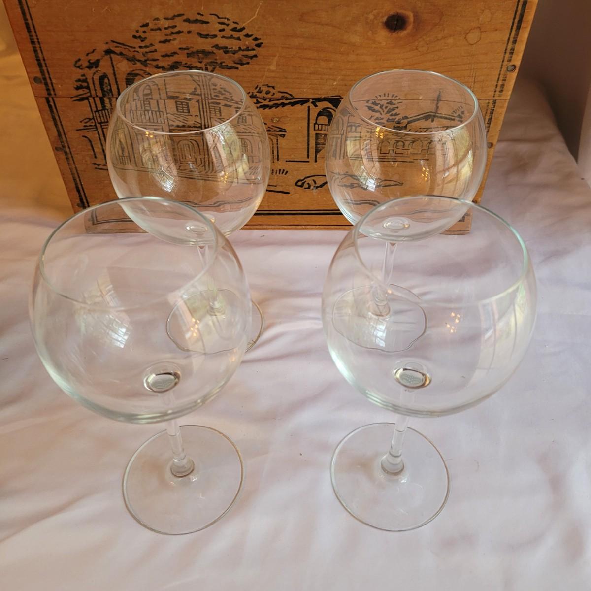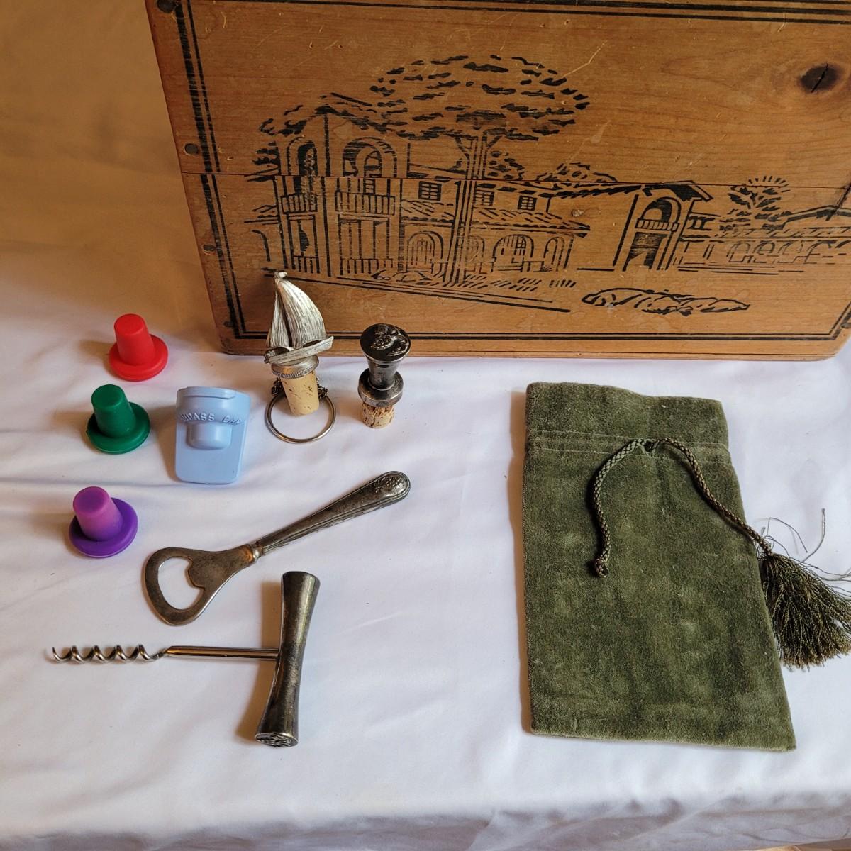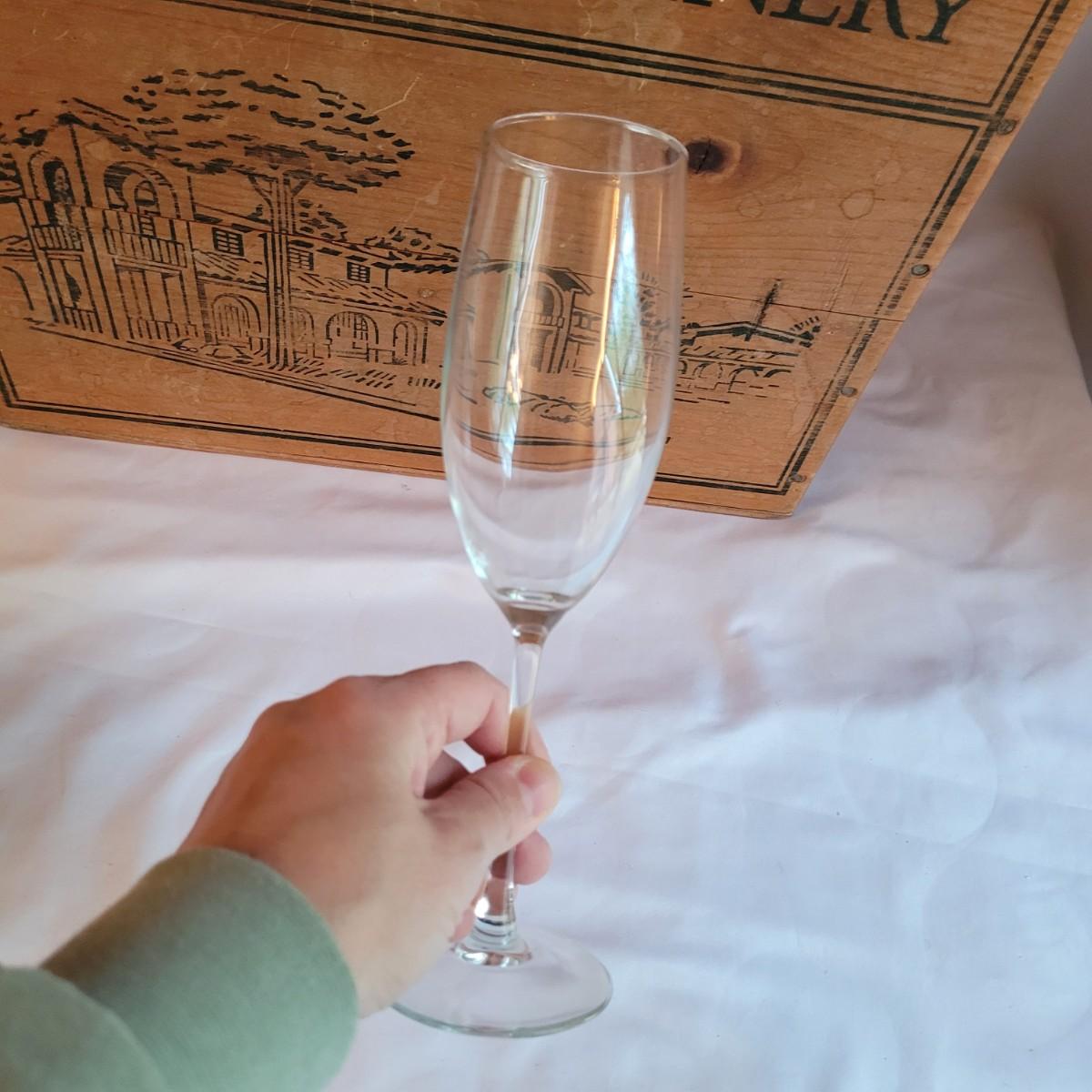 A variety of wine and champagne glasses, wine carafes, bottle stoppers and more are accompanied by a Lawrence Winery wooden wine case. 14 glasses total, crate measures 12" x 15.5" x 12.5"H. Shipping available.