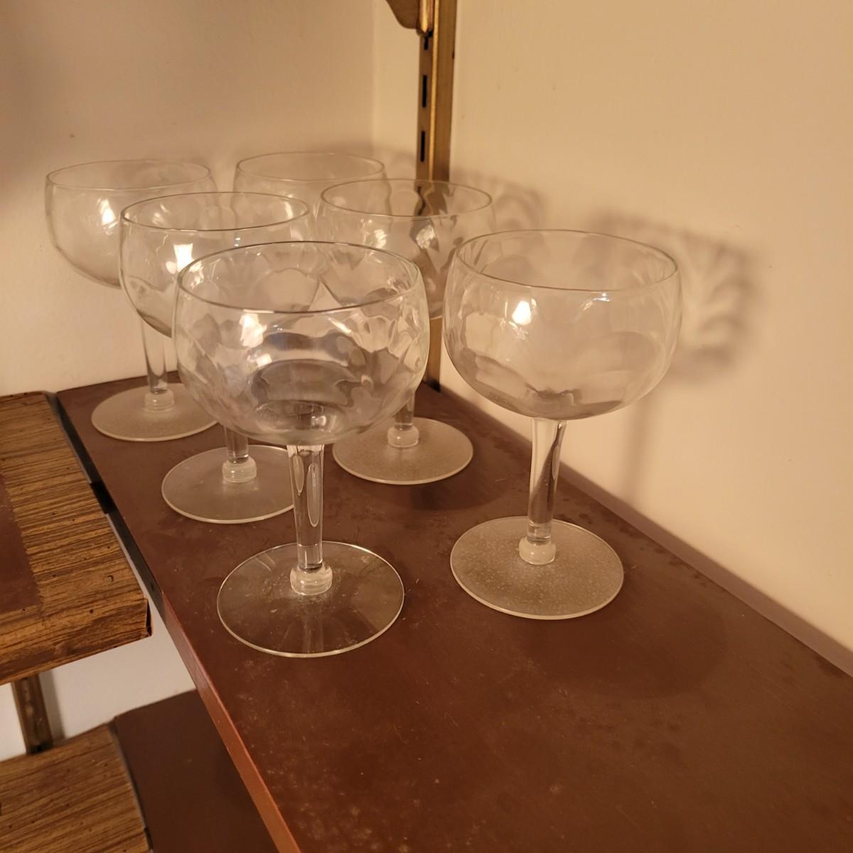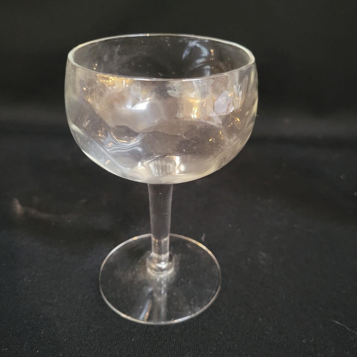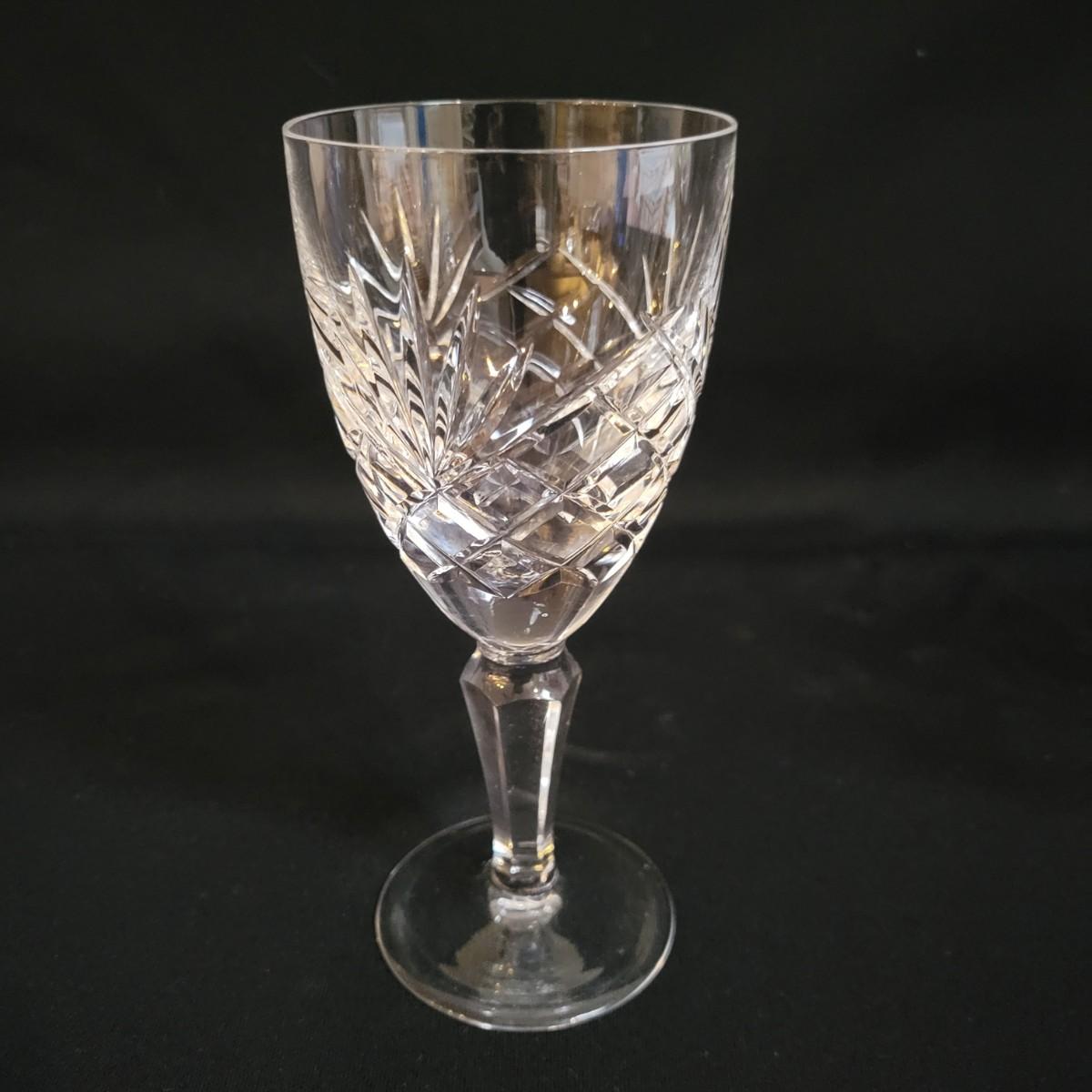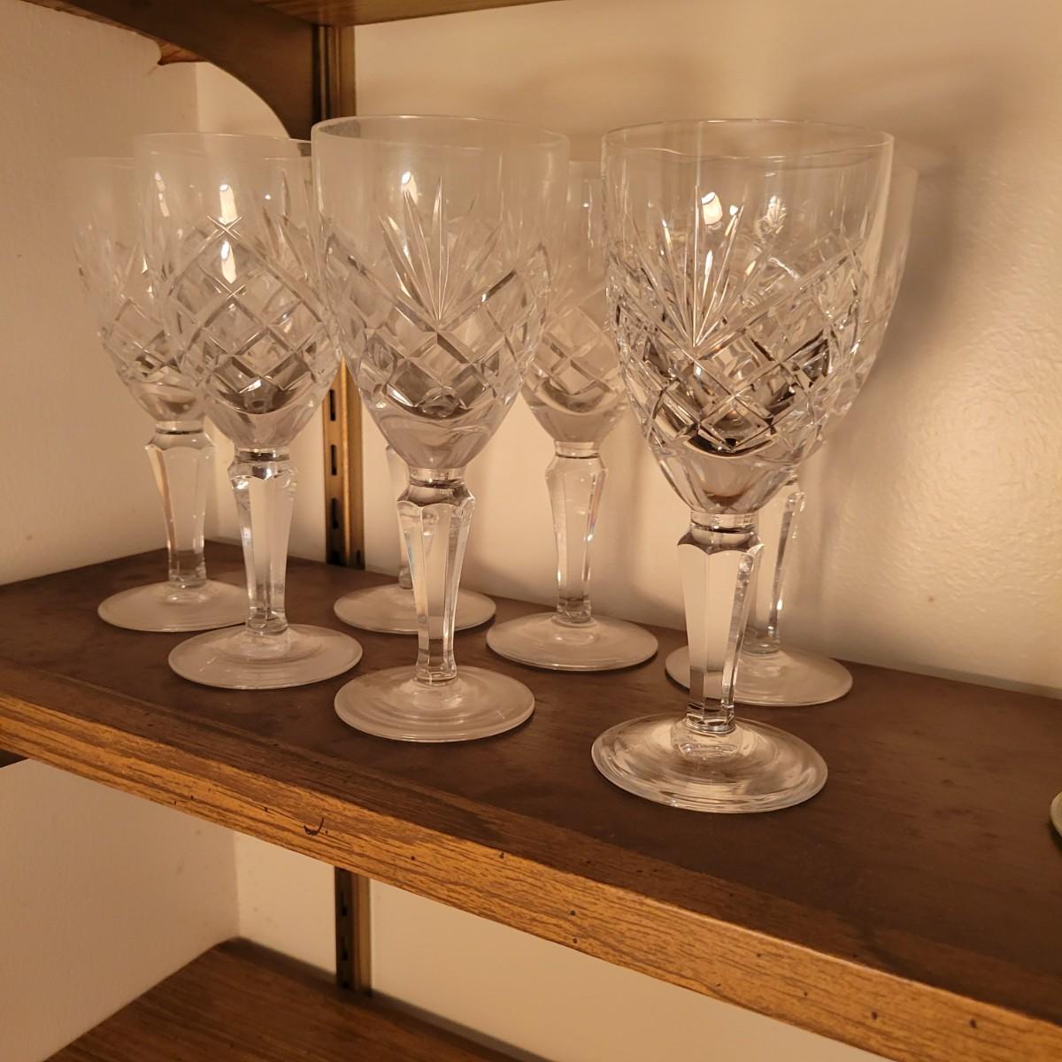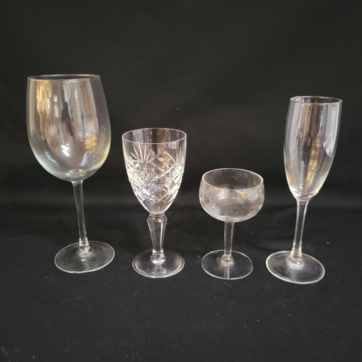 An assortment of glasses that includes eight wine glasses, eight champagne flutes, seven cut glass glasses and six cocktail glasses. The wine glasses measure approximately 3.5"D x 9"H. Shipping available