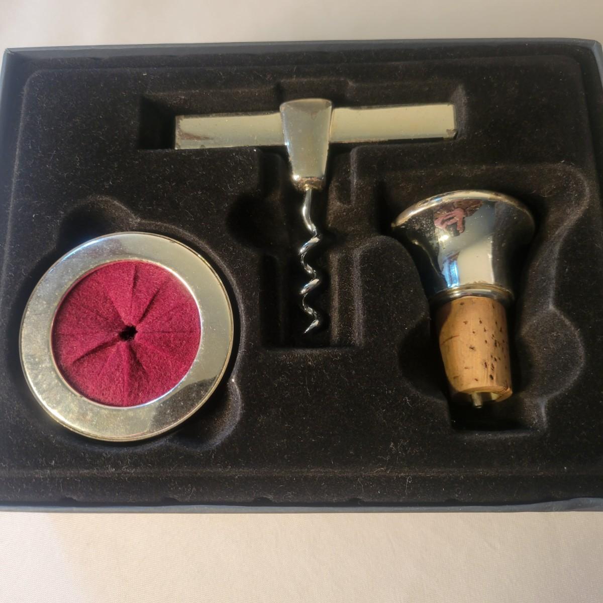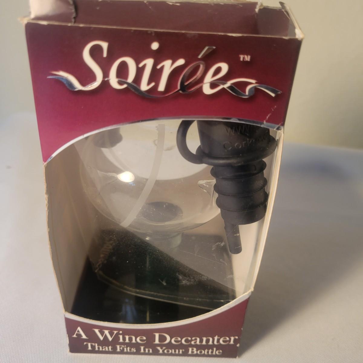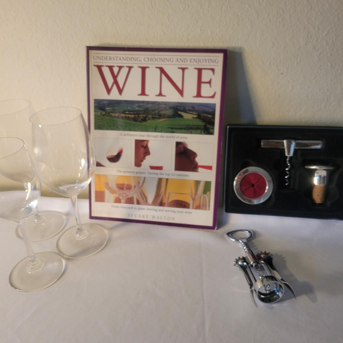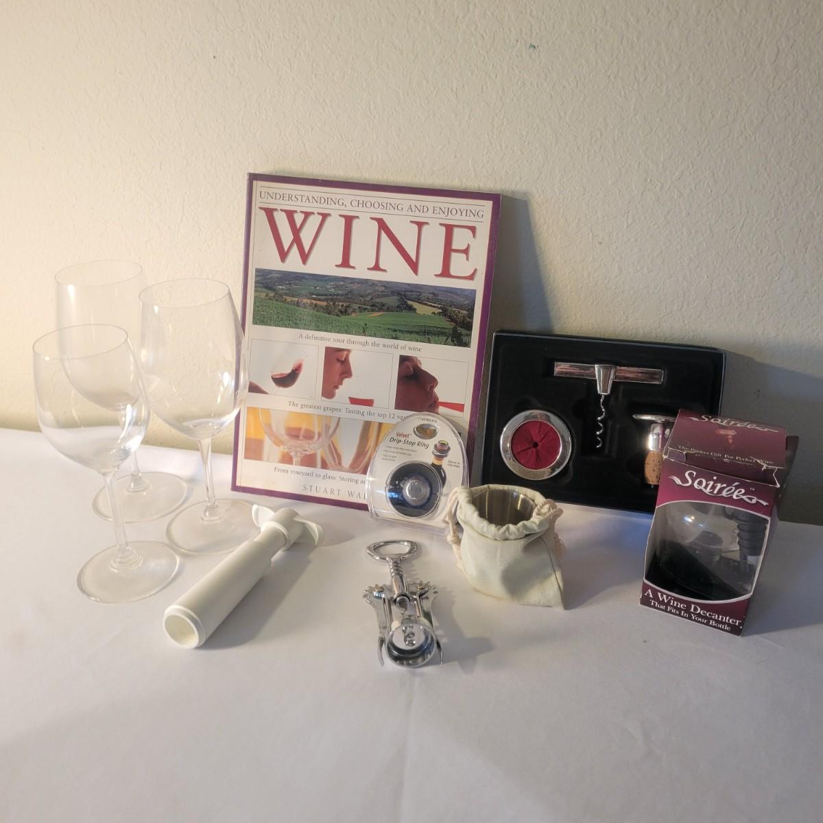An assortment of wine accessories in good condition with no notable damage. Included are three wine glasses, a book on wine, a Soiree decanter, a drip stop, opener and more. Shipping available. Shipping can be costly. We suggest calling our local UPS with dimensions and getting an estimate before bidding: (828) 252-6930