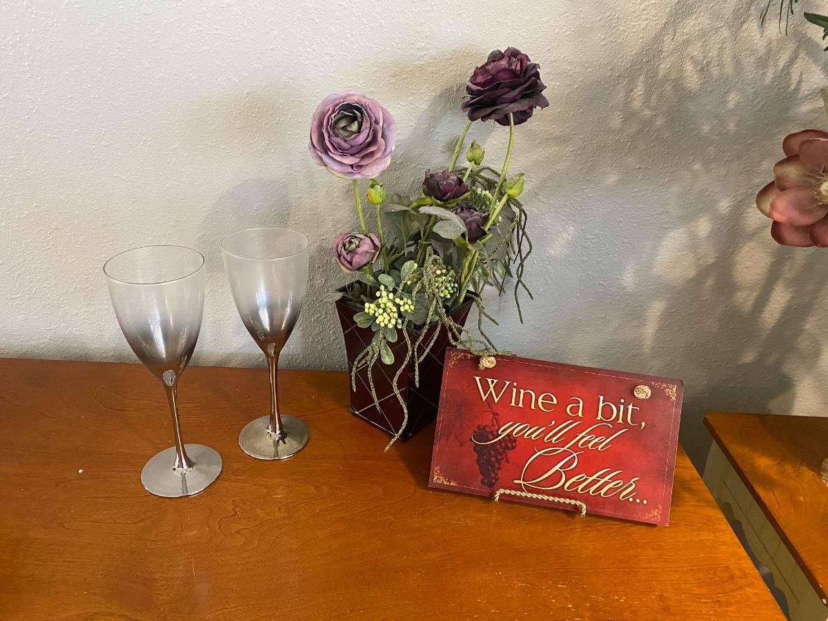 WINE GLASSES, WALL ART, AND SILK FLOWERS