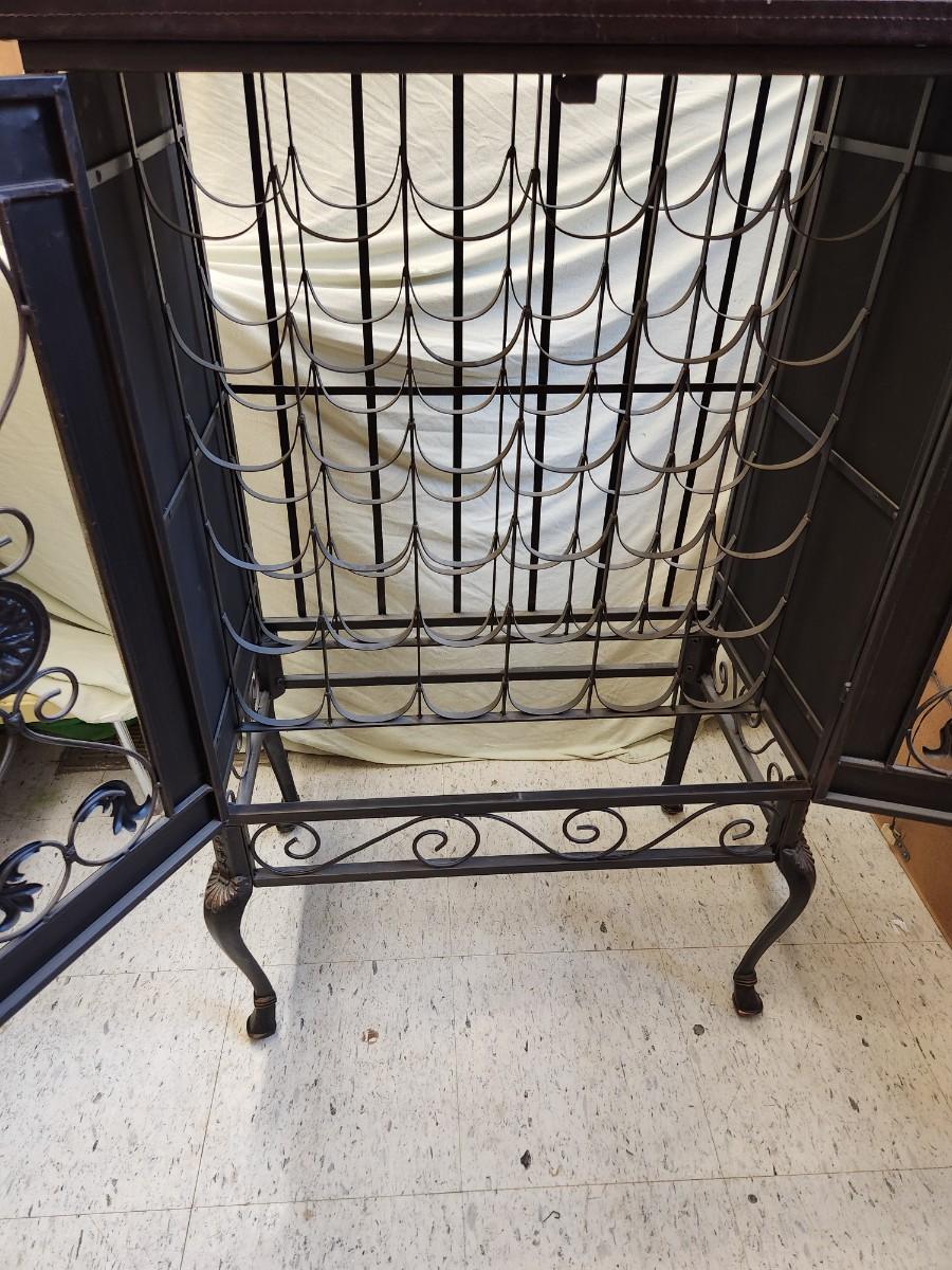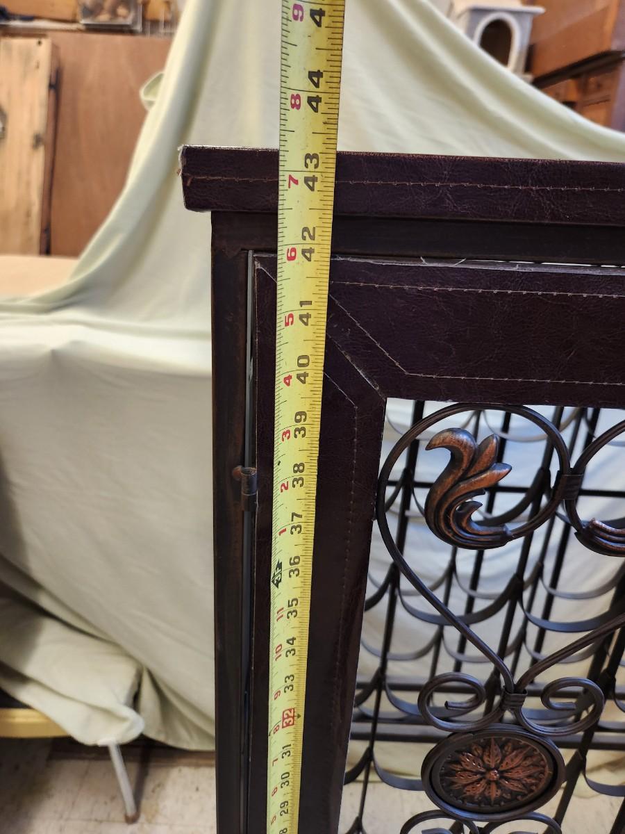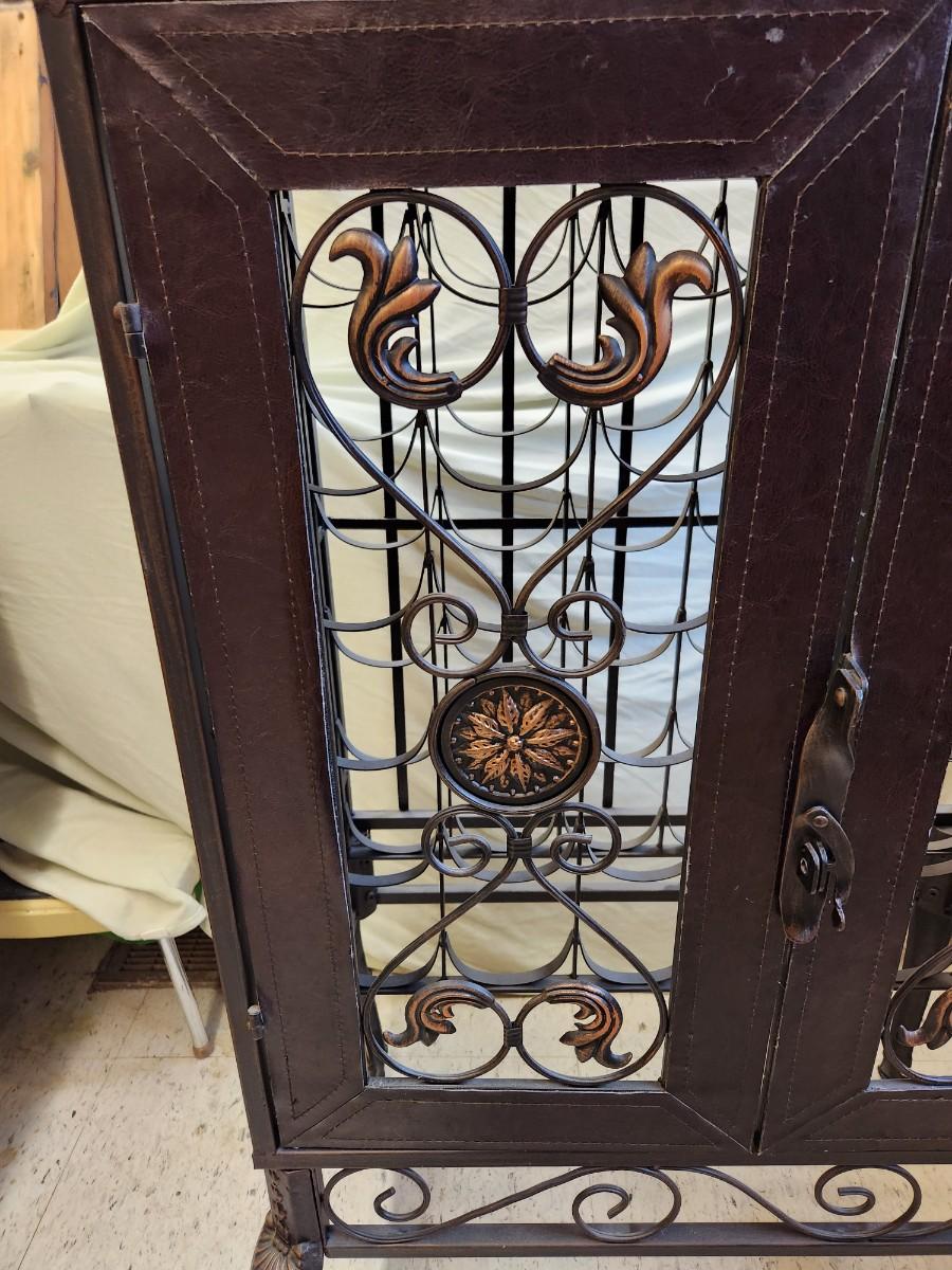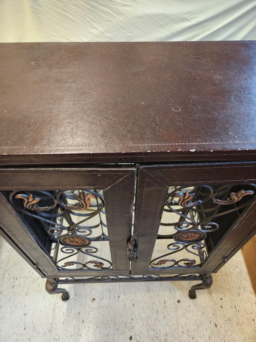 Metal, leather wrapped wine cabinet. Nice solid decorative piece