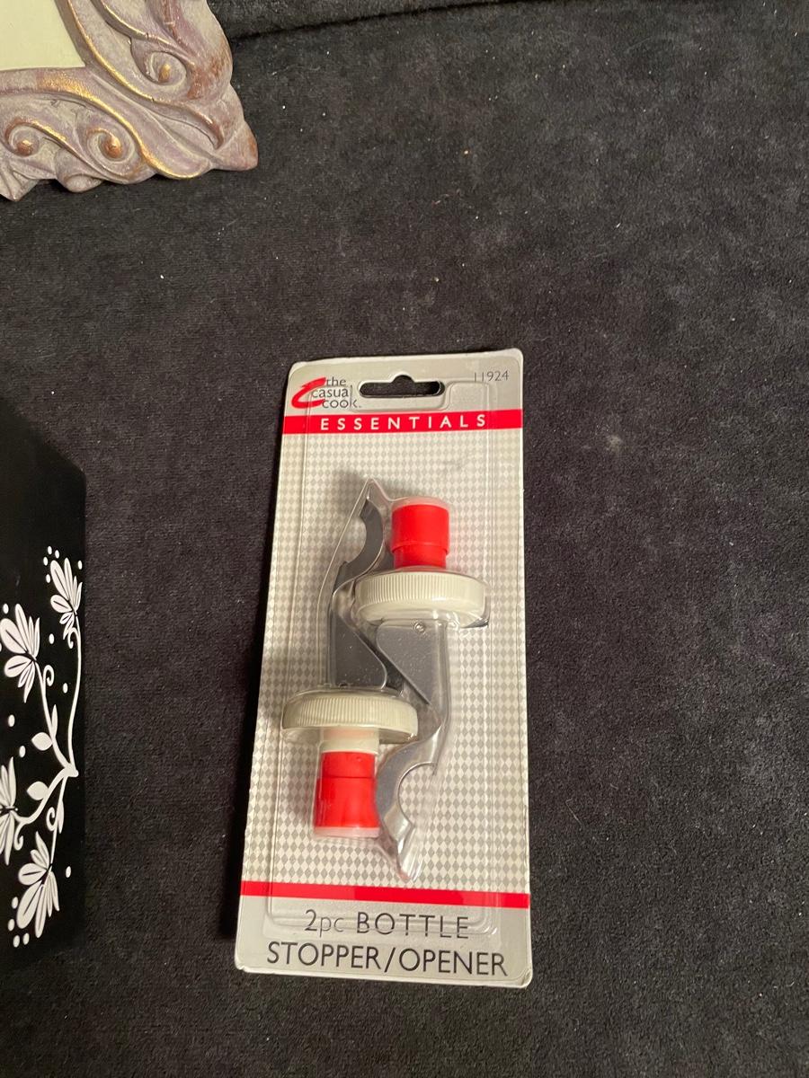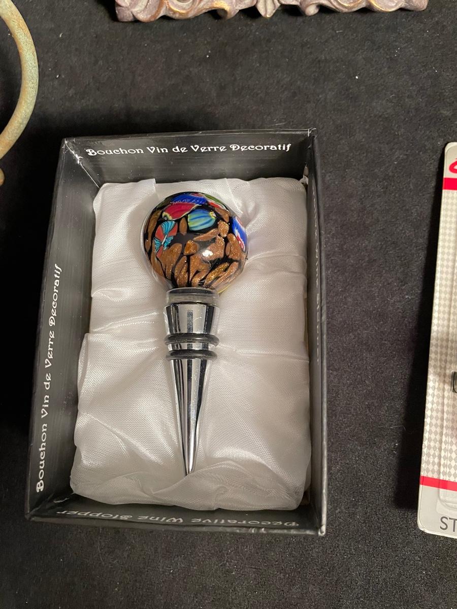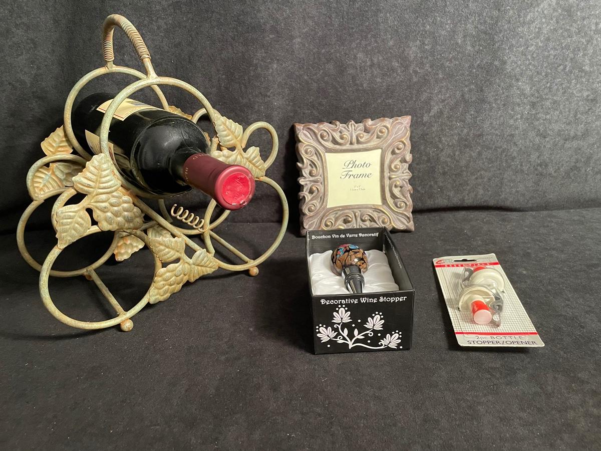 Metal wine rack that holds three bottles, plus small picture frame, fancy bottle stopper and pair of bottle pourers