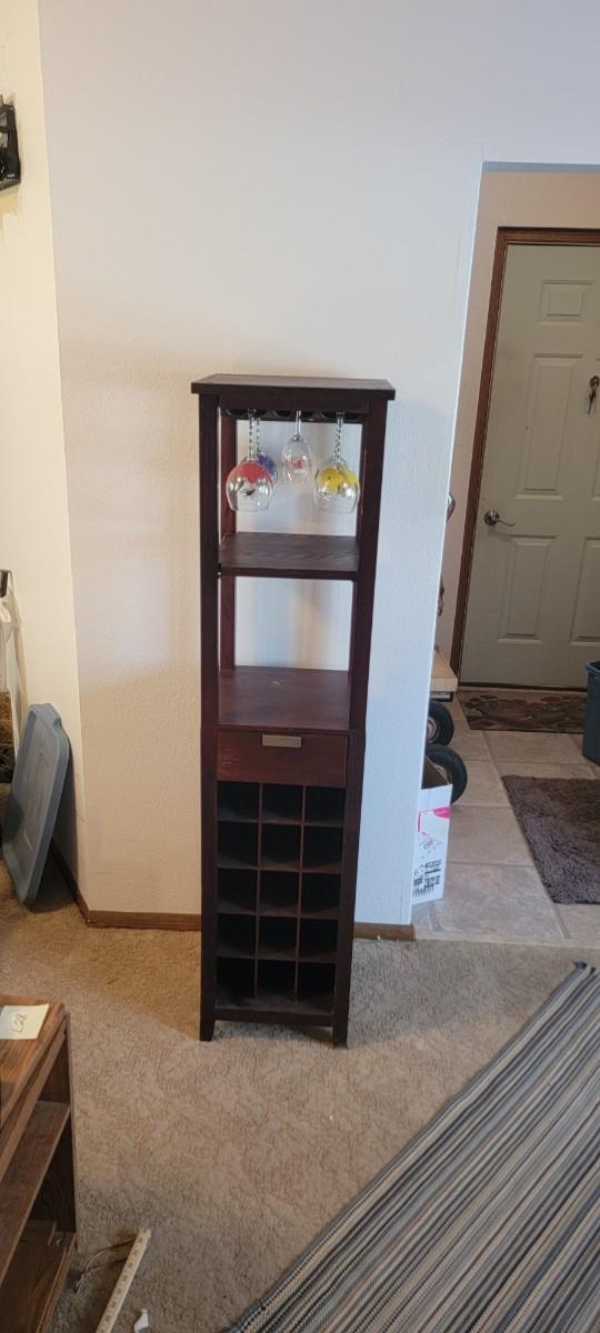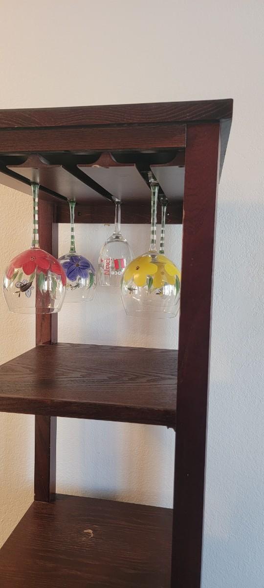 Wine rack with drawer, wine slots, glass holder abs shelf. Includes four beautiful painted wine glasses. Measures 14.5" W x 15.5" D, 62.5" H.