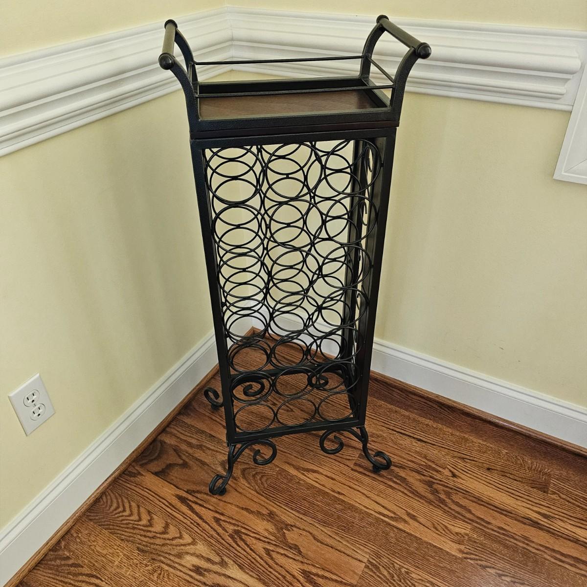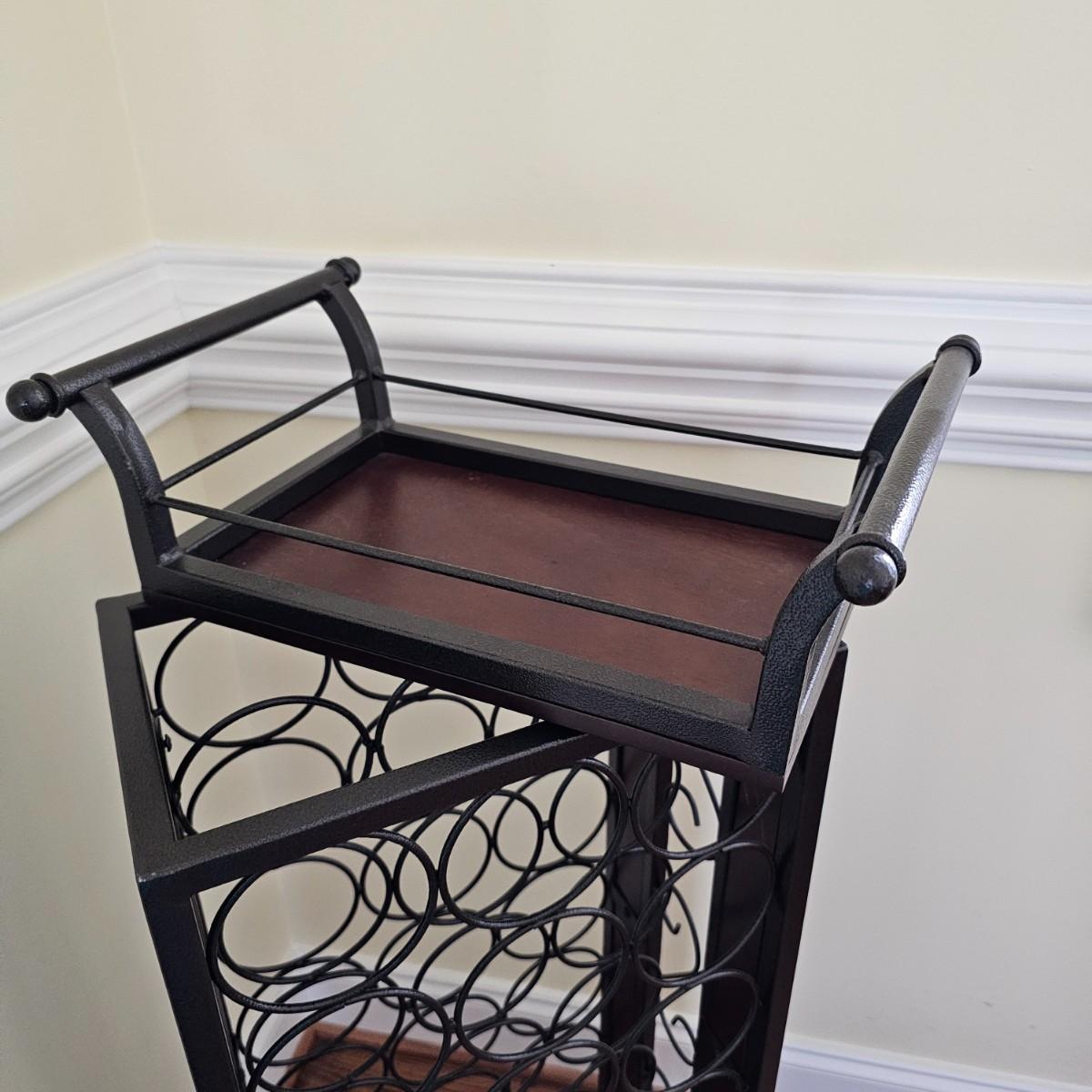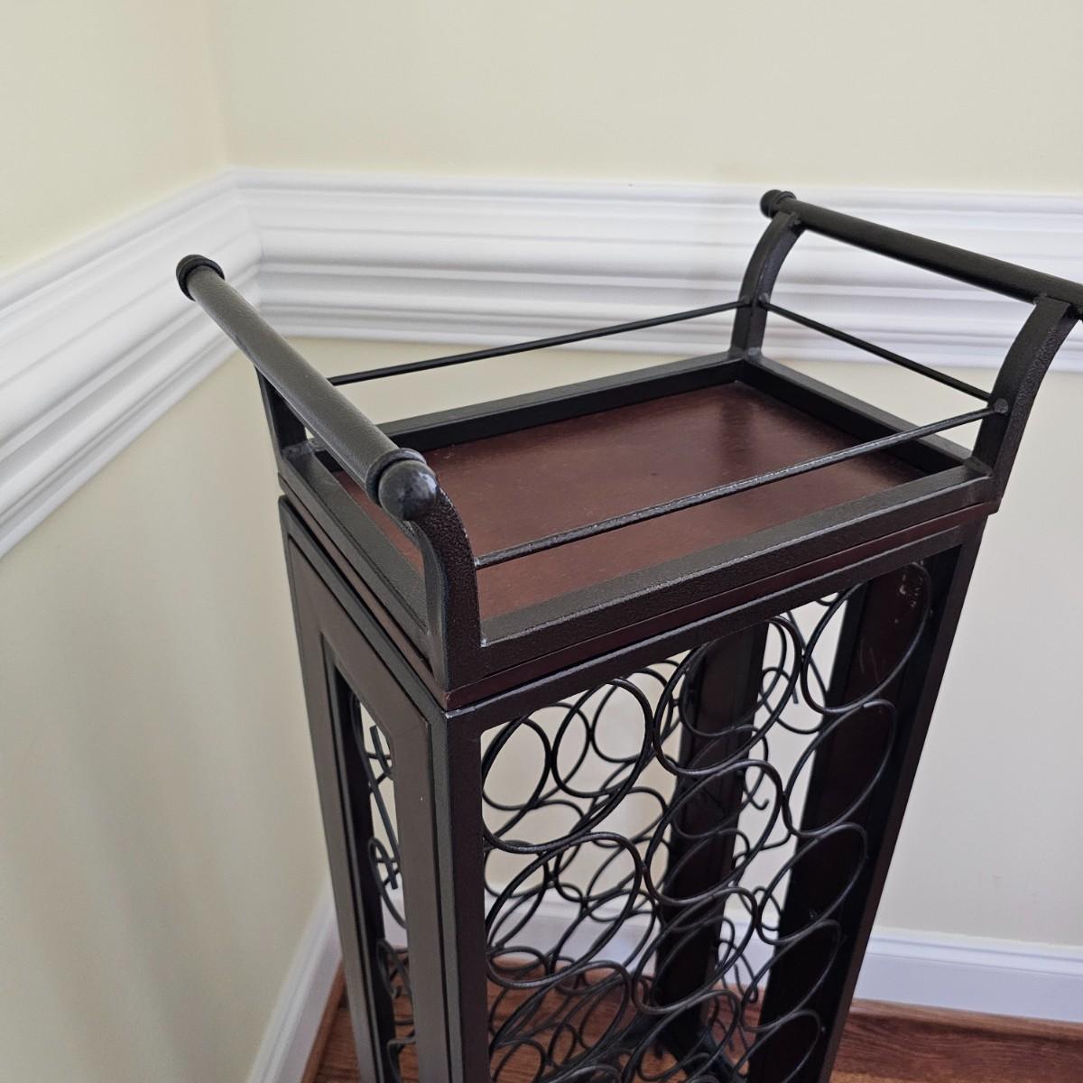 Metal and wood wine rack has removable serving/accessory tray at top. Iron with wood side inserts and tray bottom. Will hold 21 bottles. Slight scratches on one inside panel. See photos for details. Local pickup only.