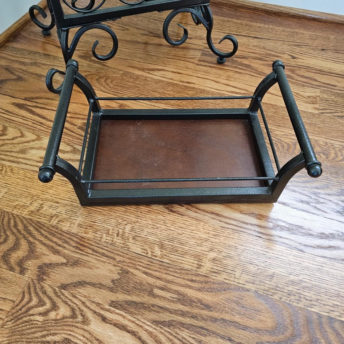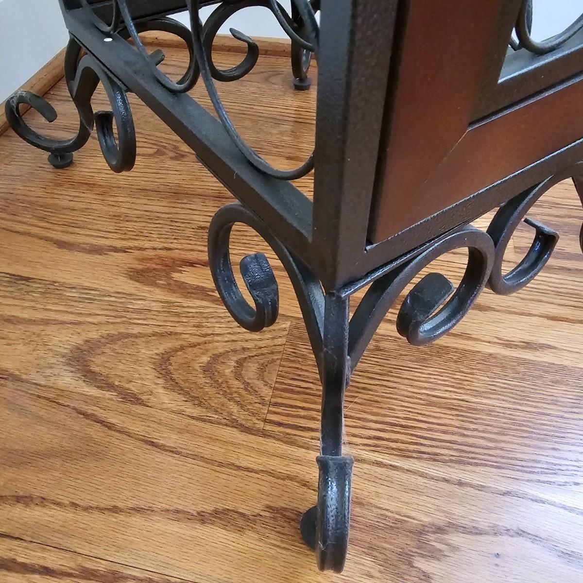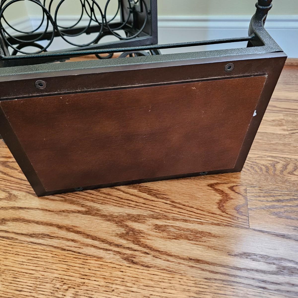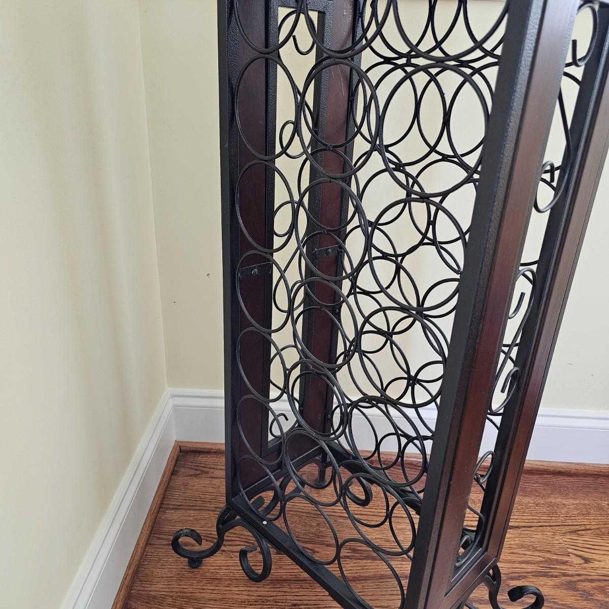 Metal and wood wine rack has removable serving/accessory tray at top. Iron with wood side inserts and tray bottom. Will hold 21 bottles. Slight scratches on one inside panel. See photos for details. Local pickup only.