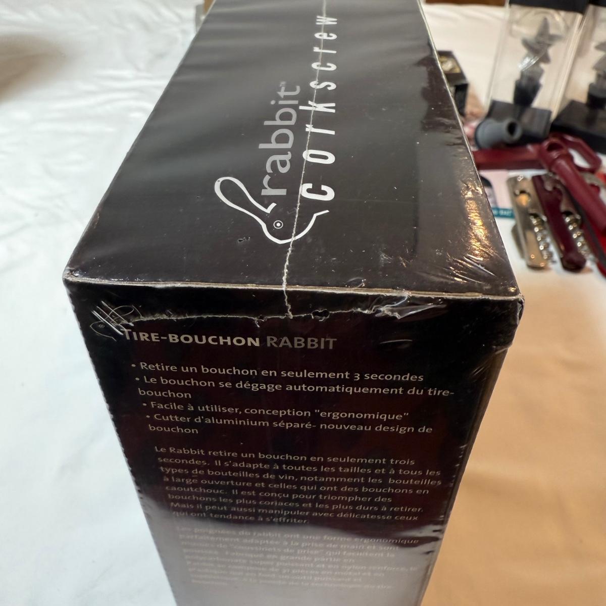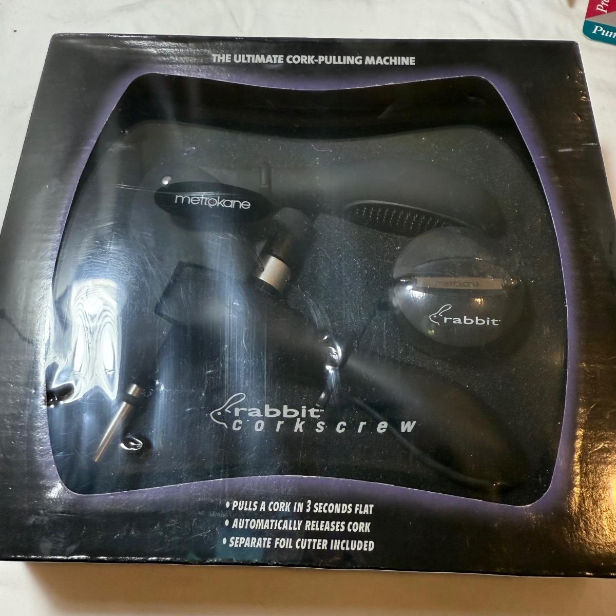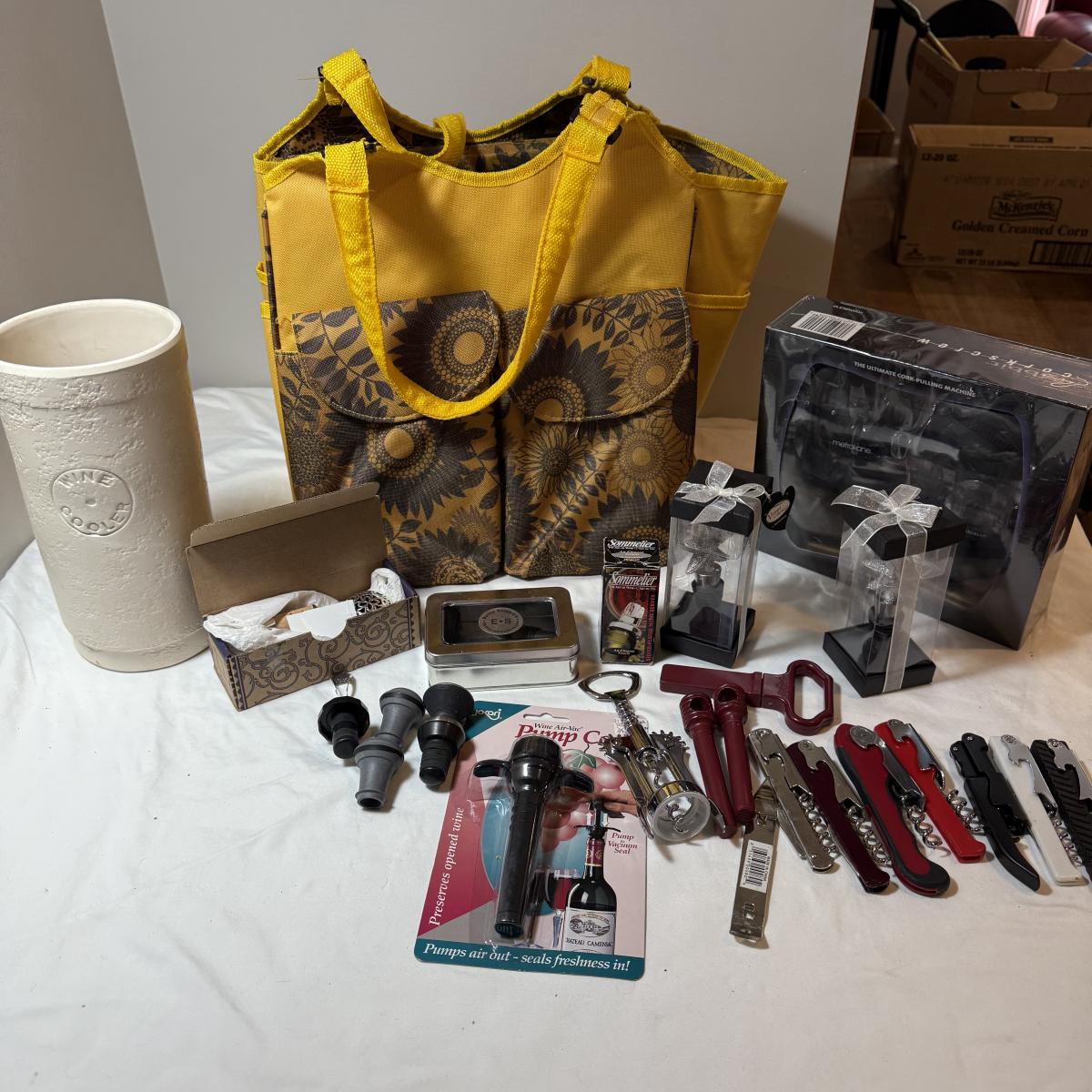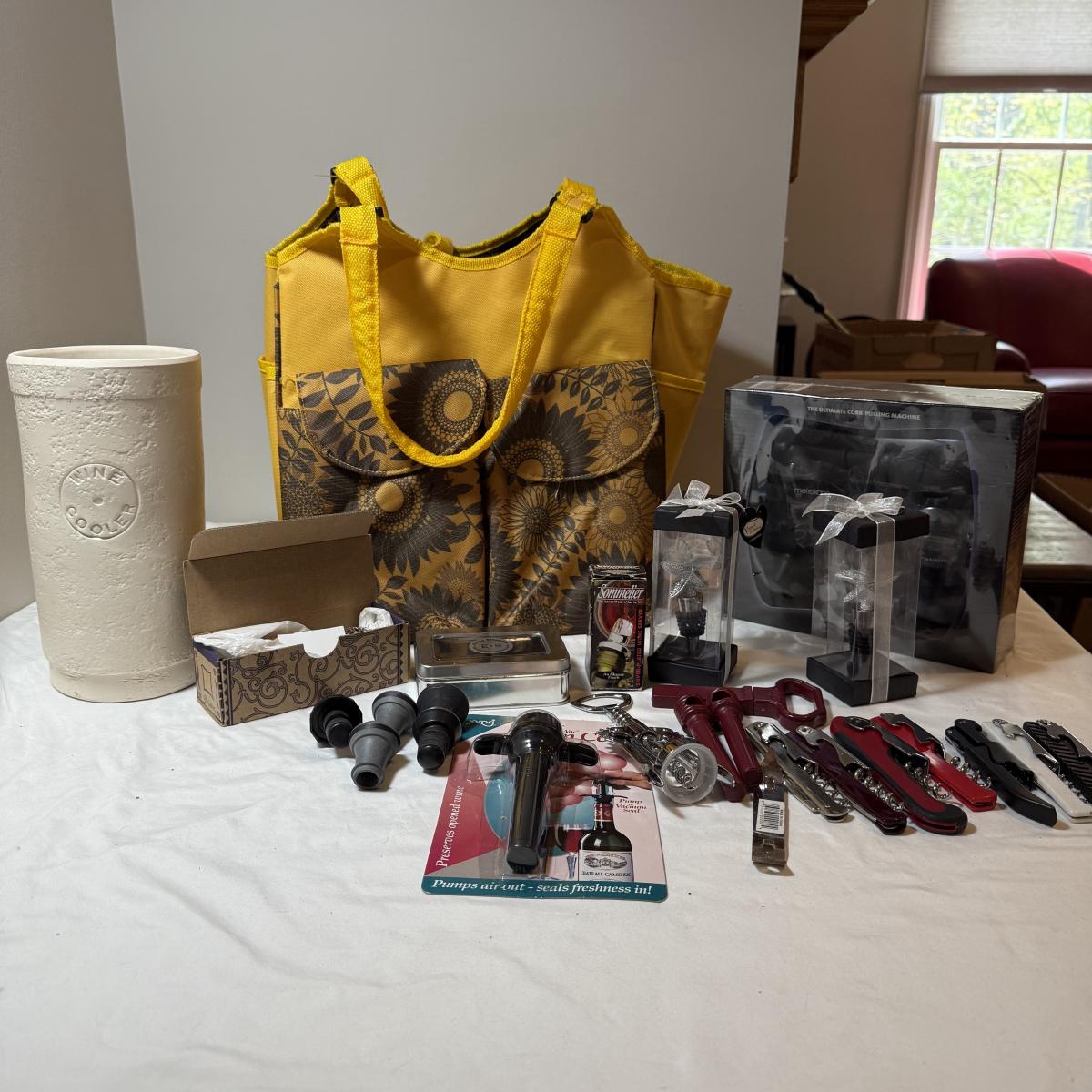 This lot contains all of your wine needs!! Included is a large day bag tote, a ceramic wine cooler, a NIB Rabbit corkscrew, three decorative wine stoppers, several more plain plastic wine stoppers, a wine air-vac pump, nine wine openers of various styles. The tote measures 13” x 8.5” x 12”H. See pictures for details. Shipping available.