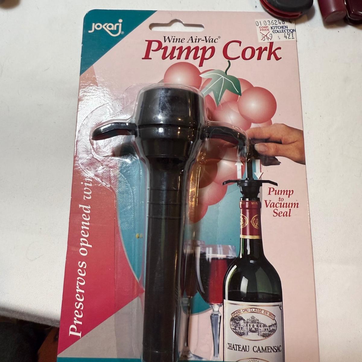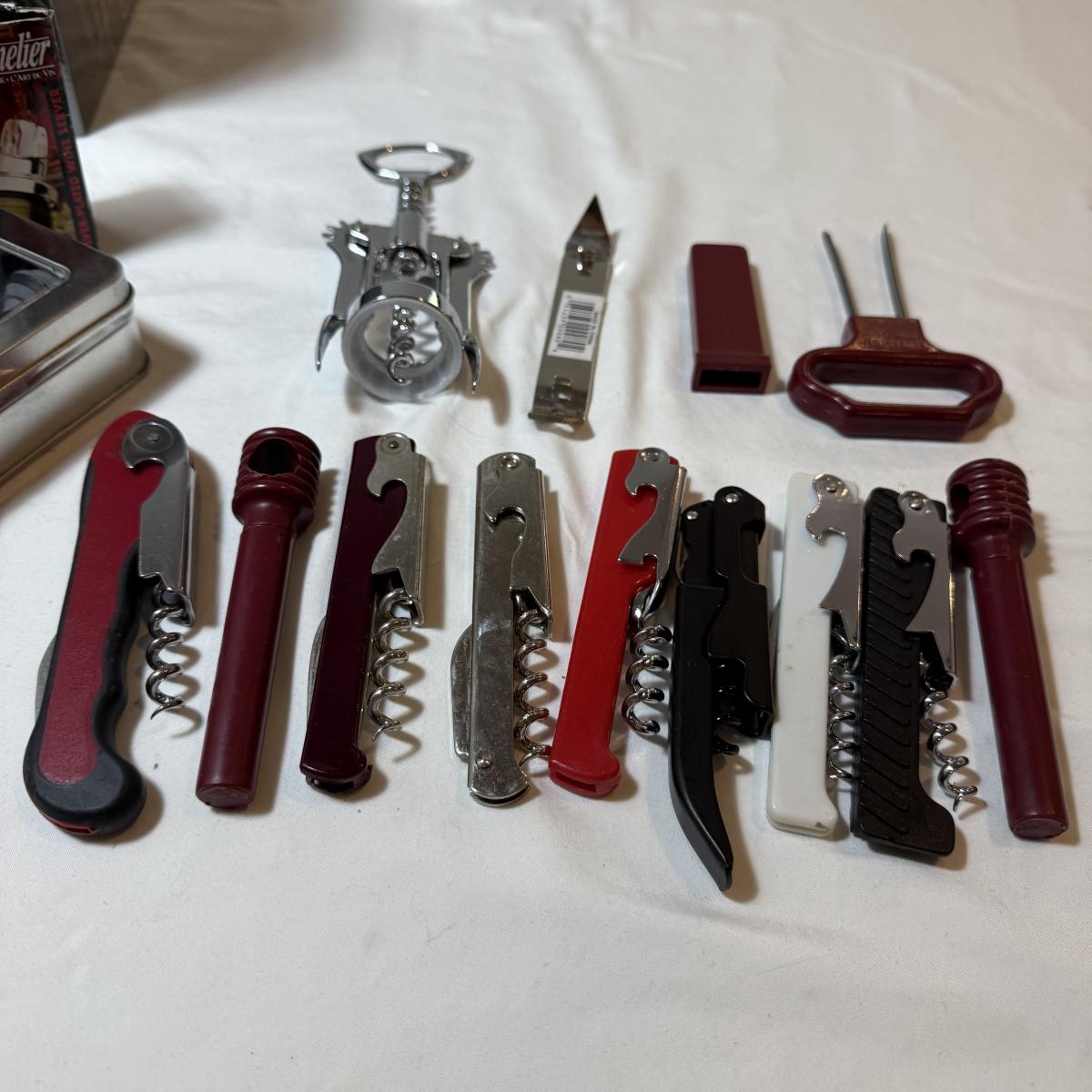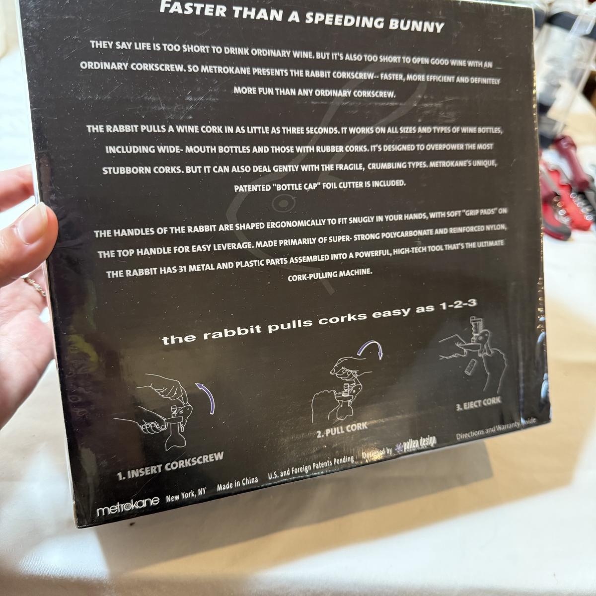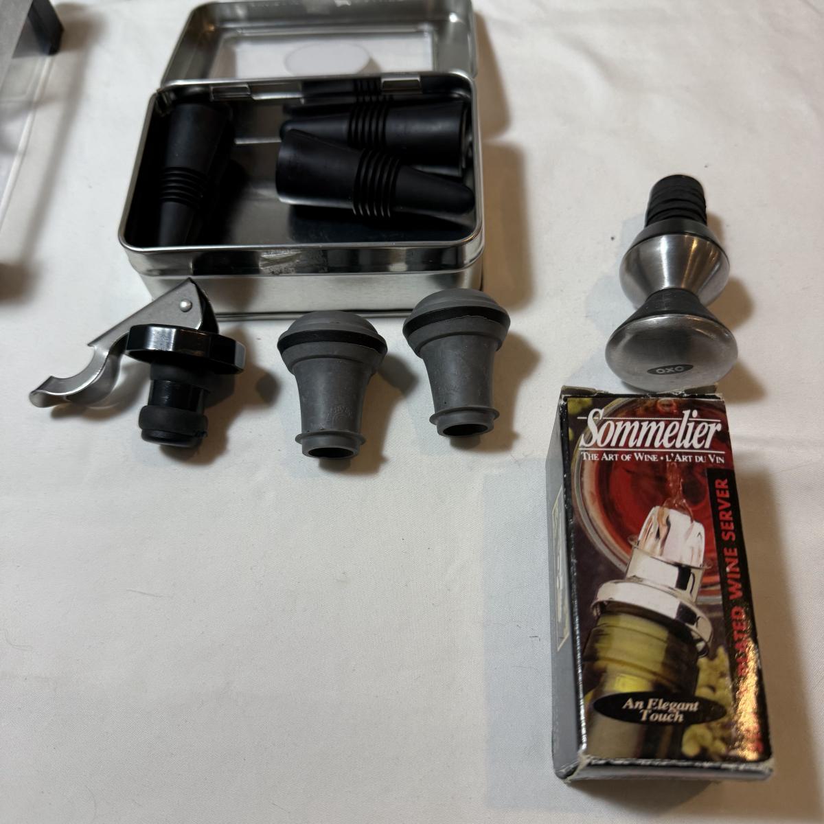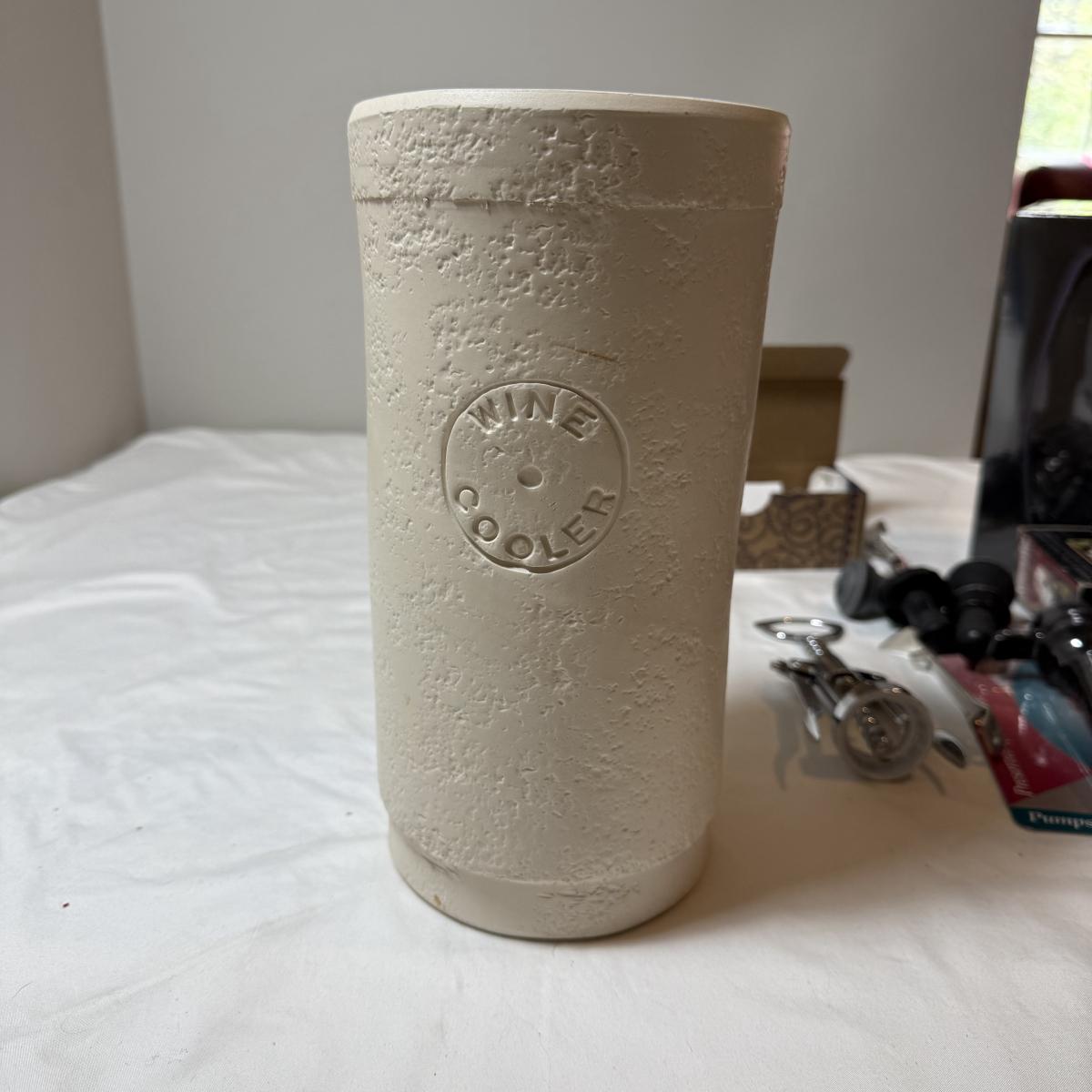 This lot contains all of your wine needs!! Included is a large day bag tote, a ceramic wine cooler, a NIB Rabbit corkscrew, three decorative wine stoppers, several more plain plastic wine stoppers, a wine air-vac pump, nine wine openers of various styles. The tote measures 13” x 8.5” x 12”H. See pictures for details. Shipping available.