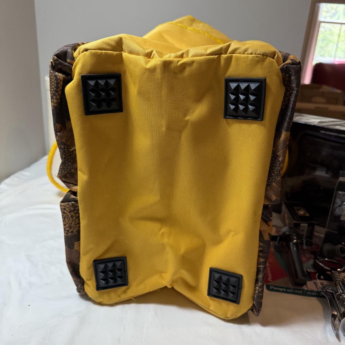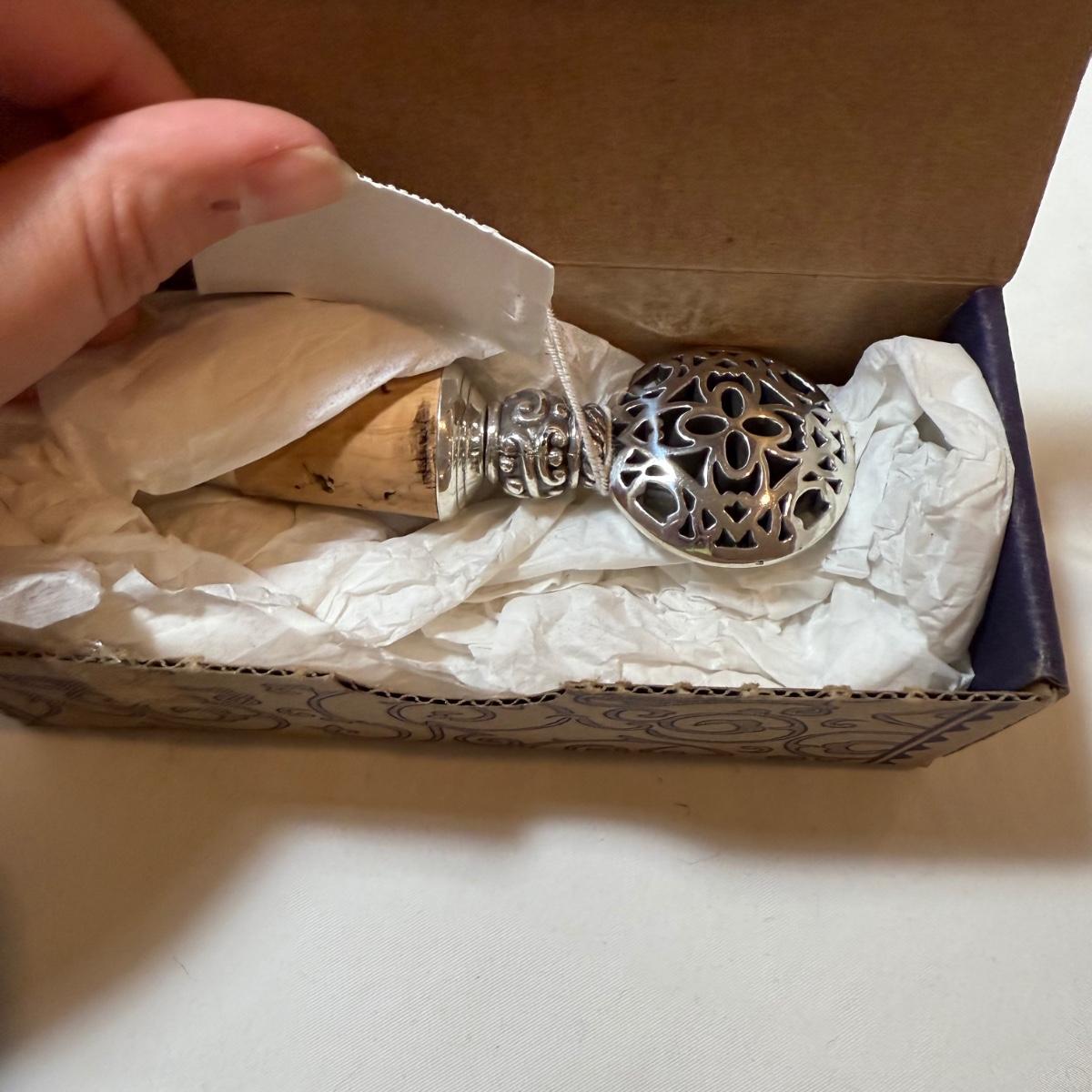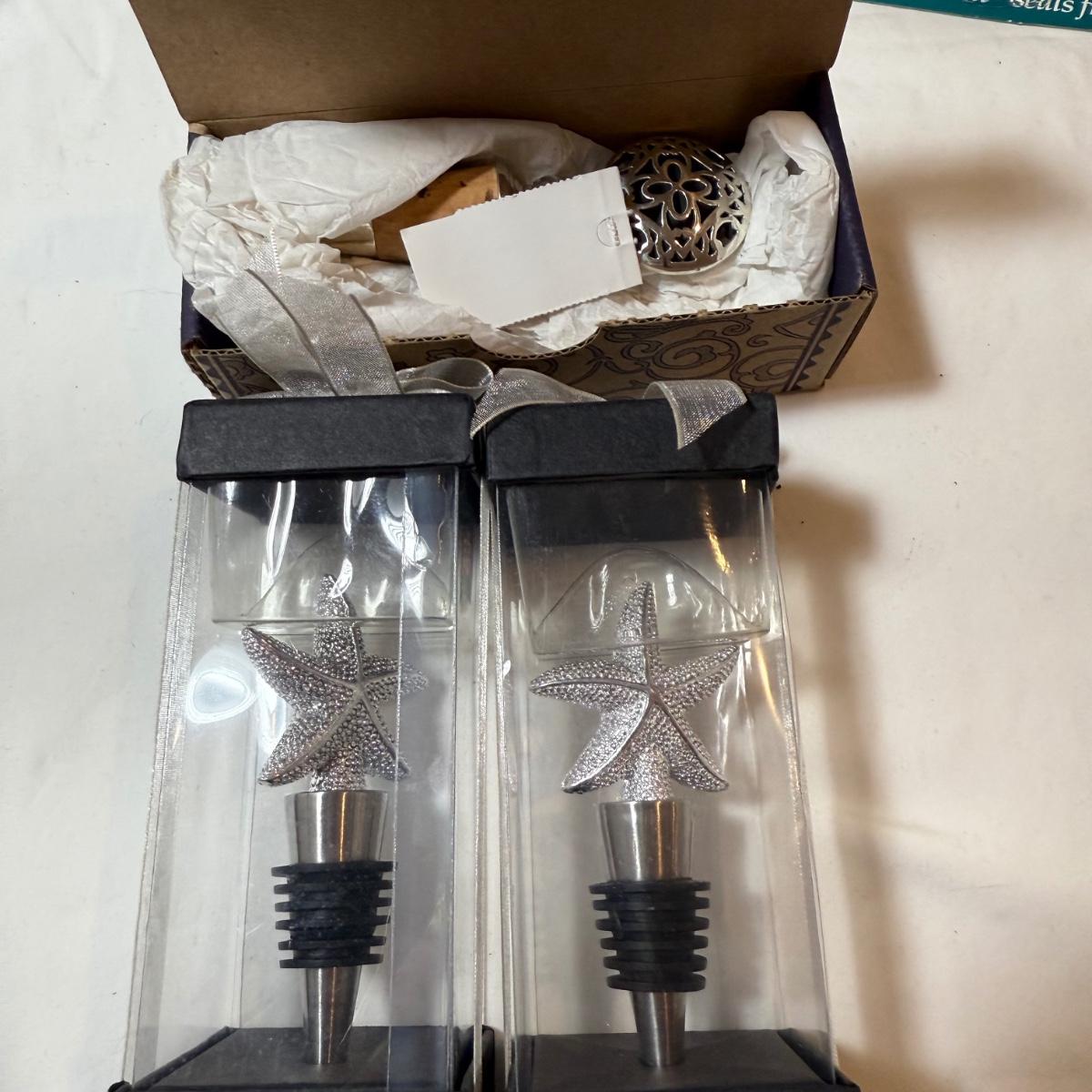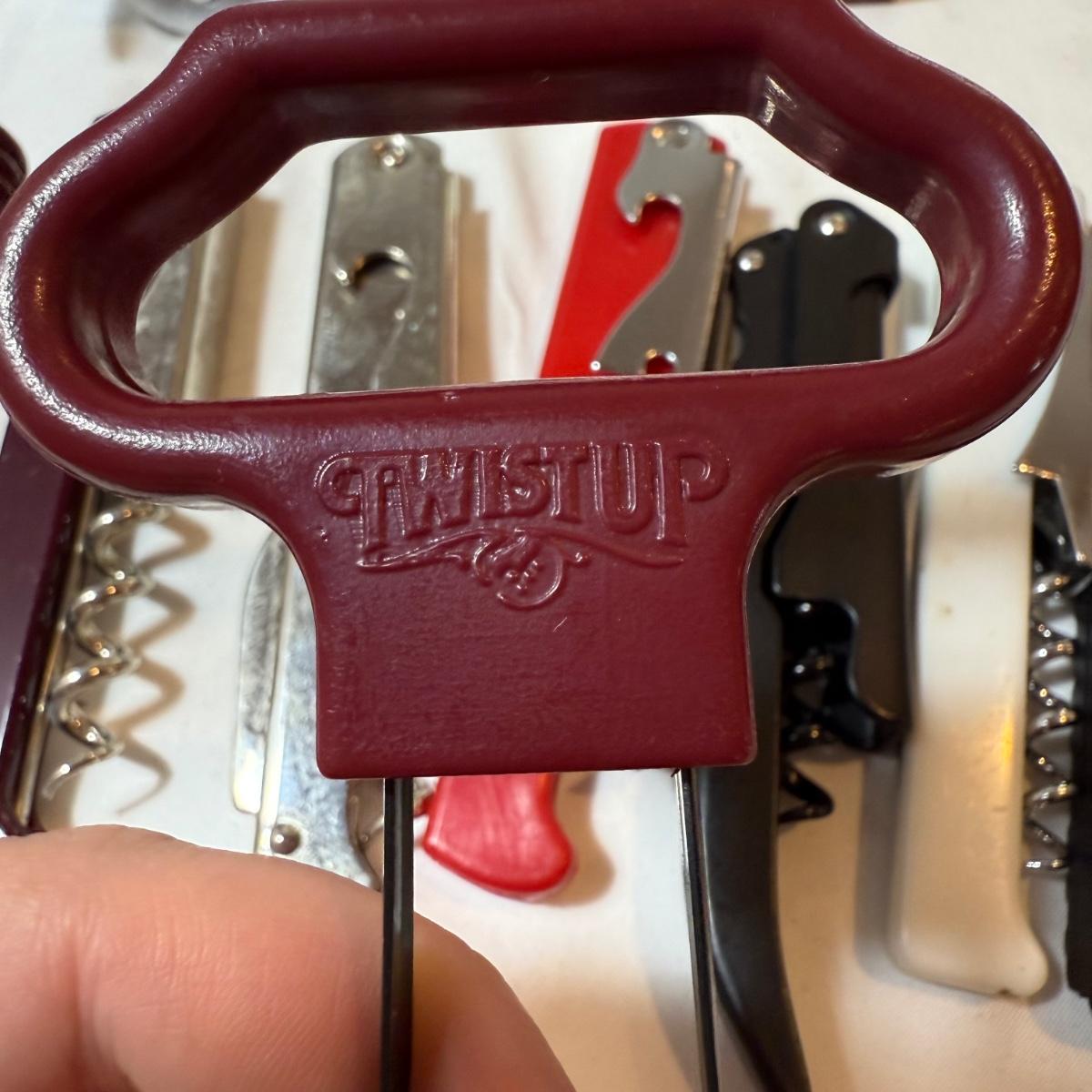 This lot contains all of your wine needs!! Included is a large day bag tote, a ceramic wine cooler, a NIB Rabbit corkscrew, three decorative wine stoppers, several more plain plastic wine stoppers, a wine air-vac pump, nine wine openers of various styles. The tote measures 13” x 8.5” x 12”H. See pictures for details. Shipping available.
