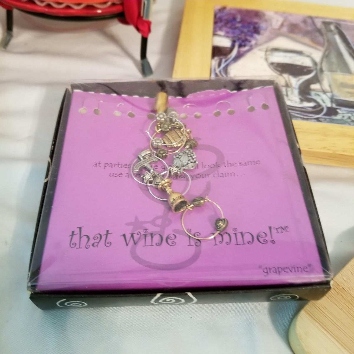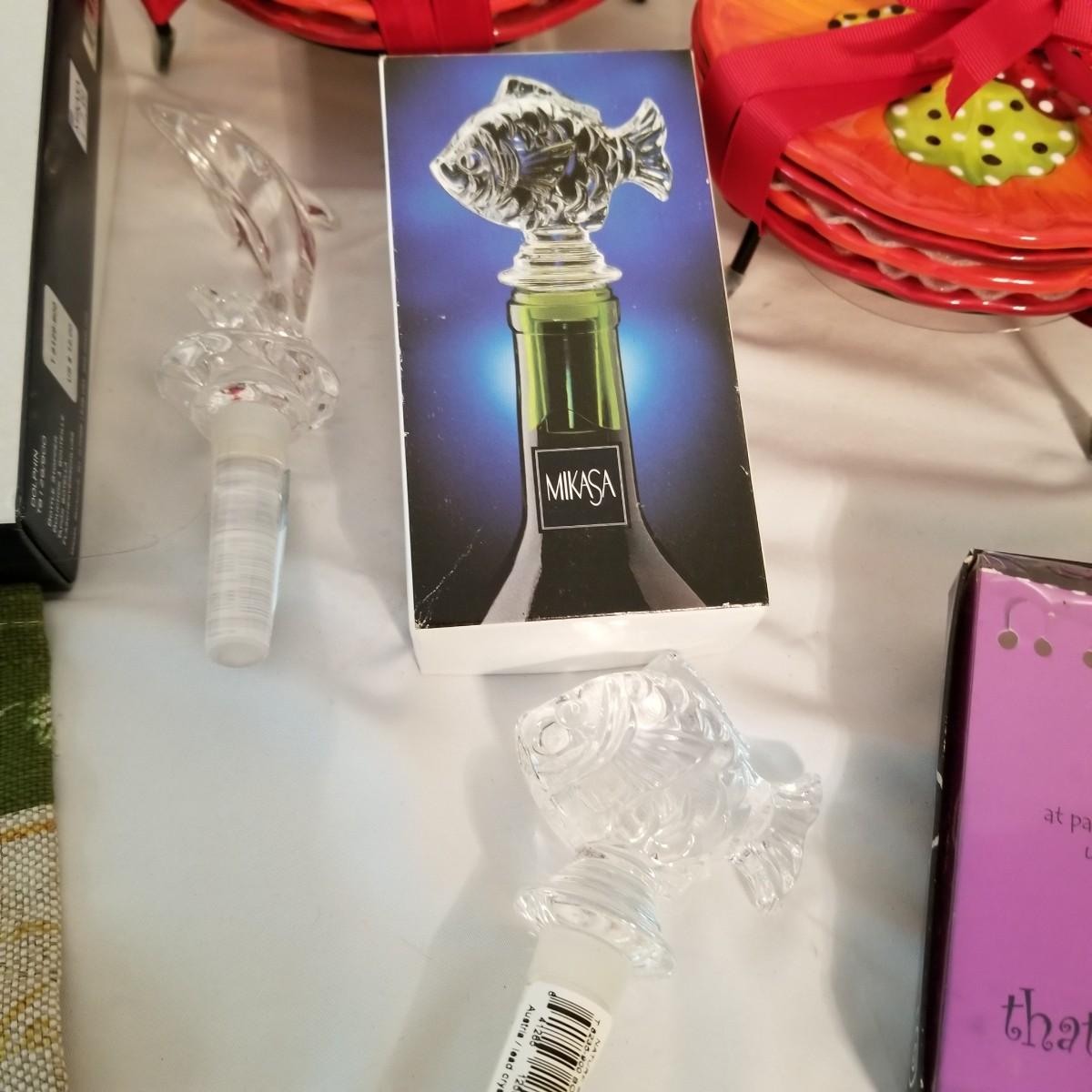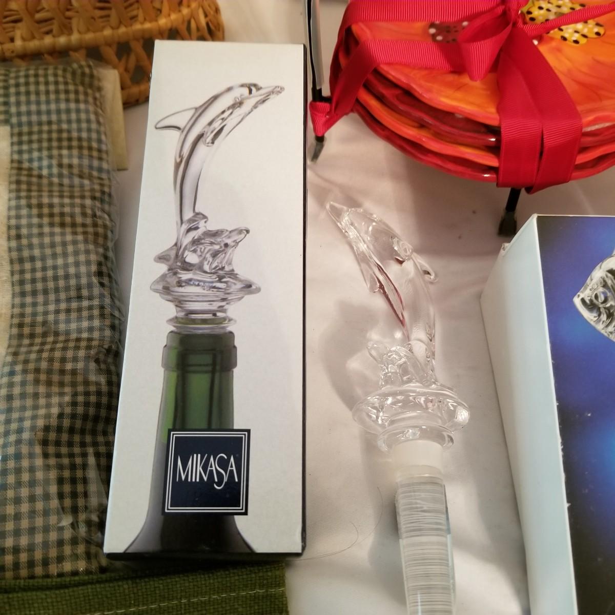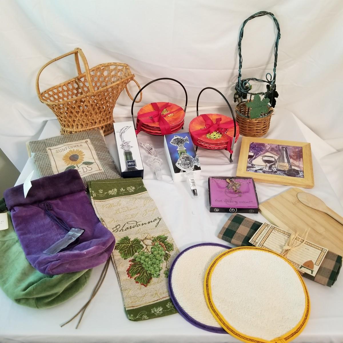 Everything wine! Wicker pouring basket, wicker/metal bottle holder, wine charms, cutting board, etc. Two Mikasa crystal bottle stoppers, hot pads, a towel. Two velvet wine gift bags. And two four-piece sets of Laurie Gates plates and holders. Local pickup only.