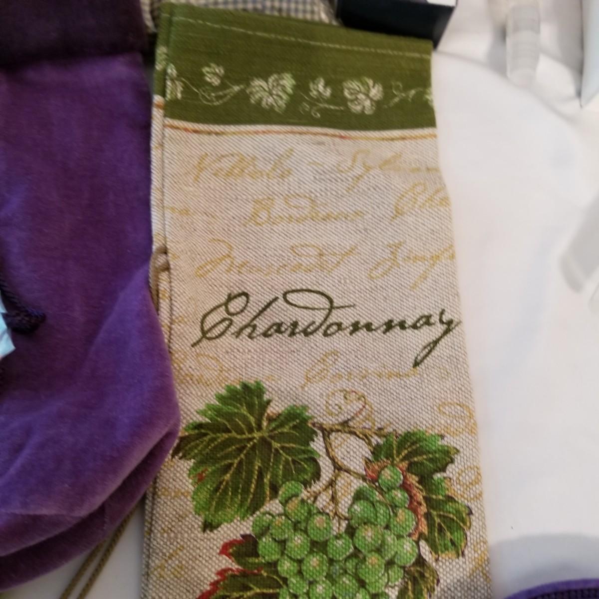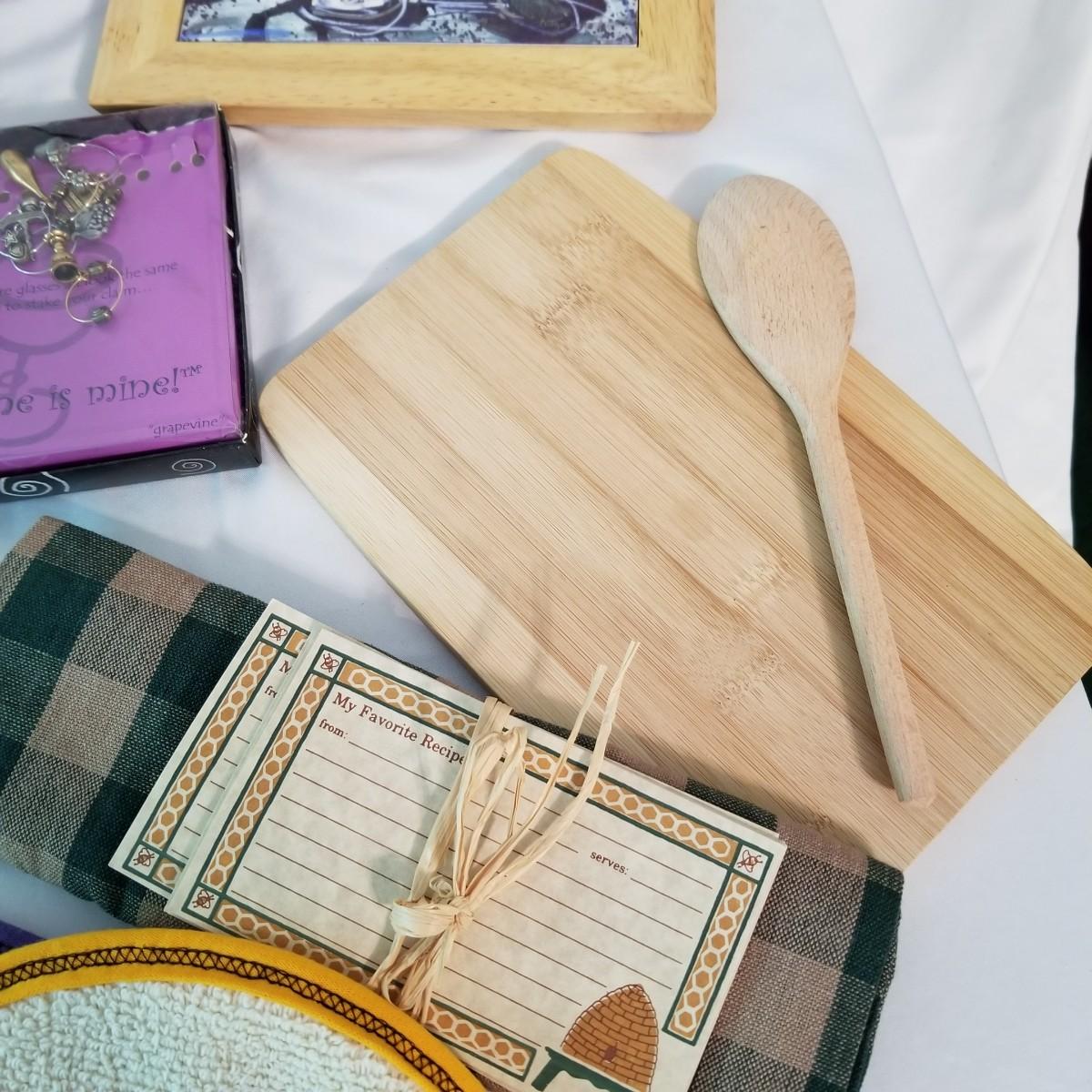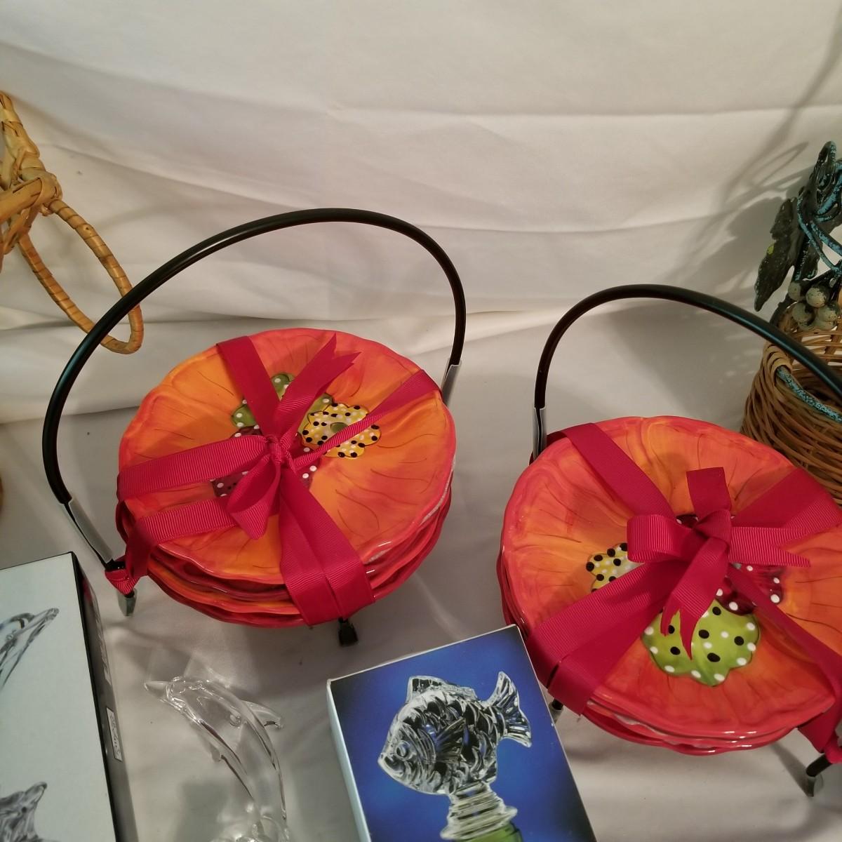 Everything wine! Wicker pouring basket, wicker/metal bottle holder, wine charms, cutting board, etc. Two Mikasa crystal bottle stoppers, hot pads, a towel. Two velvet wine gift bags. And two four-piece sets of Laurie Gates plates and holders. Local pickup only.