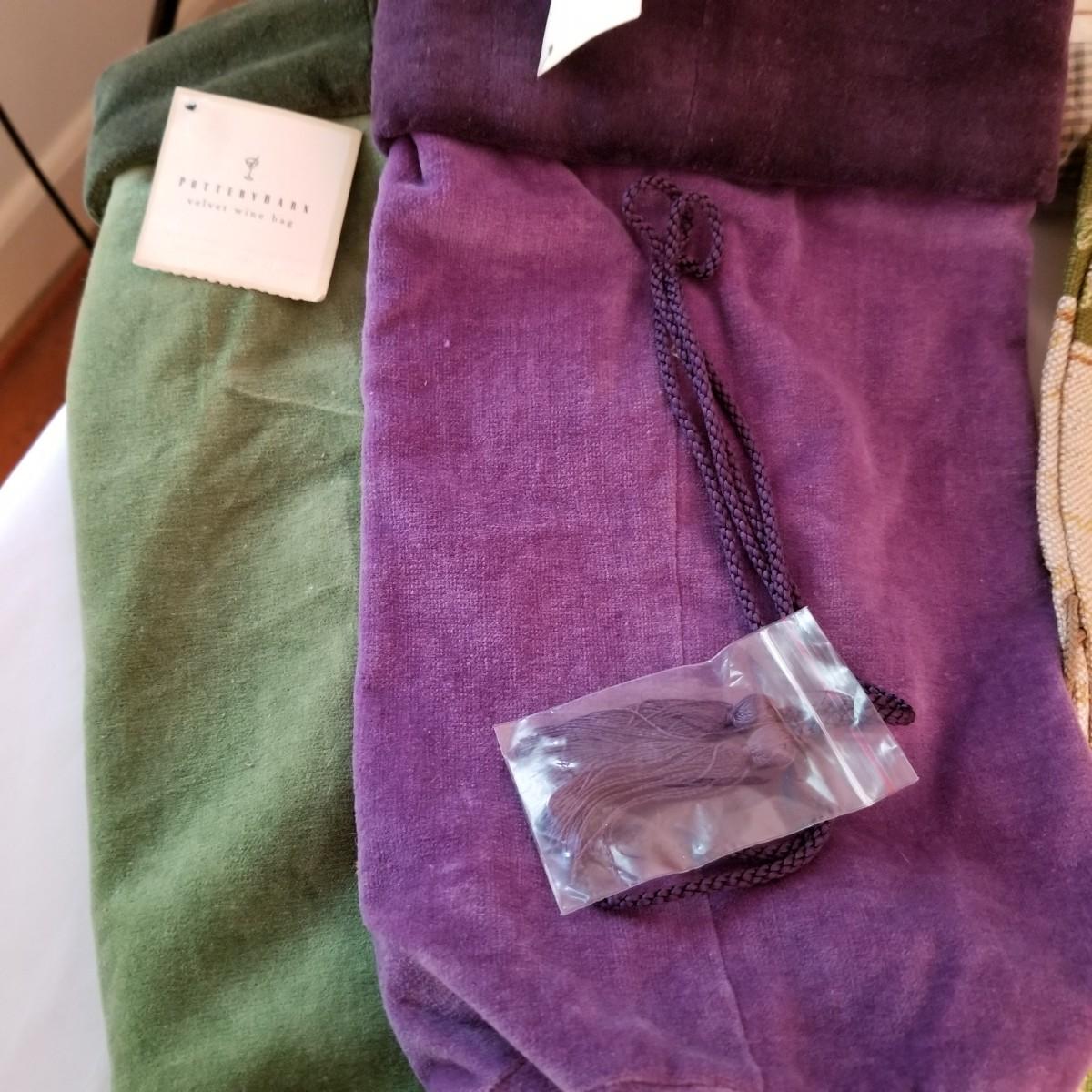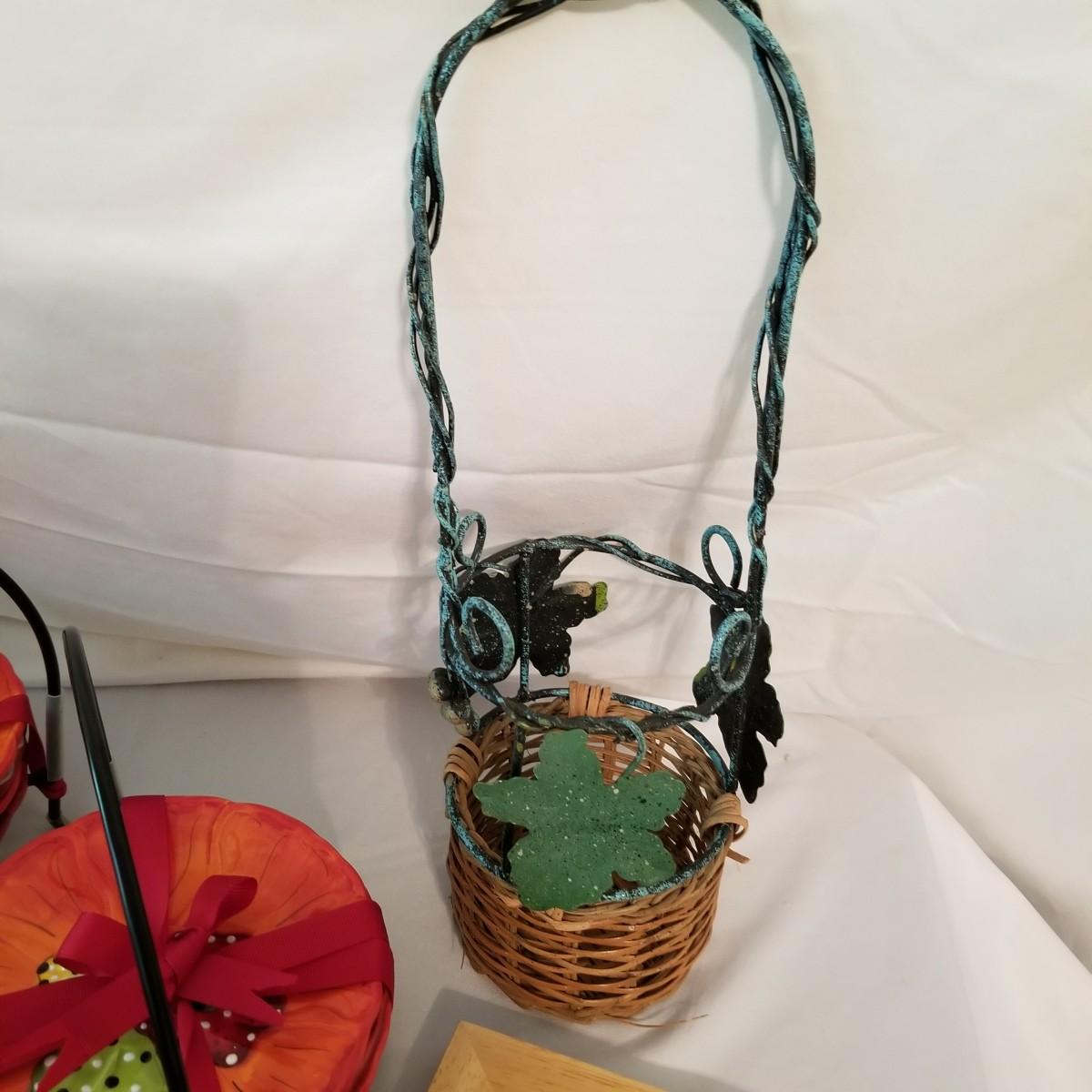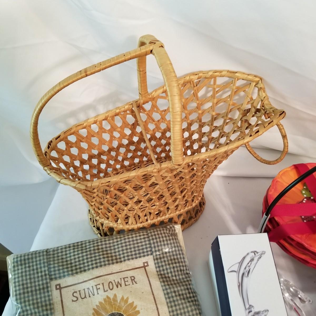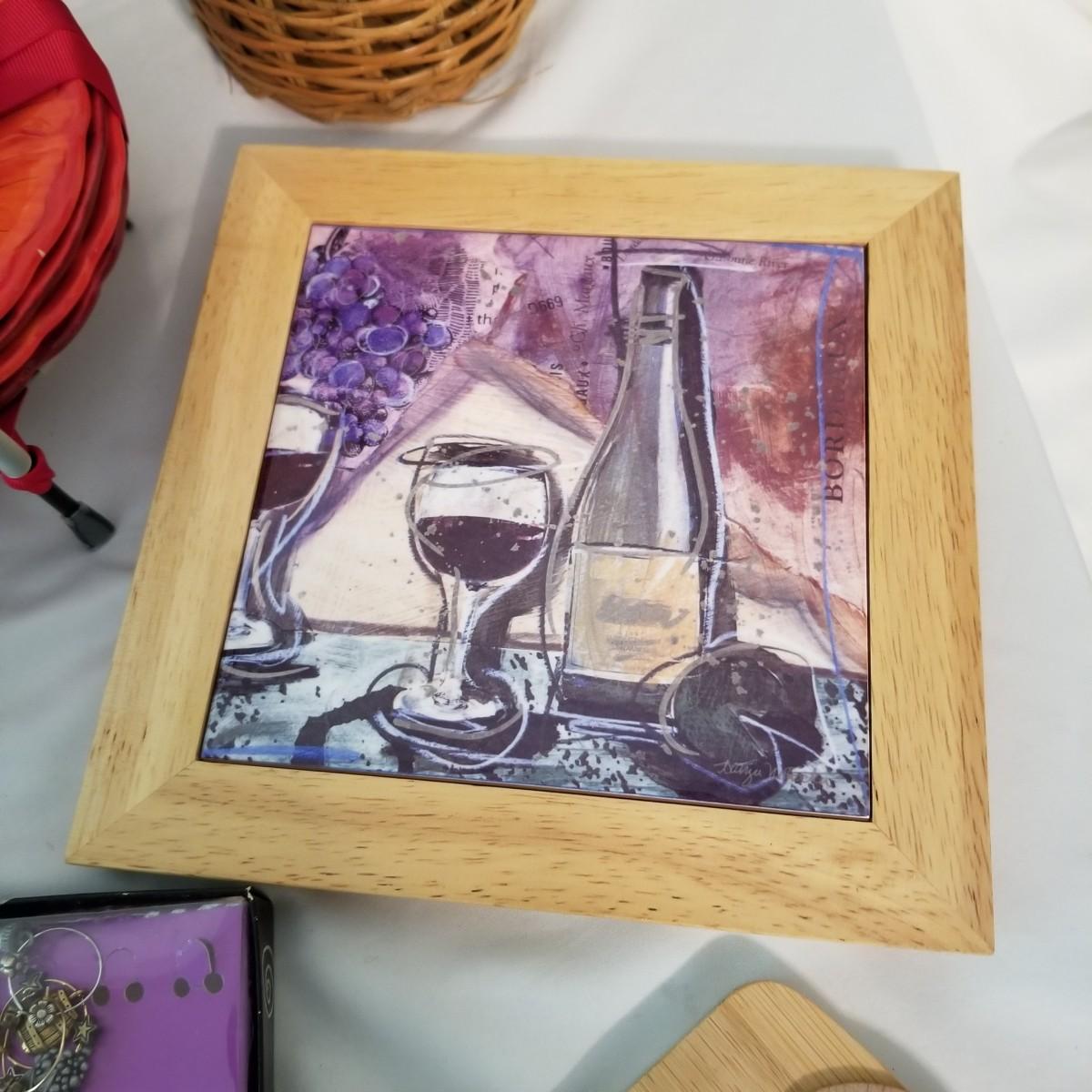 Everything wine! Wicker pouring basket, wicker/metal bottle holder, wine charms, cutting board, etc. Two Mikasa crystal bottle stoppers, hot pads, a towel. Two velvet wine gift bags. And two four-piece sets of Laurie Gates plates and holders. Local pickup only.