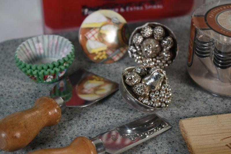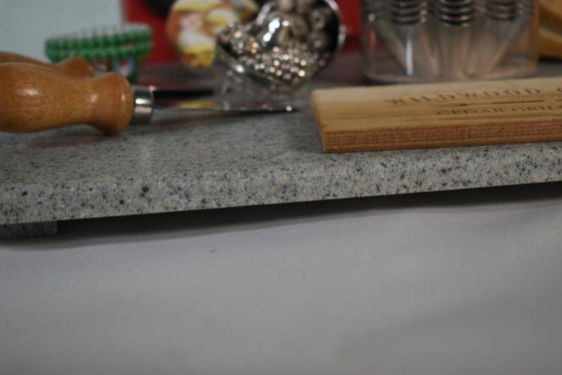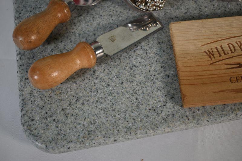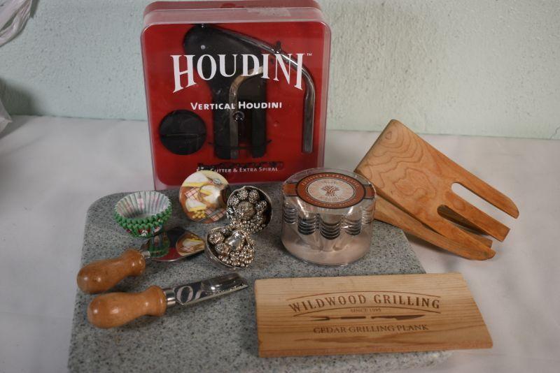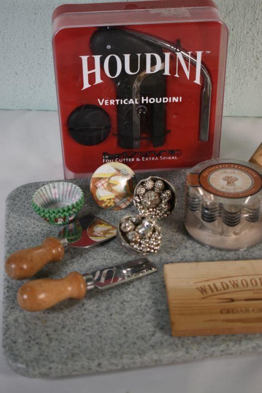 Houdini wine opener, cheese knives, cheese holders, Corian slicing board, and more. Two of the cheese holders are missing some legs.