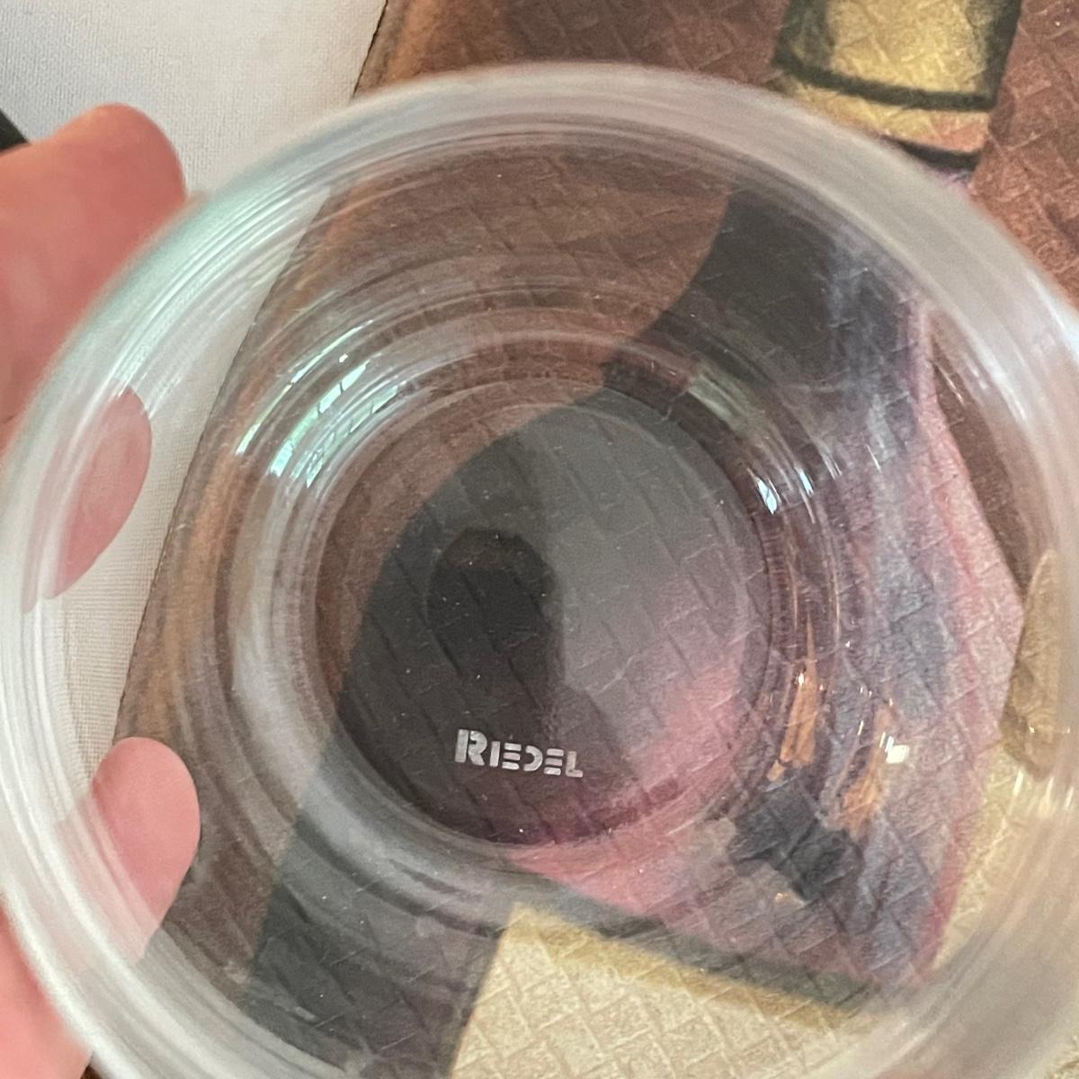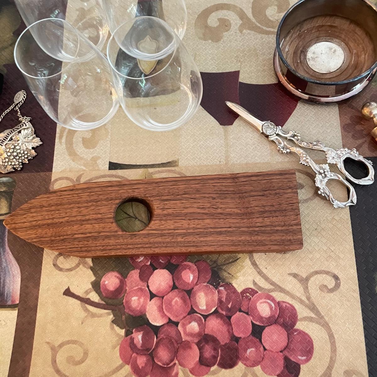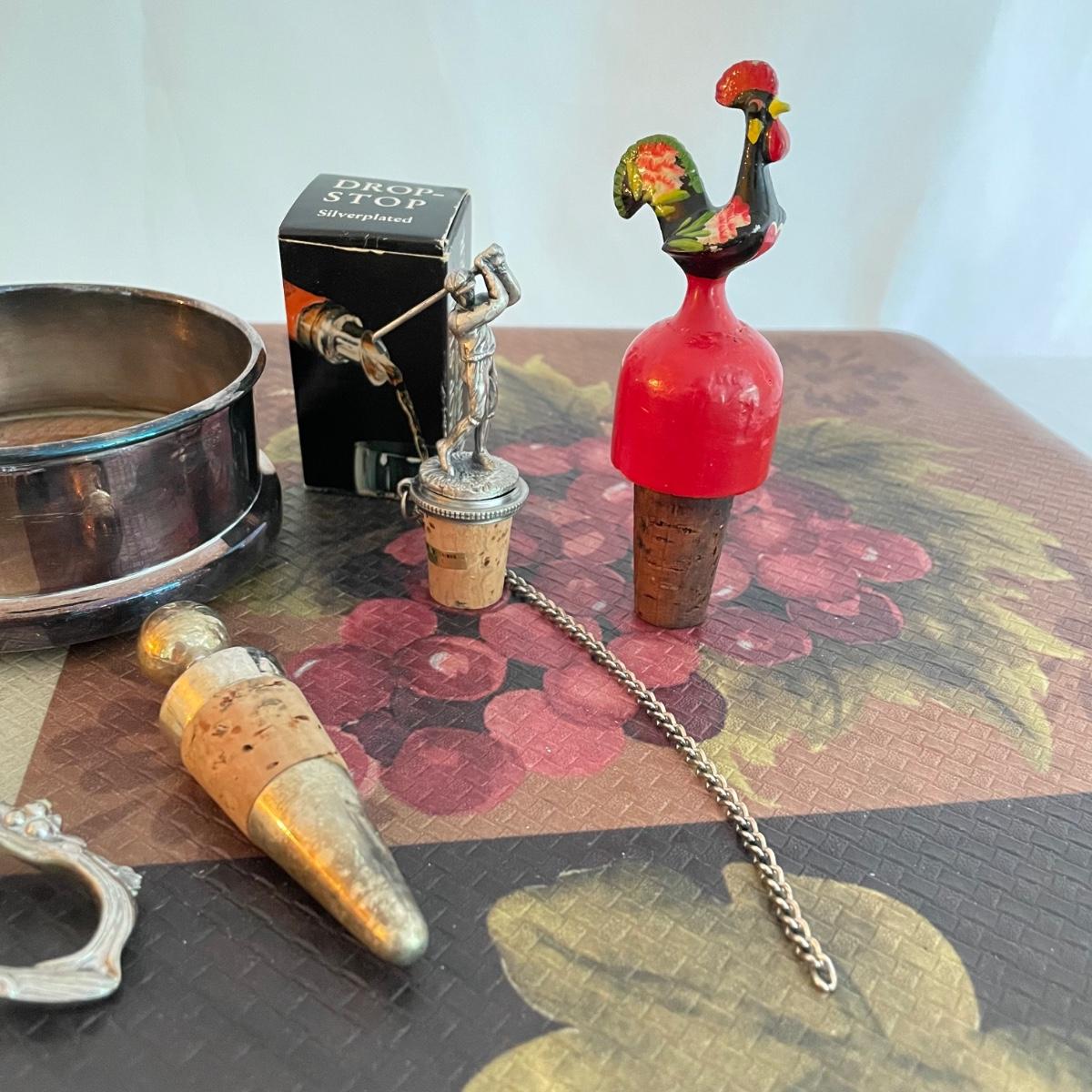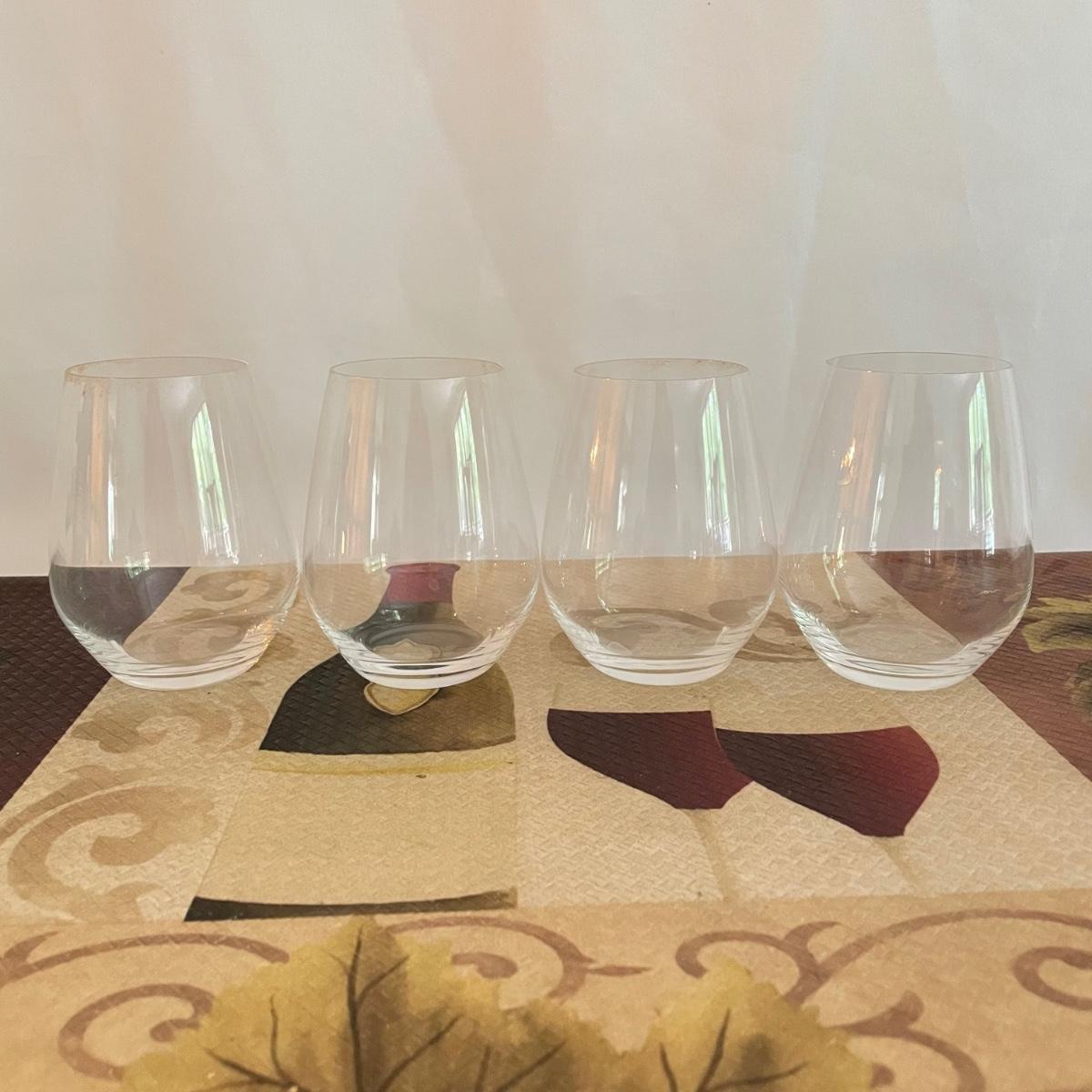 Four Riedel stemless wine glasses with a wine bottle holder that balances with a full bottle. The cushioned kitchen mat measures 35” x 20”. Lot also includes a ScrewPull to make opening a bottle a snap! Vintage wine bottle coaster, grape scissors, Burgundy decanter label, stoppers and a pourer. See images. Local pick up only.