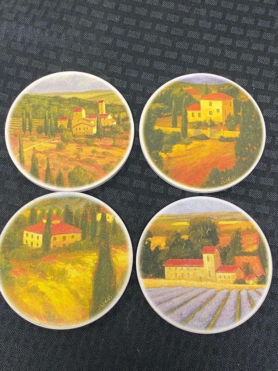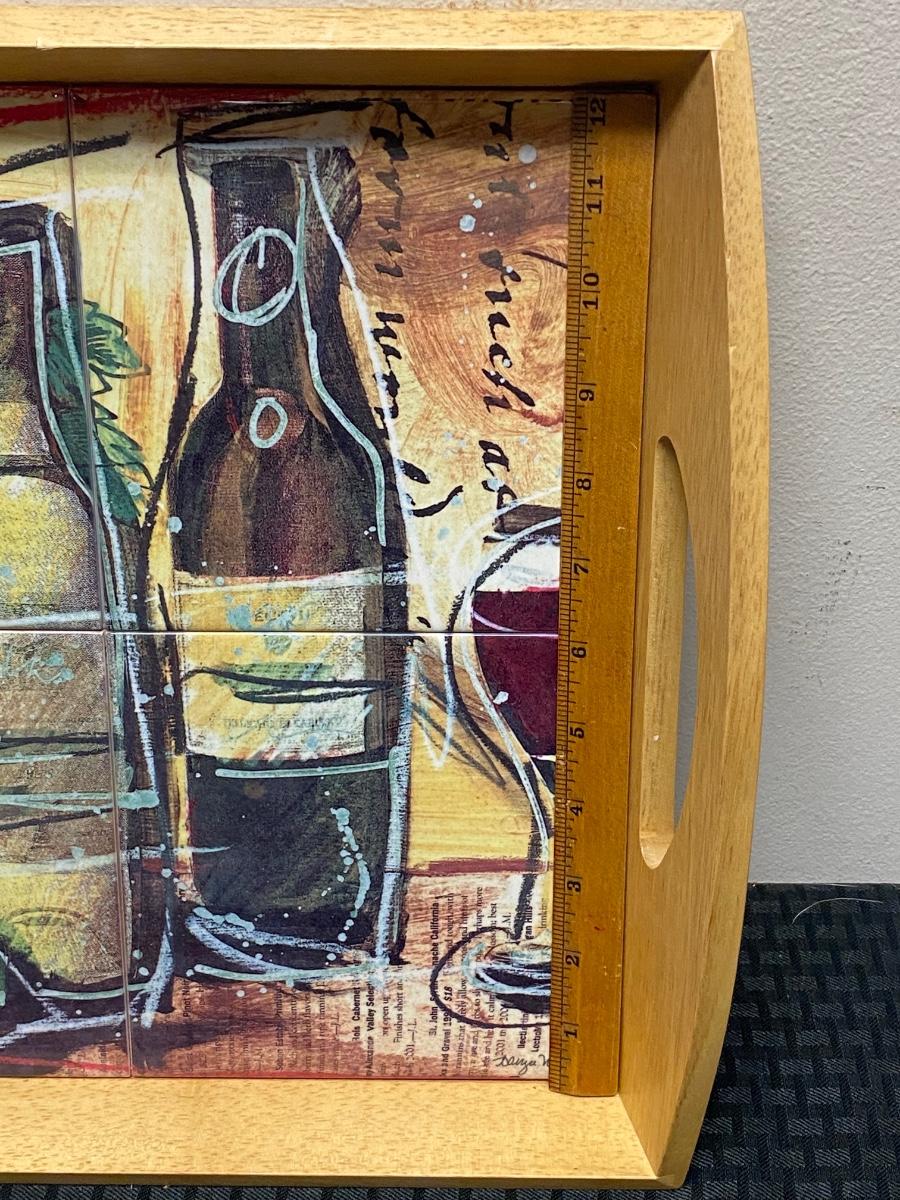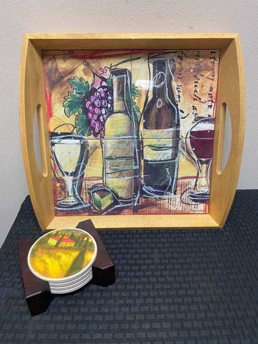 Wine Vino Wood Tray and Spanish Countryside Coasters, there is no significant damage to the tray and is in good useable condition. Check pictures for more details and for sizing.