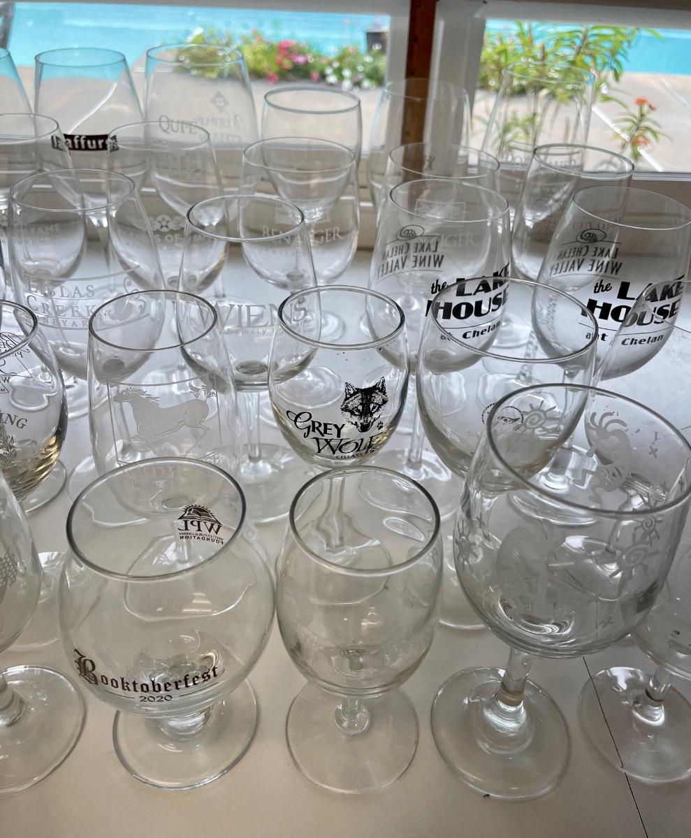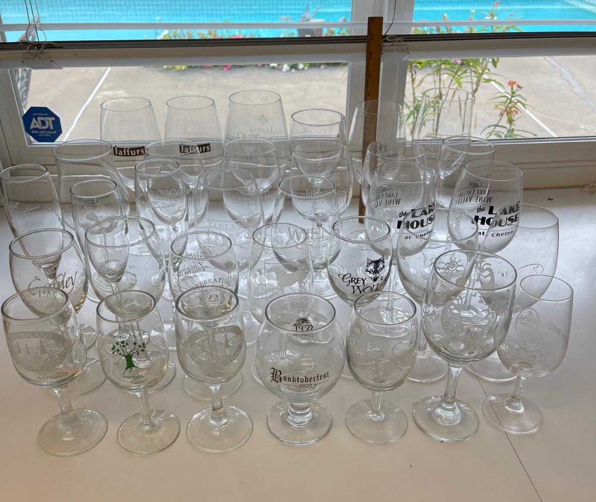 Many different wineries and places of interest souvenir glasses. These are in fair to good condition. Some have logos that are almost faded completely. Most are good condition.