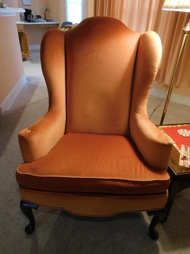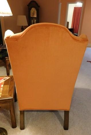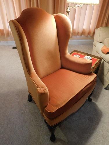 Wing Back Upholstered Chair appears to be in good condition but may need to be cleaned