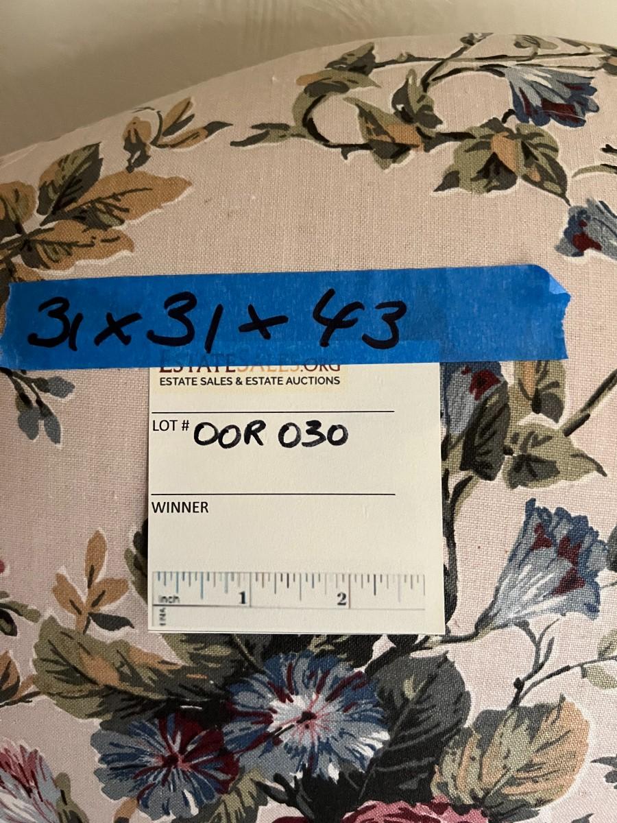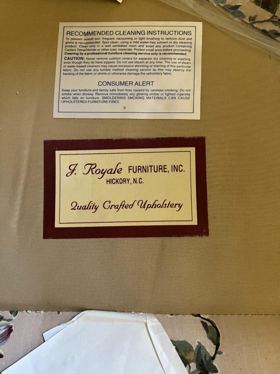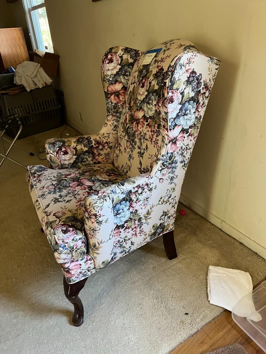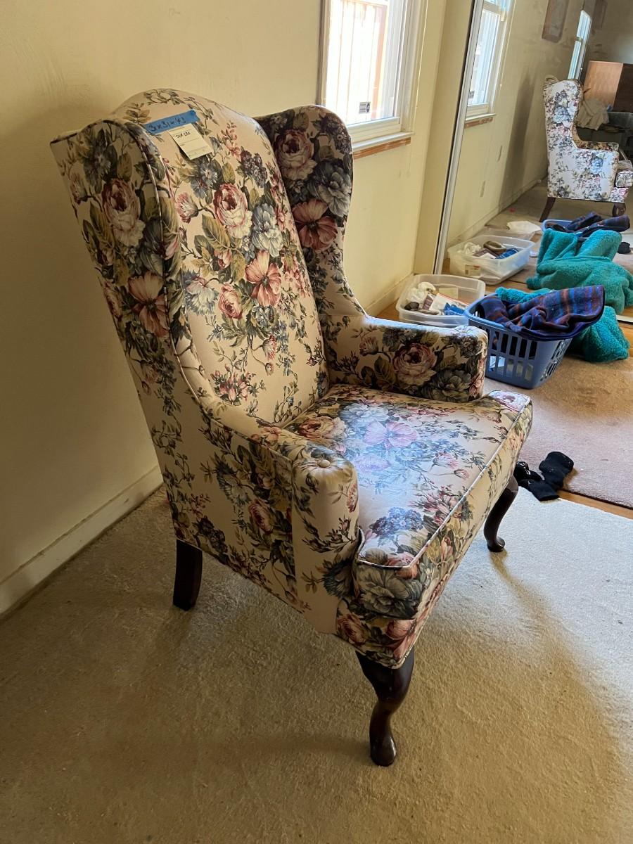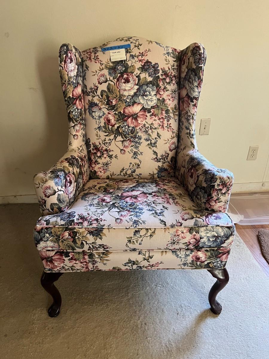 Wing chair with wooden queen Anne legs, has flower upholstery, measures 31 x 31 x 43, made by J. Royale Furniture Inc. Hickory N.J.