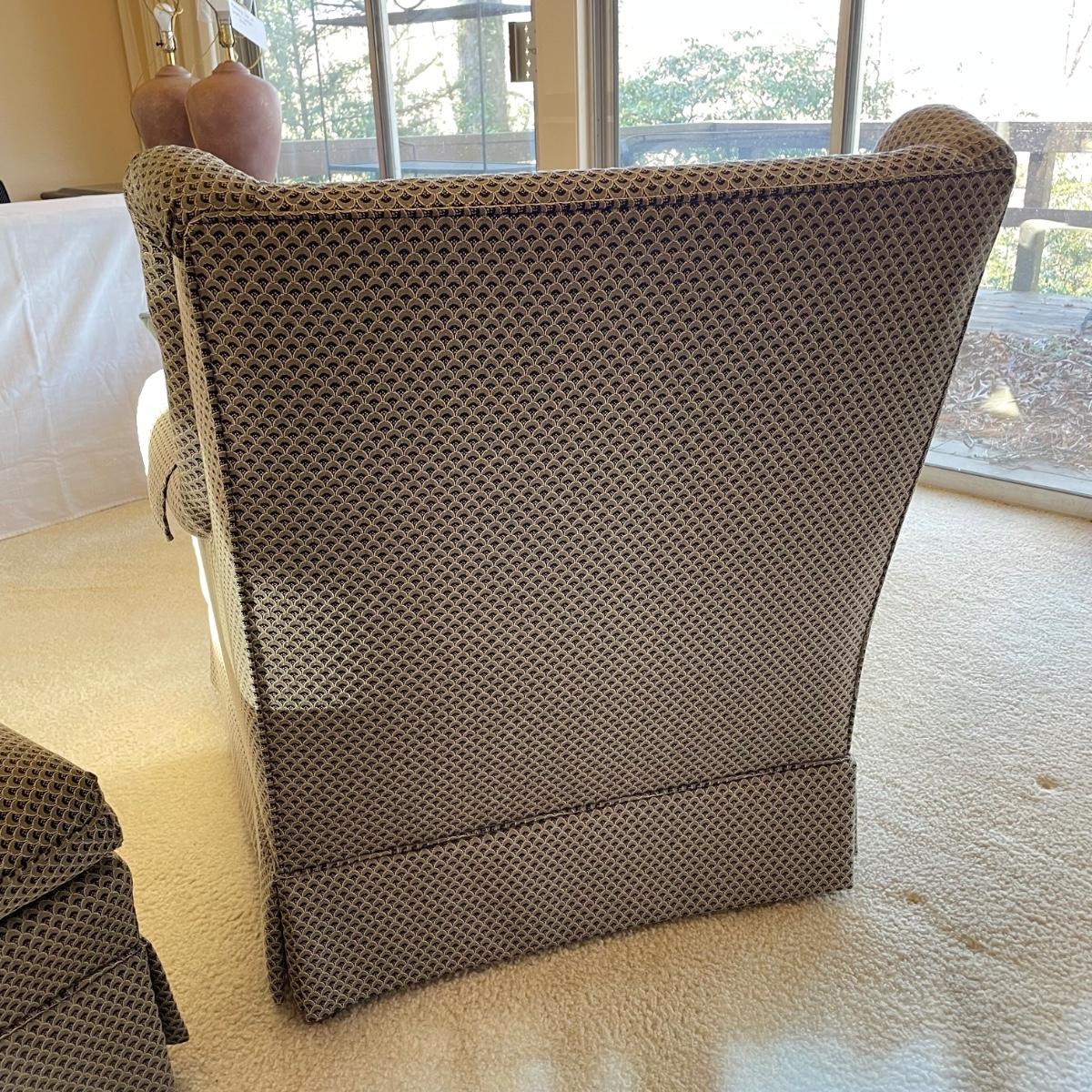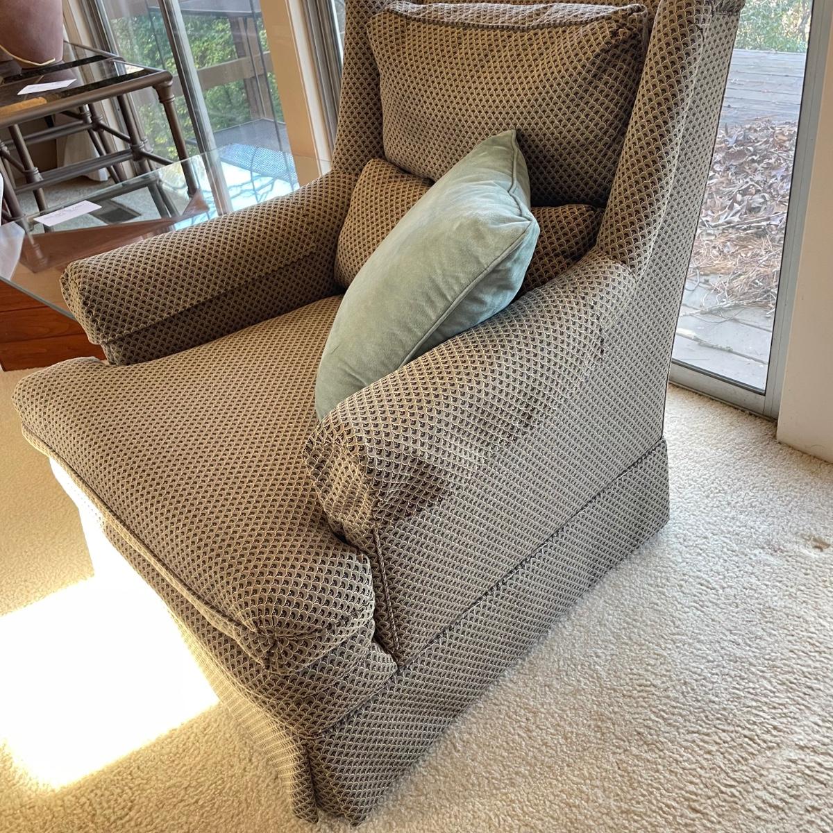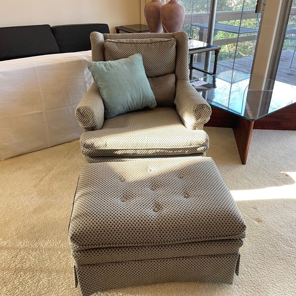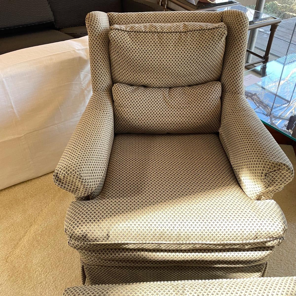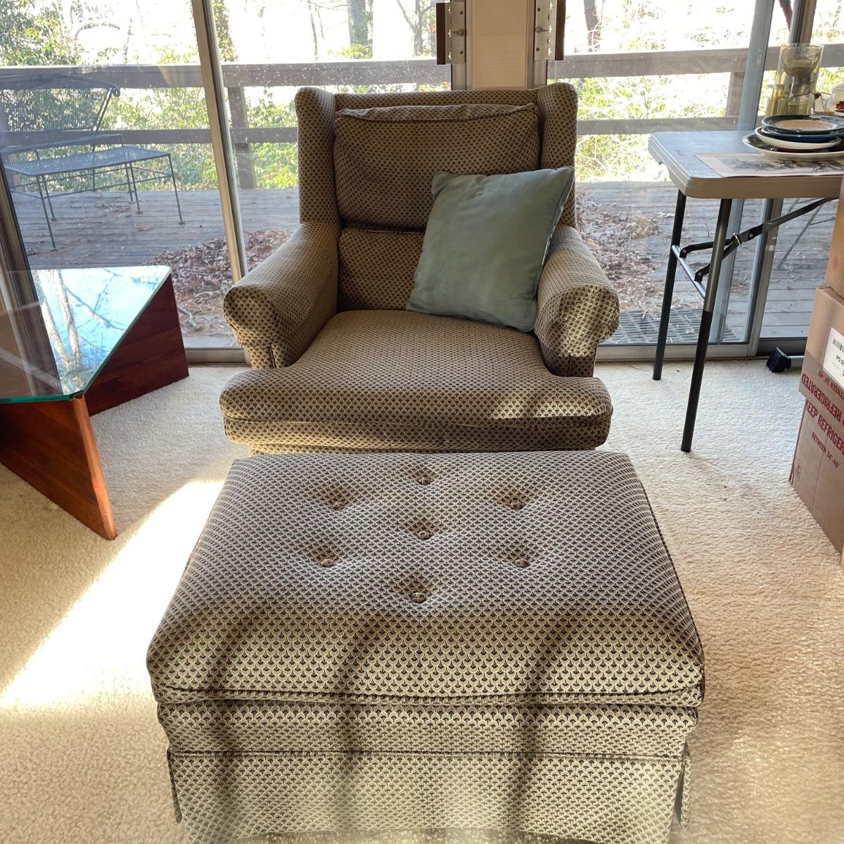 Upholstered wingback armchair with matching ottoman and throw pillow. Upholstery has a nice scale print and splashes of color. Cushions are more plush than firm. Minor blemishes are shown in photos. Chair measures approximately 30” x 33” x 34”H with an 18” seat height. Ottoman is approximately 30” x 21” x 18”H. Accent pillow is a nice celadon color, it appears to be a synthetic suede and has a couple pen marks. Local pick up only. Winning bidder must bring assistance to help move and load this item due to its weight and/or size. Items are on the main level, with just one step off the front porch to load.