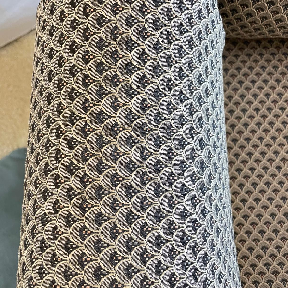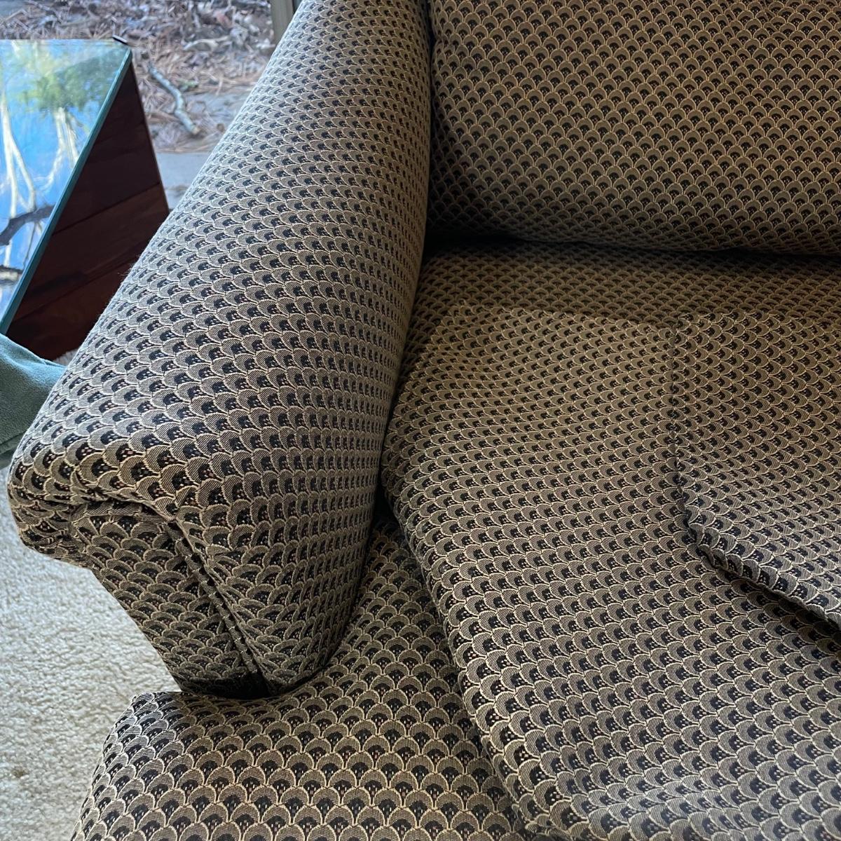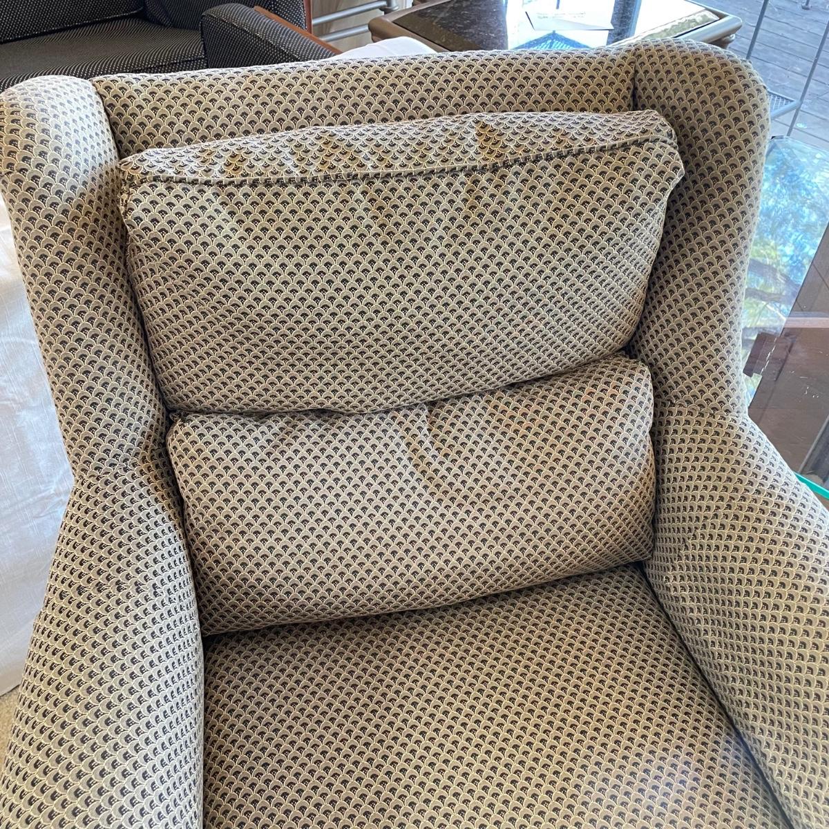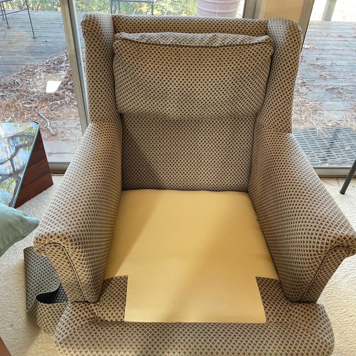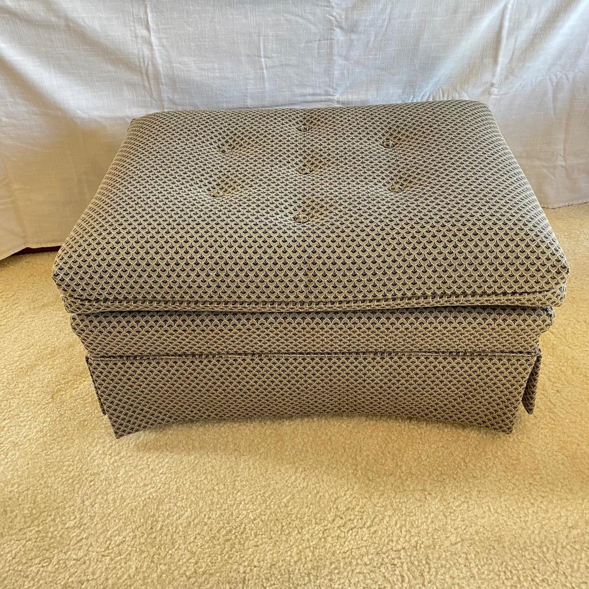 Upholstered wingback armchair with matching ottoman and throw pillow. Upholstery has a nice scale print and splashes of color. Cushions are more plush than firm. Minor blemishes are shown in photos. Chair measures approximately 30” x 33” x 34”H with an 18” seat height. Ottoman is approximately 30” x 21” x 18”H. Accent pillow is a nice celadon color, it appears to be a synthetic suede and has a couple pen marks. Local pick up only. Winning bidder must bring assistance to help move and load this item due to its weight and/or size. Items are on the main level, with just one step off the front porch to load.