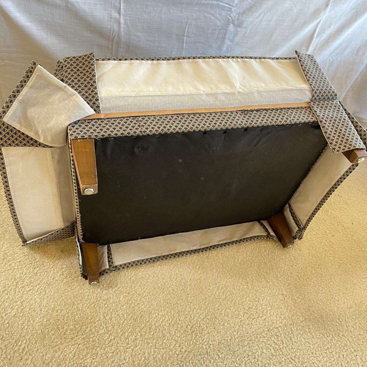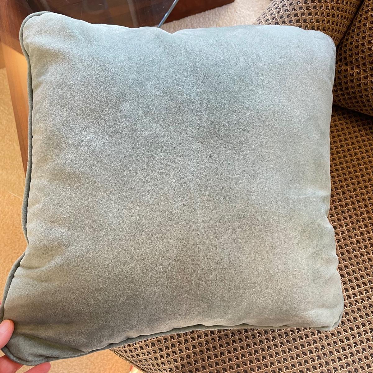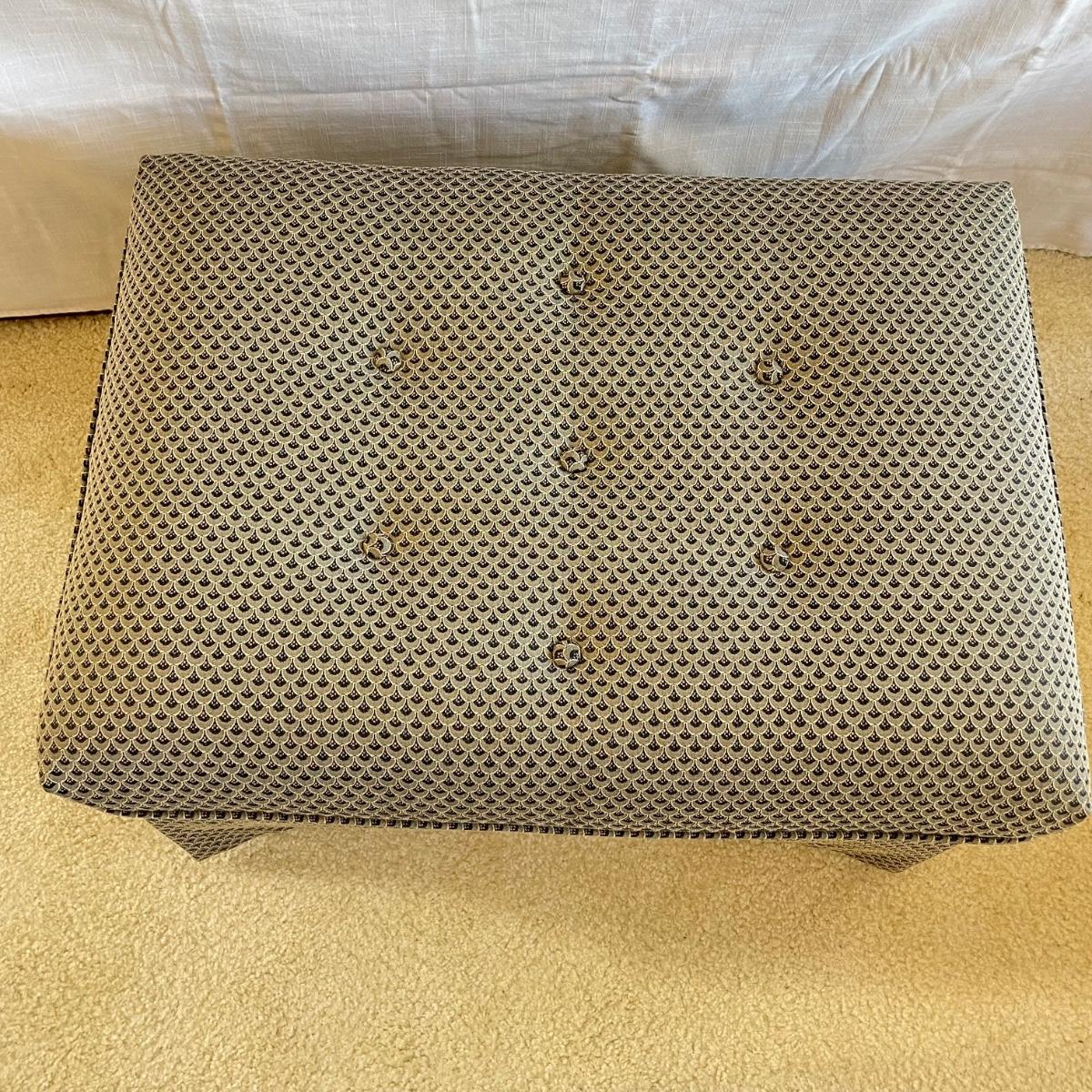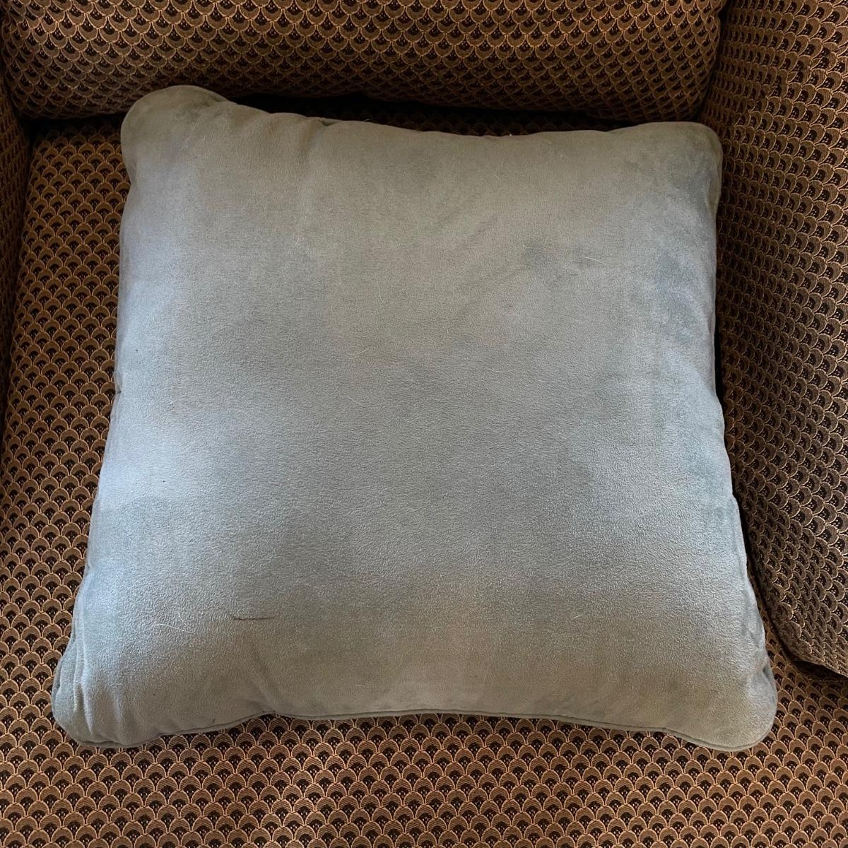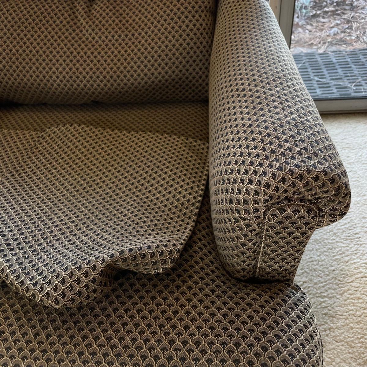 Upholstered wingback armchair with matching ottoman and throw pillow. Upholstery has a nice scale print and splashes of color. Cushions are more plush than firm. Minor blemishes are shown in photos. Chair measures approximately 30” x 33” x 34”H with an 18” seat height. Ottoman is approximately 30” x 21” x 18”H. Accent pillow is a nice celadon color, it appears to be a synthetic suede and has a couple pen marks. Local pick up only. Winning bidder must bring assistance to help move and load this item due to its weight and/or size. Items are on the main level, with just one step off the front porch to load.
