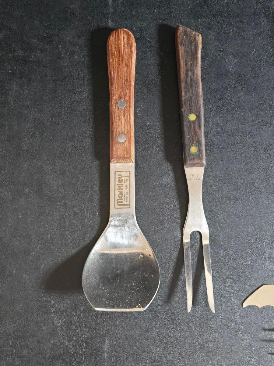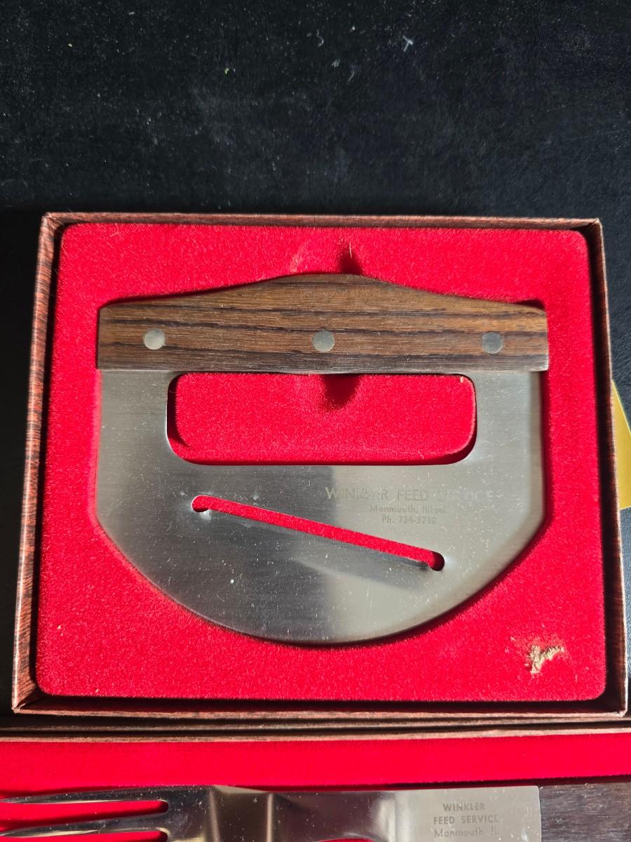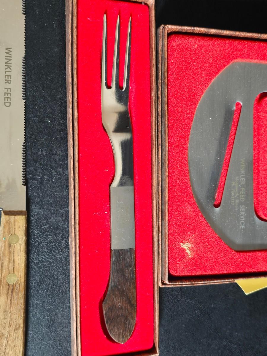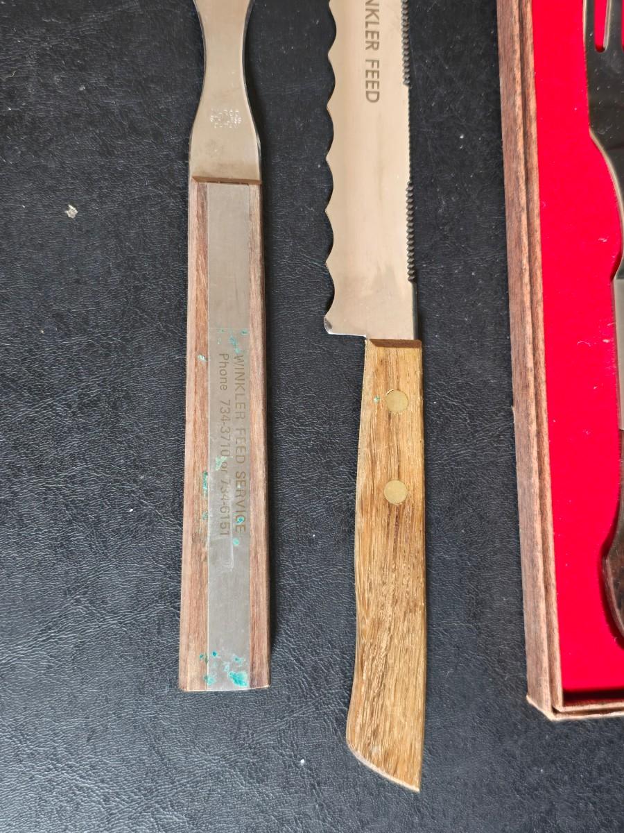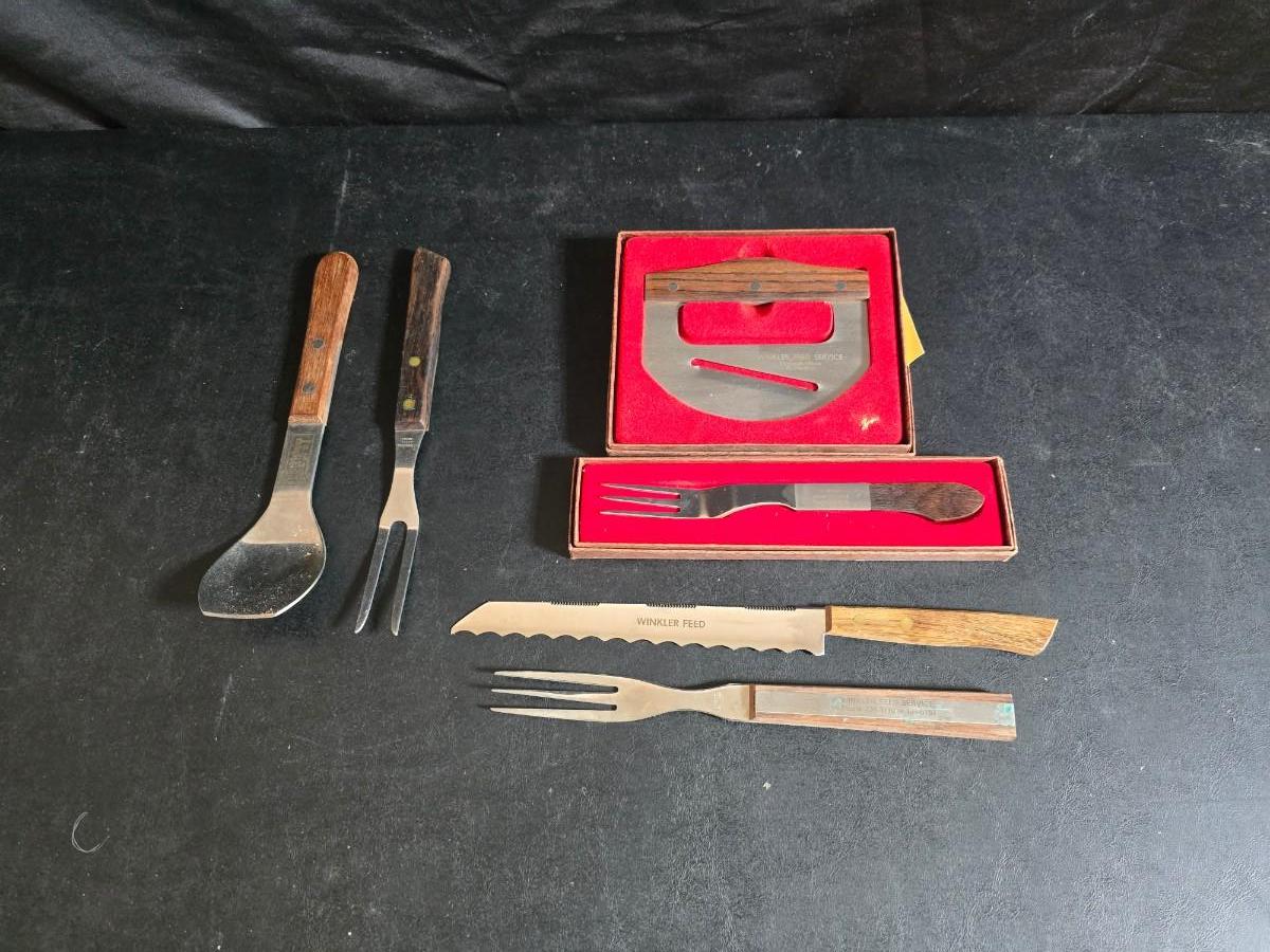 Winkler feed service utensils - Ulu knife - Turning fork - Carving set and a large scoop spoon all with wooden handles
