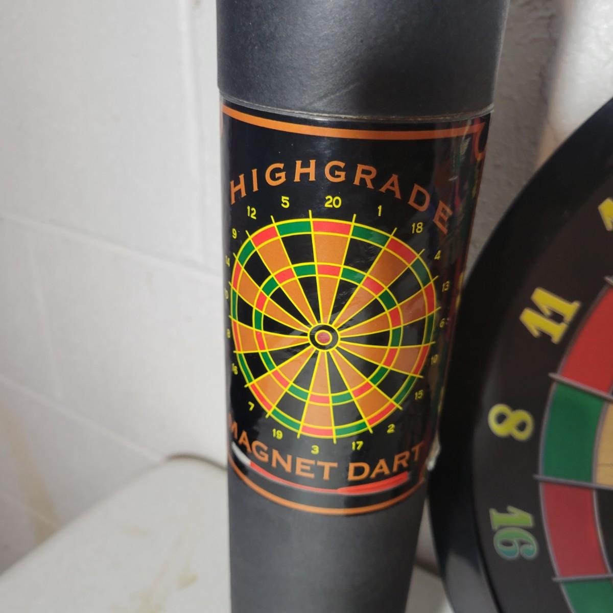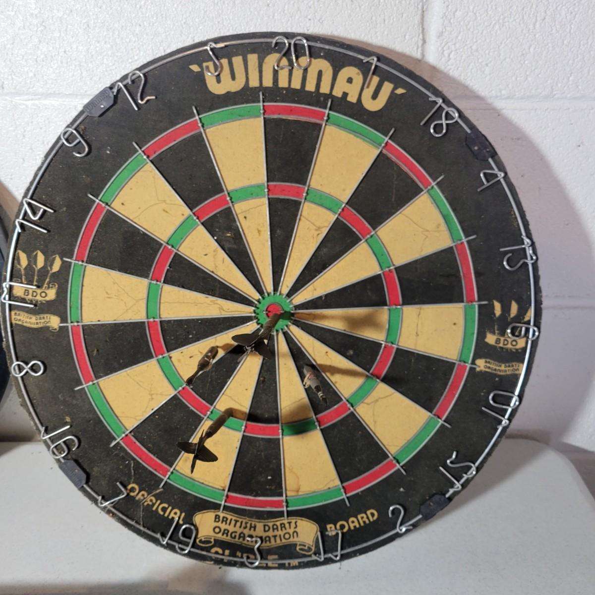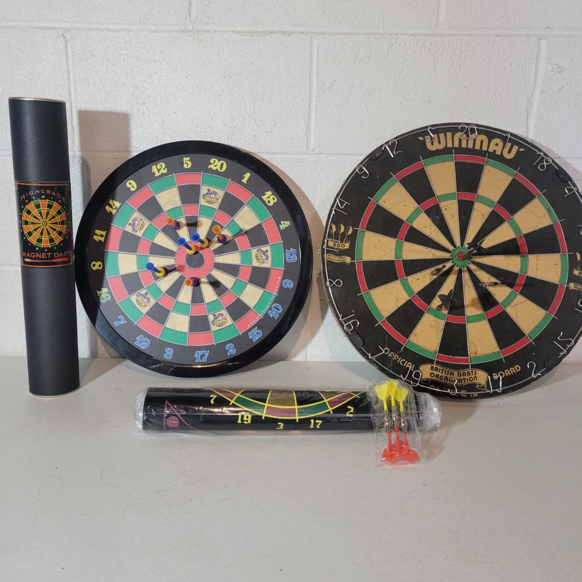 Three dart boards in good to excellent condition. Included is a Winmaú regulation dart board with four darts Included. Two of which are missing their flights. Also includes two magnetic boards and magnetic darts in excellent condition. One board is brand new and rolls up for convenience. Winmaú board measures approximately 18" x 2" Local pickup only