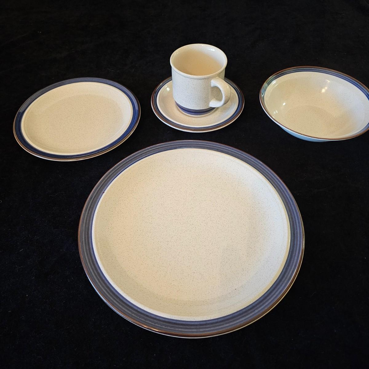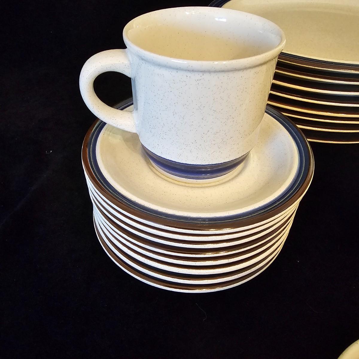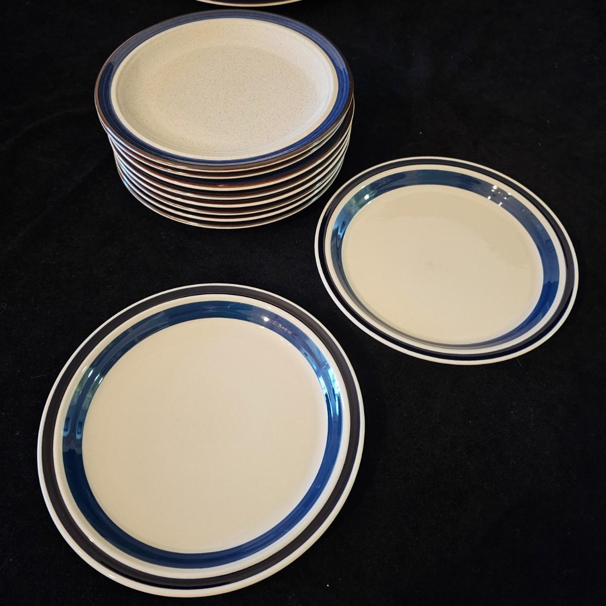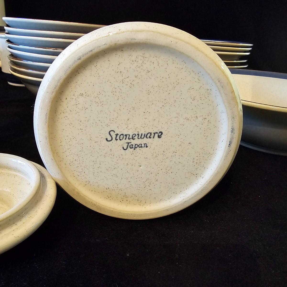 Five piece place setting for eight people, stoneware from Japan. 10.5" dinner plate, 6.5" bowl, 7.5" salad plate. Also includes seven cups, eight saucers, one 9" serving bowl and a sugar bowl. Two additional plates are shown, Estate by Hearthside, also fron Japan. Please note that three of the bowls have slight chips in them. See photos for details. Local pickup only.