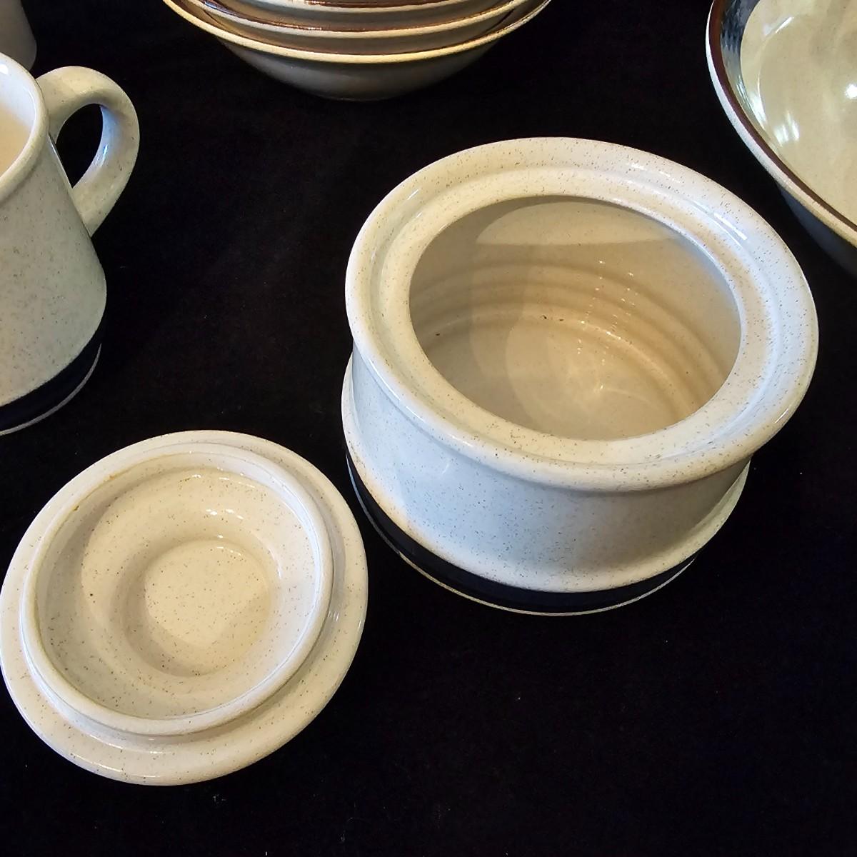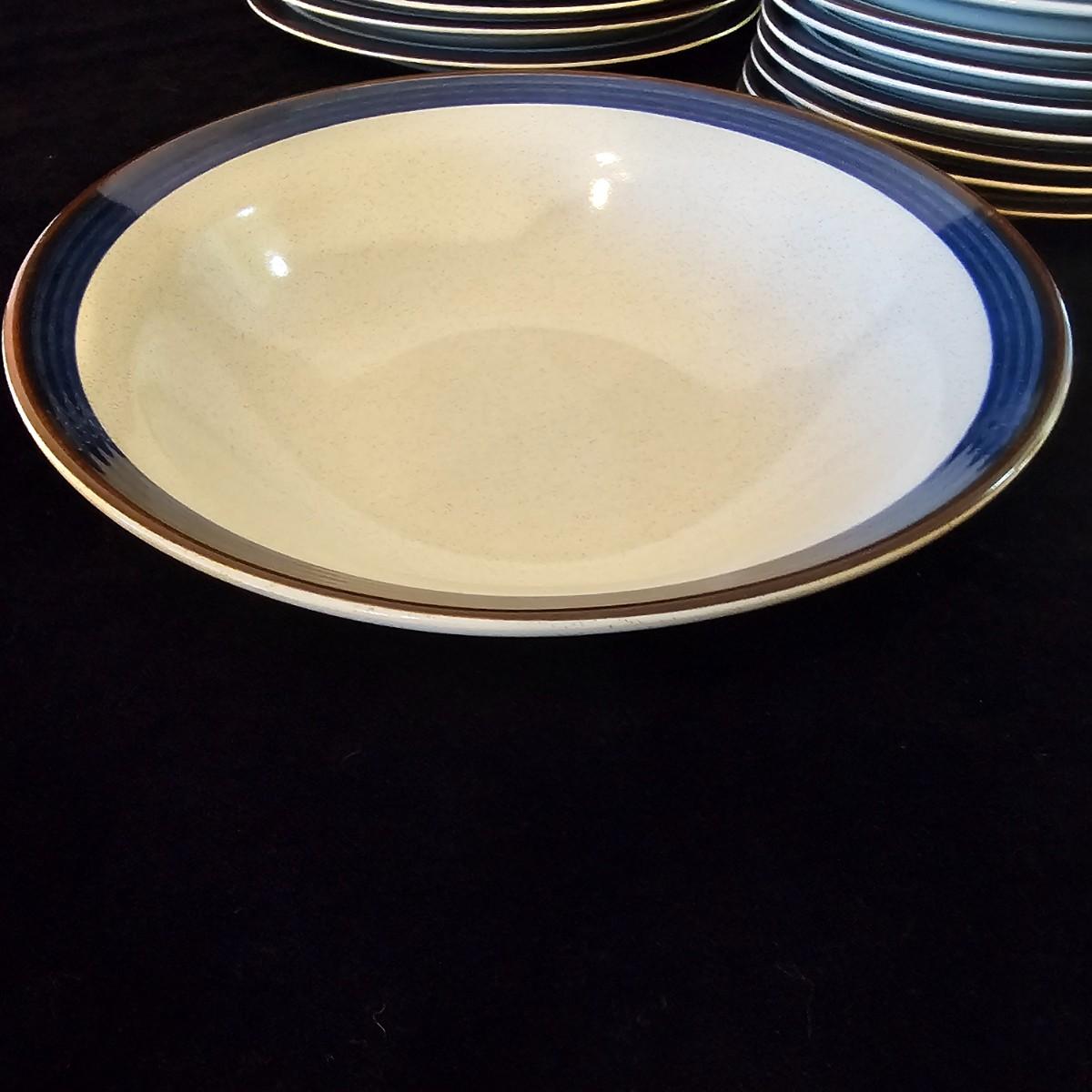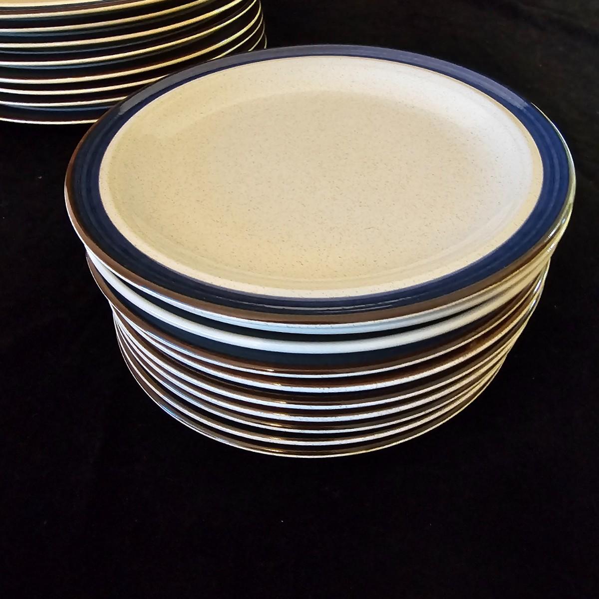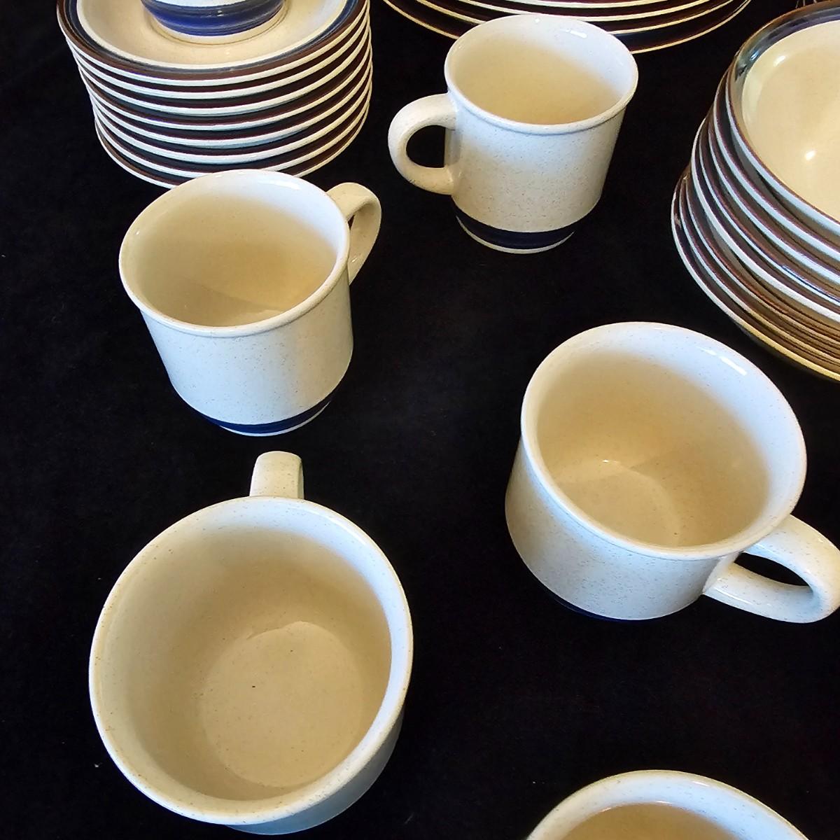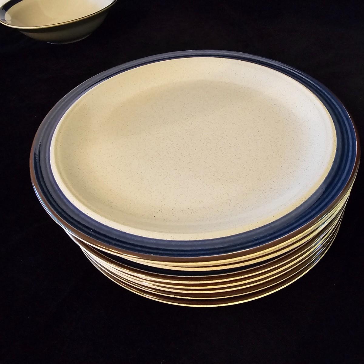 Five piece place setting for eight people, stoneware from Japan. 10.5" dinner plate, 6.5" bowl, 7.5" salad plate. Also includes seven cups, eight saucers, one 9" serving bowl and a sugar bowl. Two additional plates are shown, Estate by Hearthside, also fron Japan. Please note that three of the bowls have slight chips in them. See photos for details. Local pickup only.