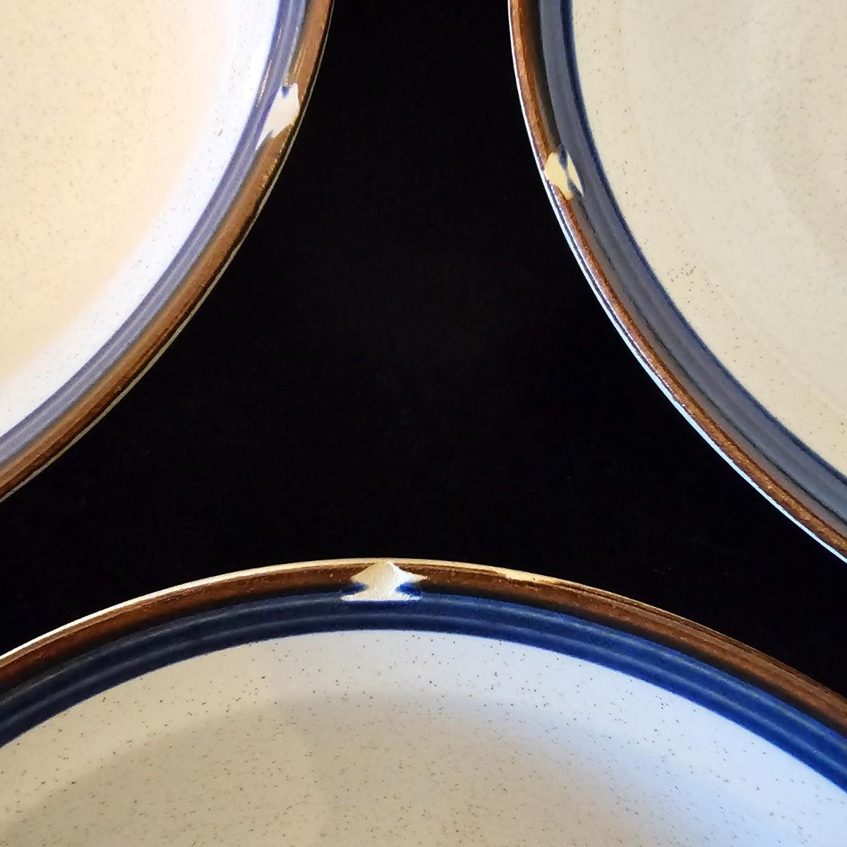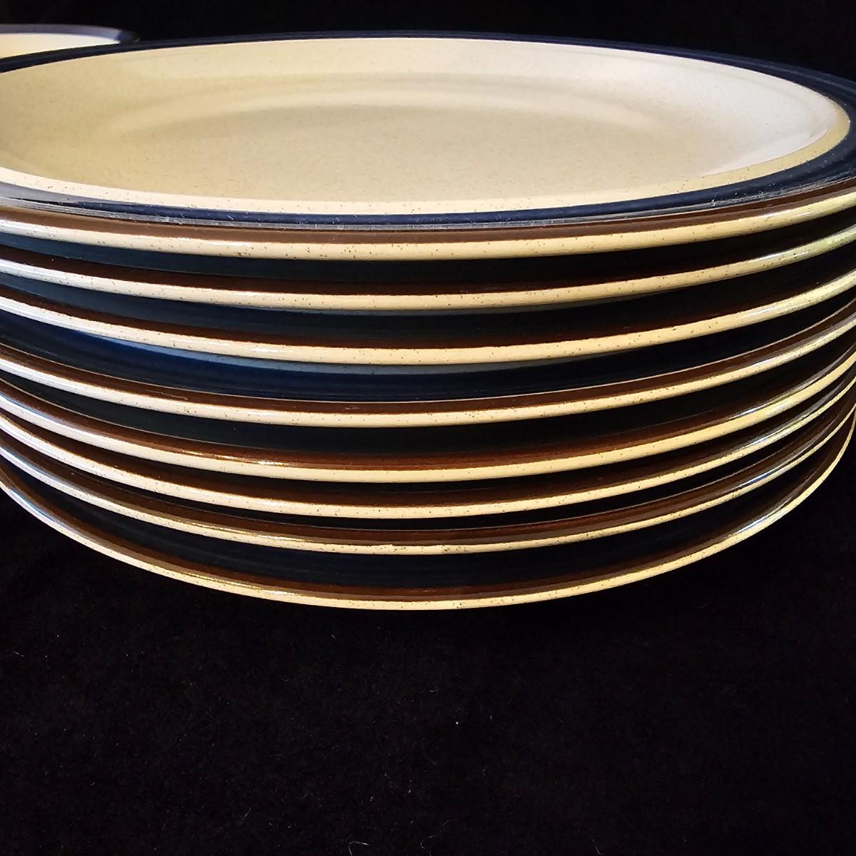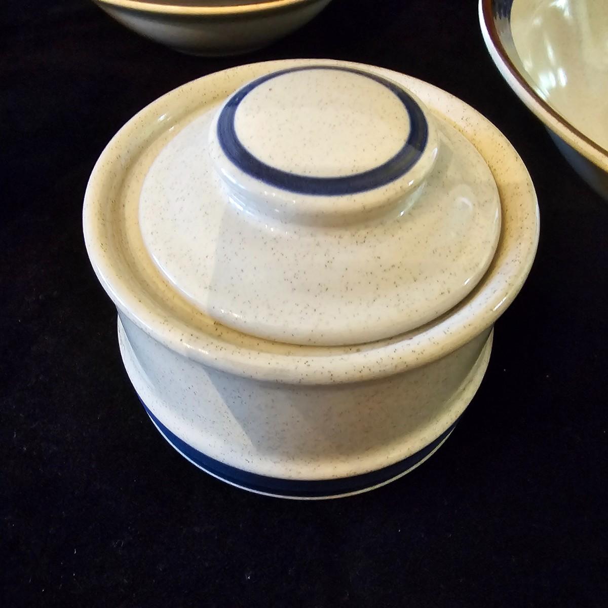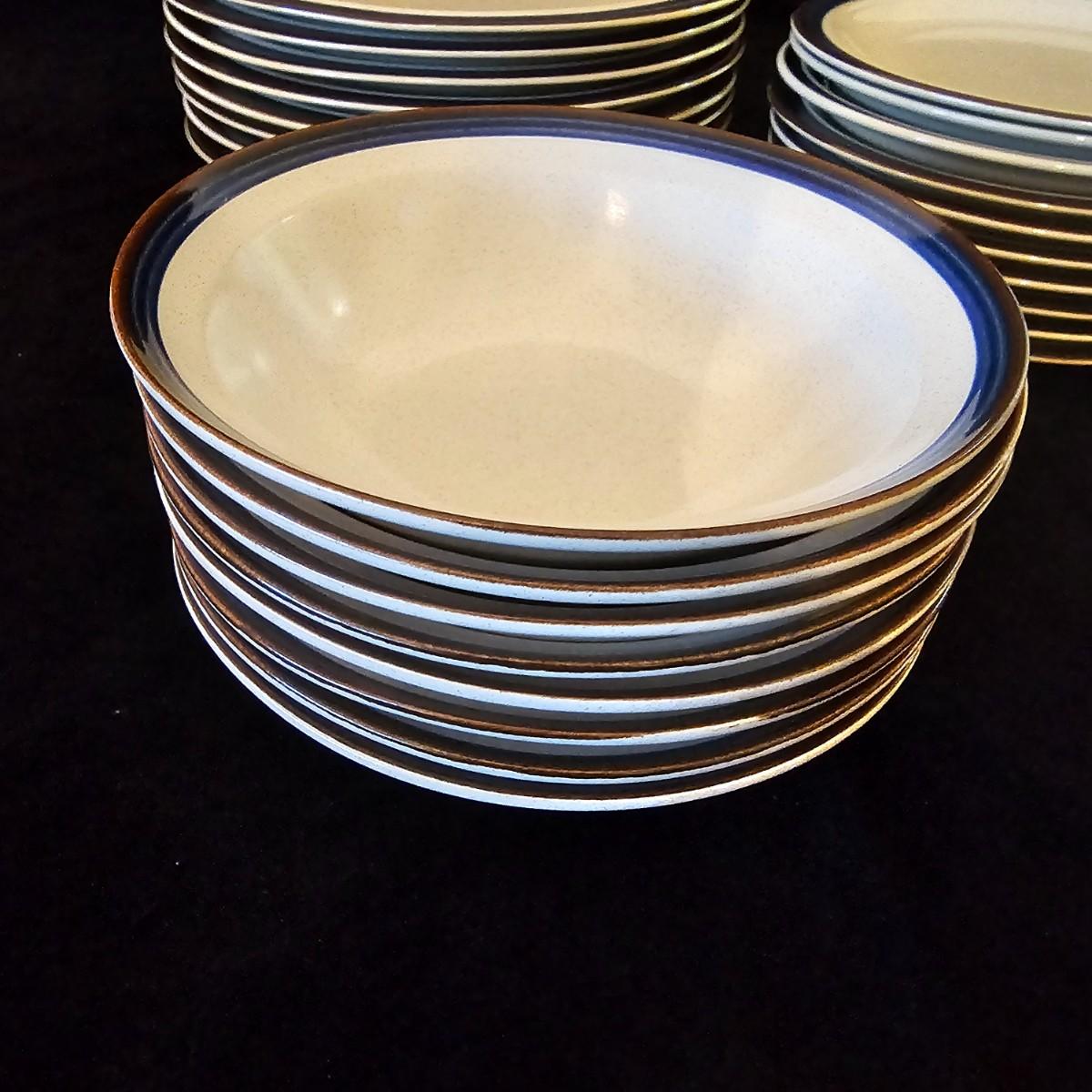 Five piece place setting for eight people, stoneware from Japan. 10.5" dinner plate, 6.5" bowl, 7.5" salad plate. Also includes seven cups, eight saucers, one 9" serving bowl and a sugar bowl. Two additional plates are shown, Estate by Hearthside, also fron Japan. Please note that three of the bowls have slight chips in them. See photos for details. Local pickup only.