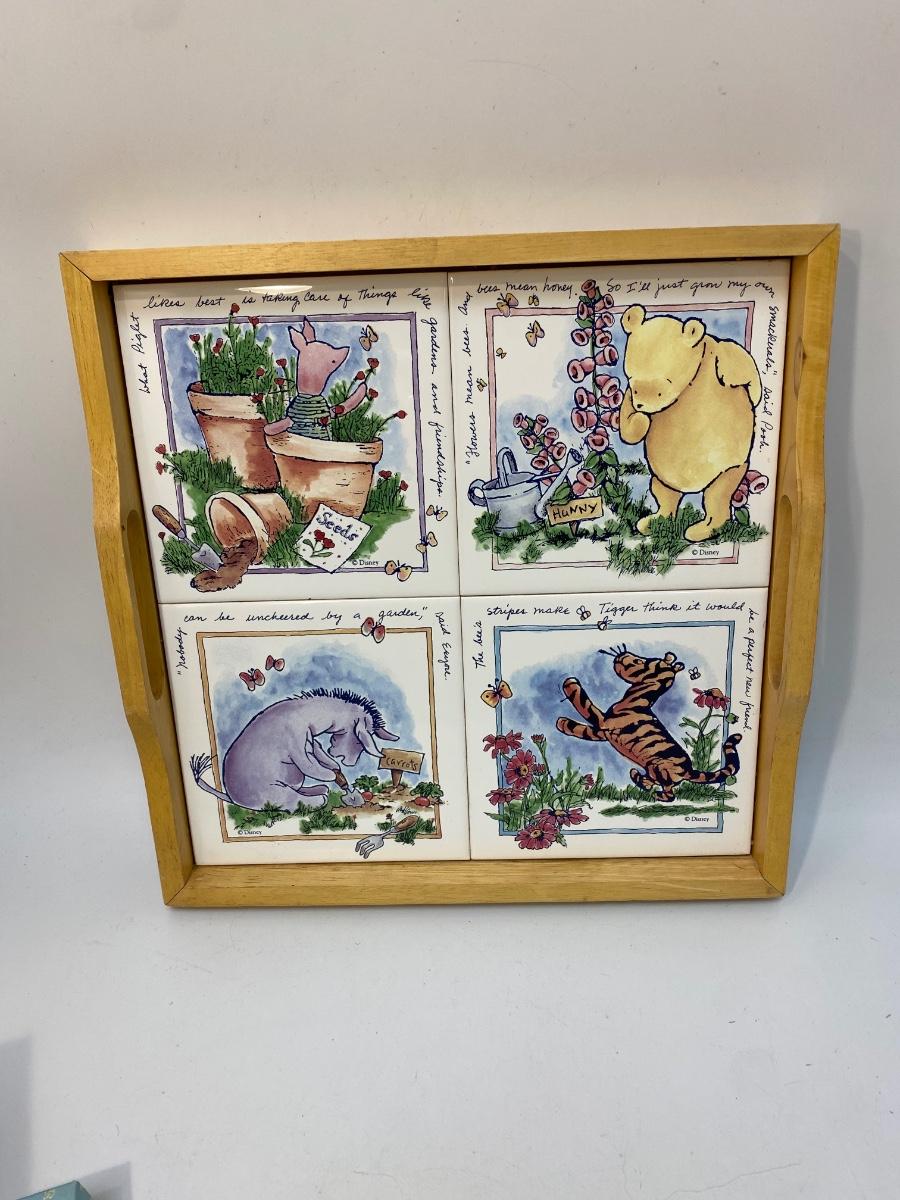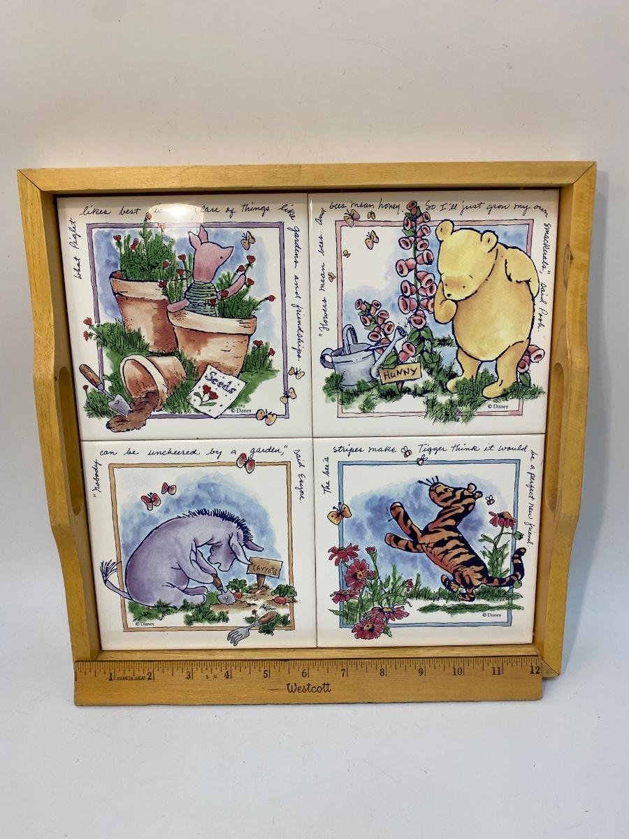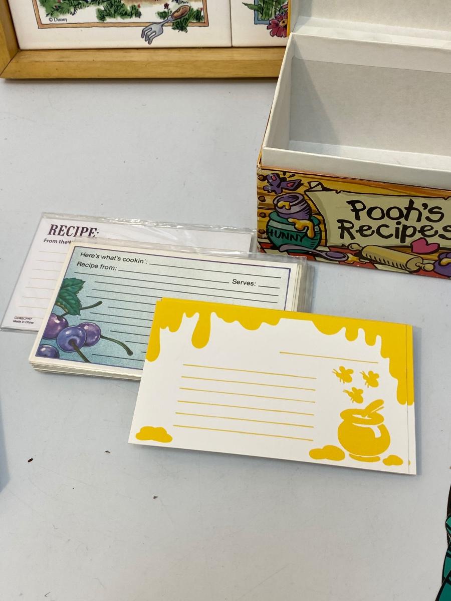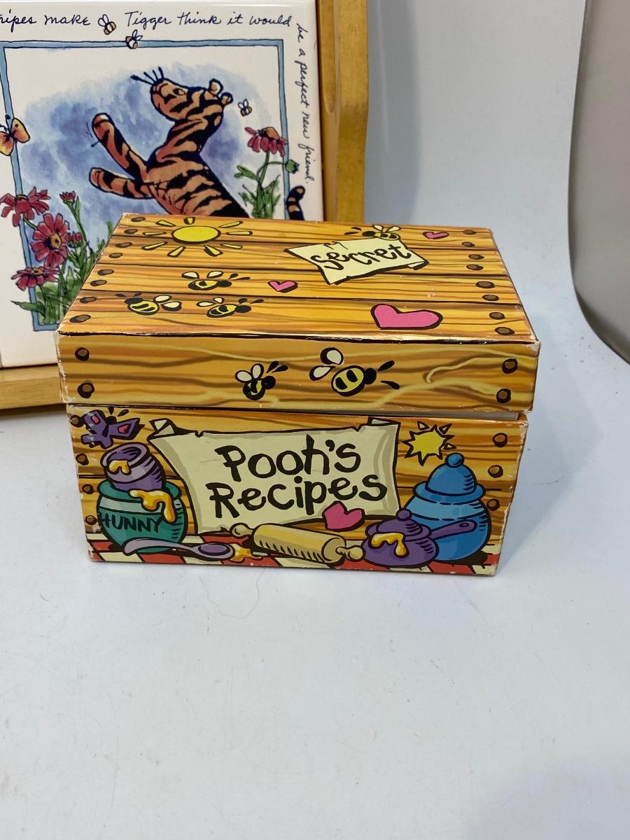 Winnie the Pooh Kitchen Decor Items. Tray, Spreaders, & Recipe Box in good used condition. There is some wear to the paint on the spreaders. The recipe box comes with unused recipe cards.