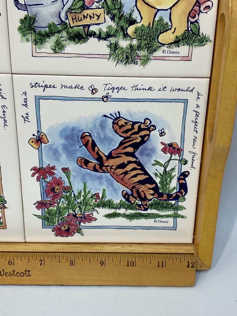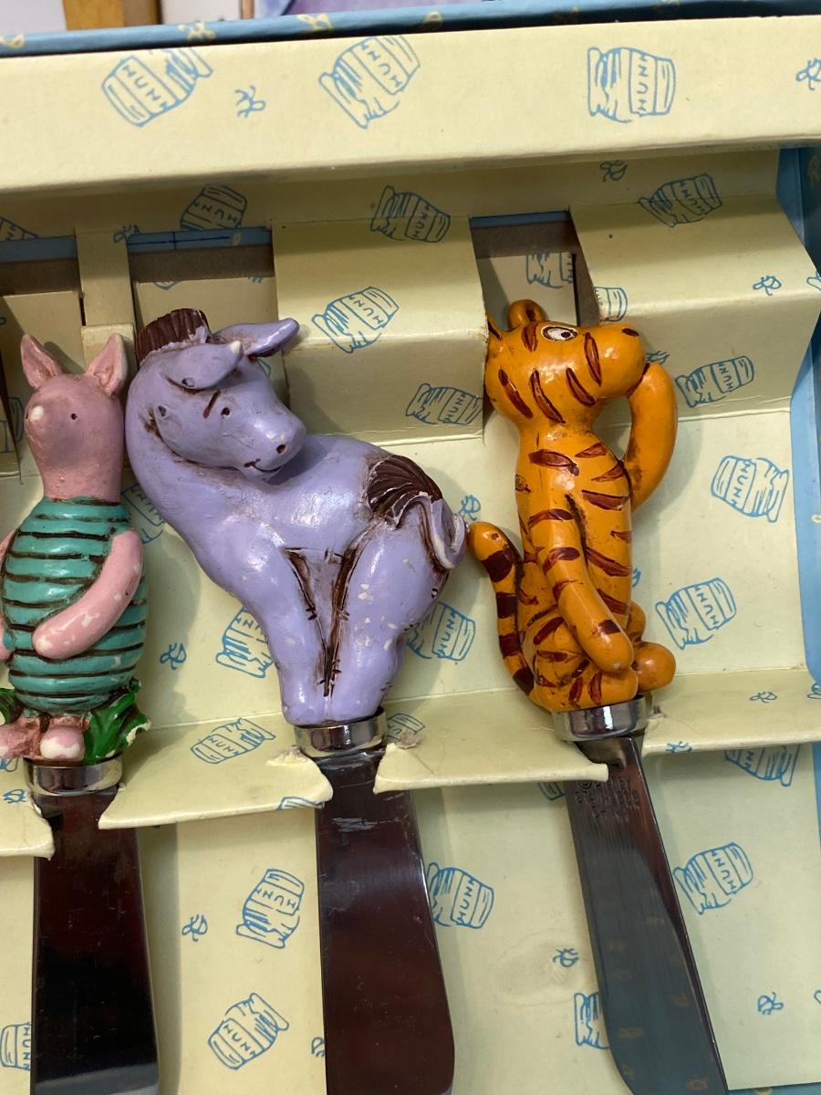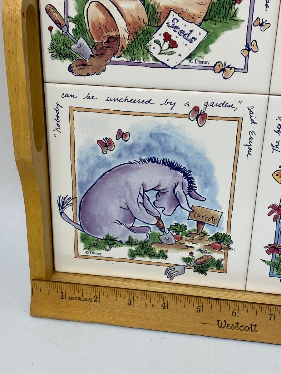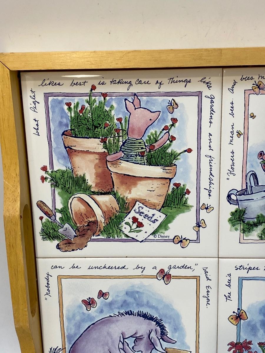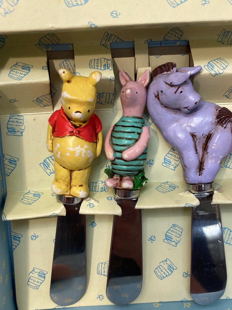 Winnie the Pooh Kitchen Decor Items. Tray, Spreaders, & Recipe Box in good used condition. There is some wear to the paint on the spreaders. The recipe box comes with unused recipe cards.