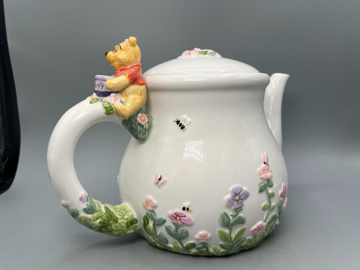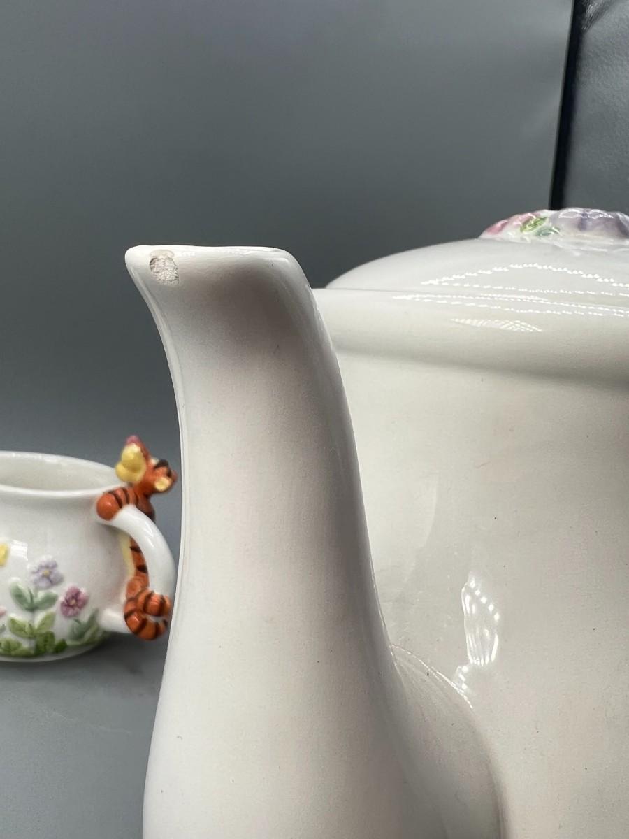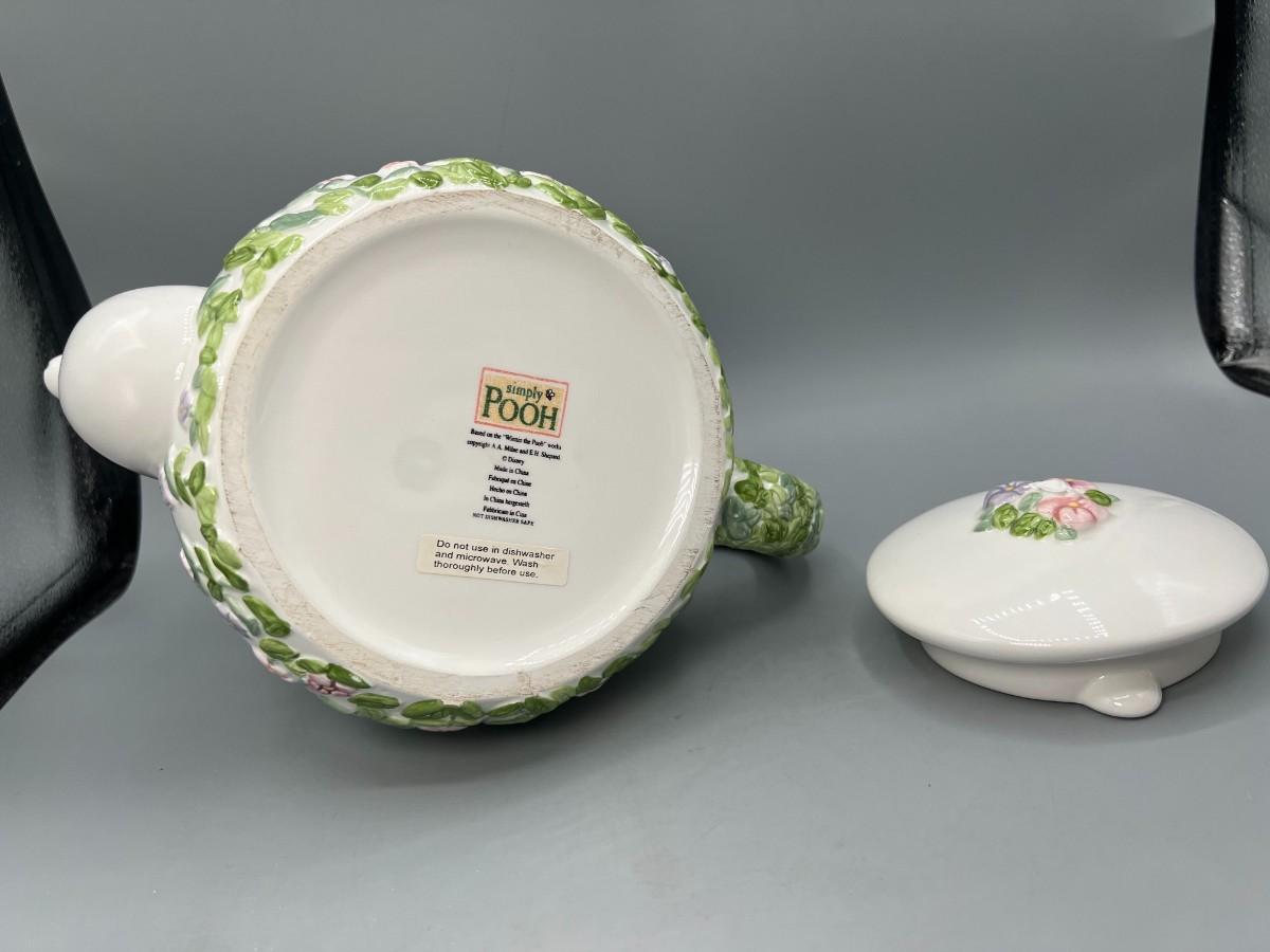 Adorable Simply Pooh Tea Set. Teapot, cream pitcher, and lidded sugar bowl. There are a couple small chips, nothing too serious, displays nicely.