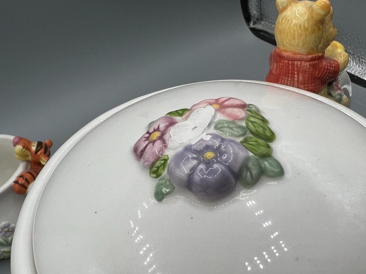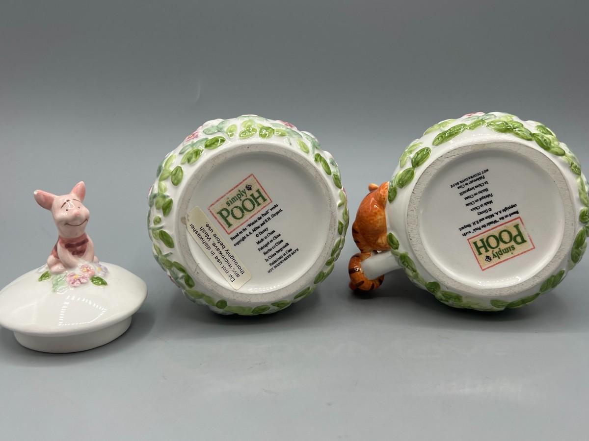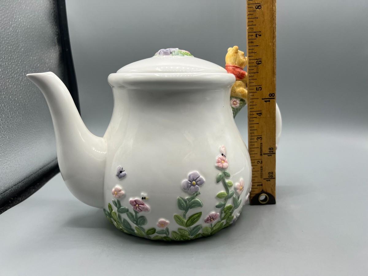 Adorable Simply Pooh Tea Set. Teapot, cream pitcher, and lidded sugar bowl. There are a couple small chips, nothing too serious, displays nicely.