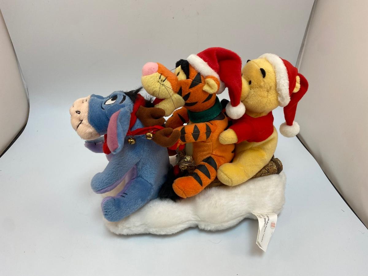 Winnie the Pooh Tigger Eeyore Sledding Musical Christmas Plush Animatronic. Untested as the battery terminal needs to be cleaned and batteries replaced. Displays nicely as is.