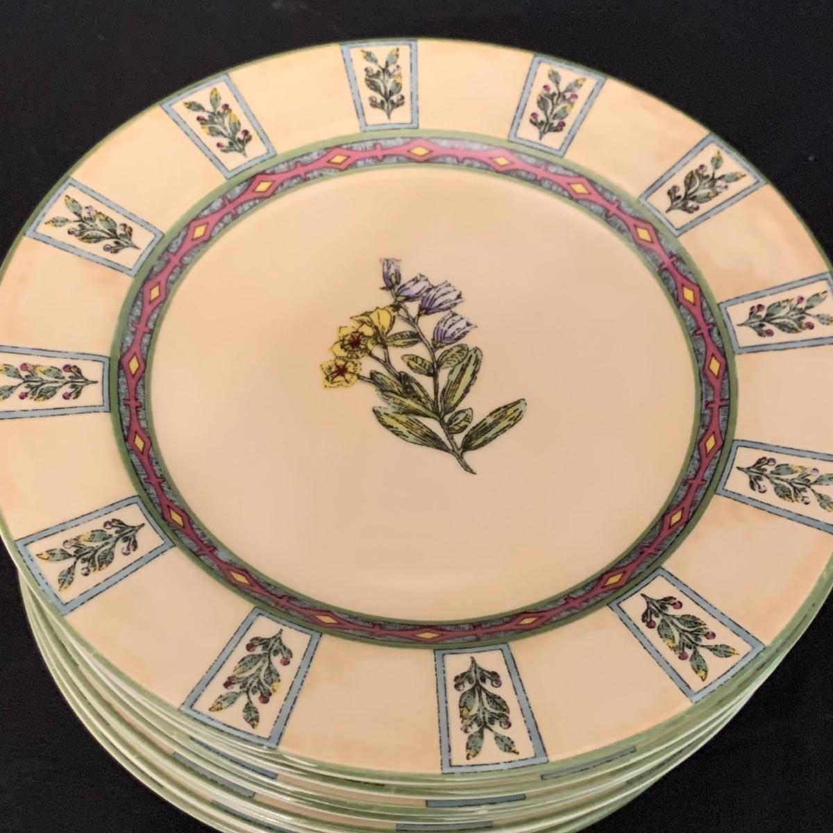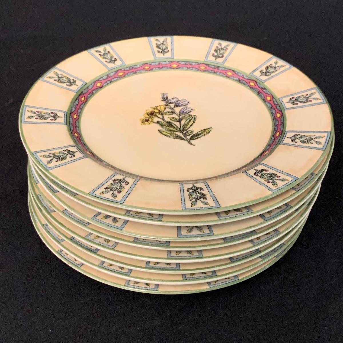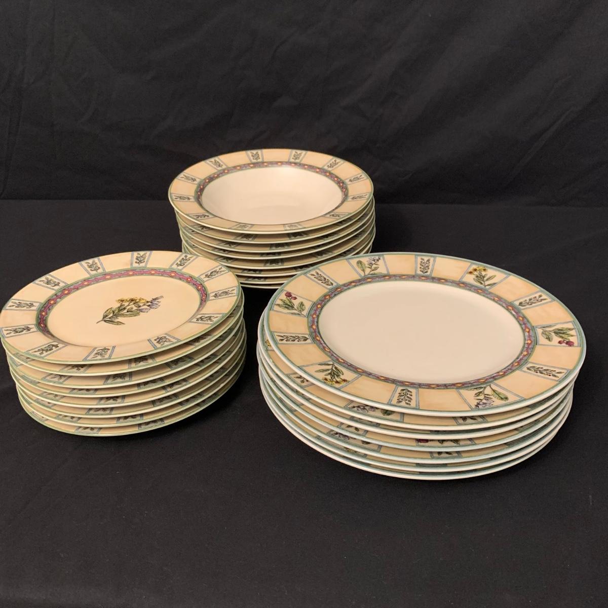 Winslow Manor Coventry set of genuine stoneware plates and bowls. Set includes seven 10.75”D plates, eight 8.25”D plates, and eight 9.25”D bowls. The dishes feature a floral decor. The larger plates and the bowls have white centers with a very light beige colored background around the border. The smaller plates have the light beige color in the center and around the border, and feature flowers in the center of the dish. All items are in good condition, though some of the design has faded/worn off over the years (see photos). Shipping available.