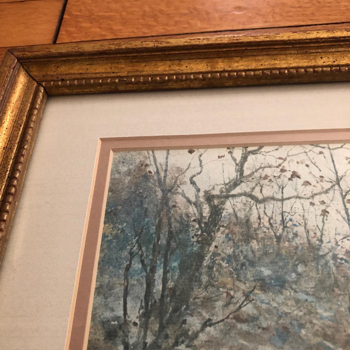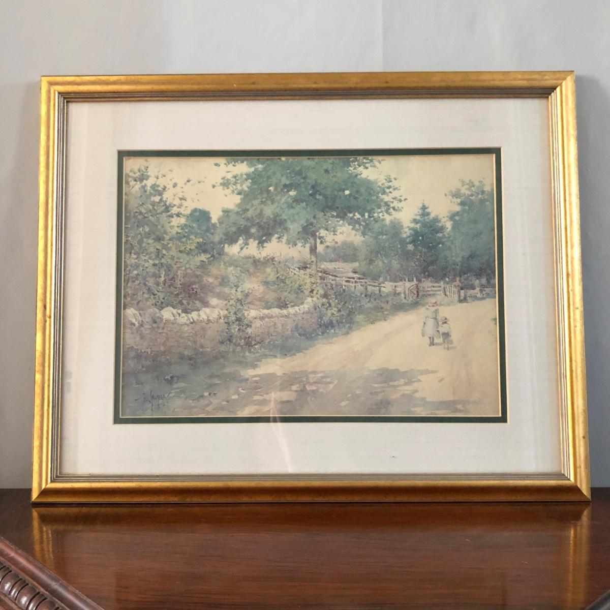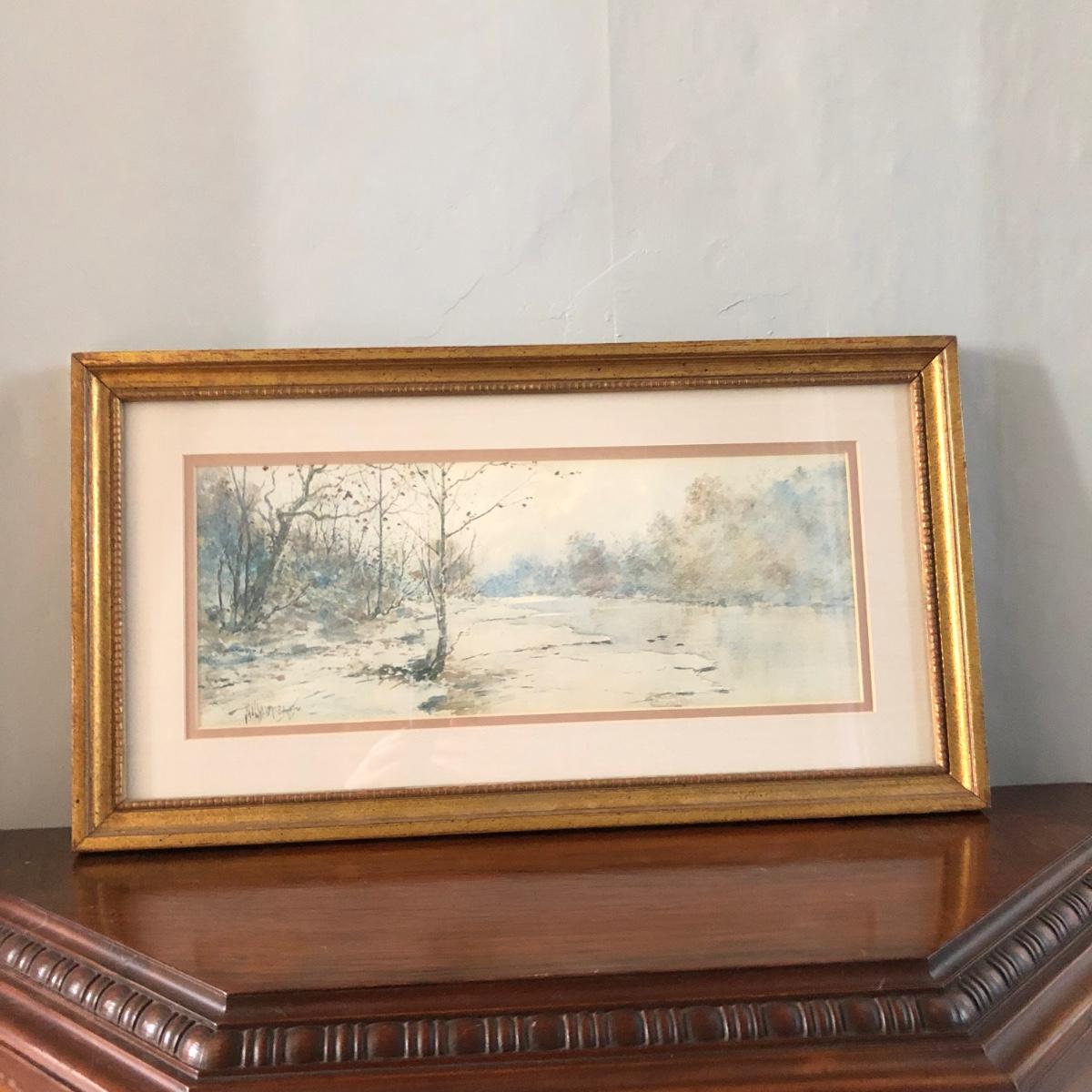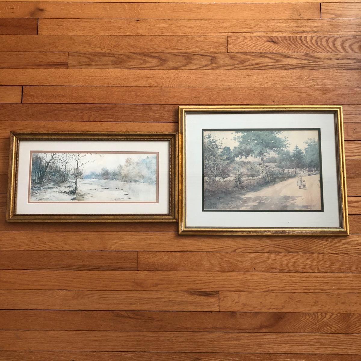 These 2 watercolor landscape prints have gold frames and the signature of Paul Sawyier. The larger print has Authentication paperwork attached to the back as pictured and is titled “Berry Pickin’”. “Berry Pickin’” is 20” x 16” x 1” and shows a young girl and boy walking down a dirt road in the country holding small baskets. The smaller print is 20” x 11” x 1” and features a partially frozen lake in winter with trees missing their leaves along the shore. Shipping available. Shipping art can be costly. Please contact the local UPS store to get a shipping quote.