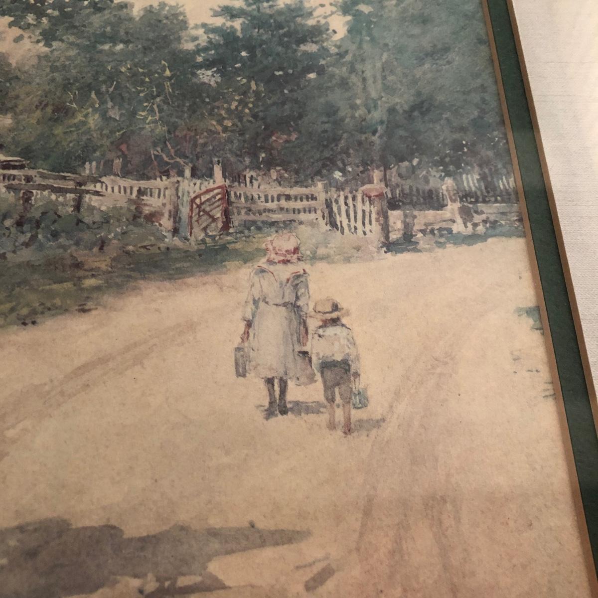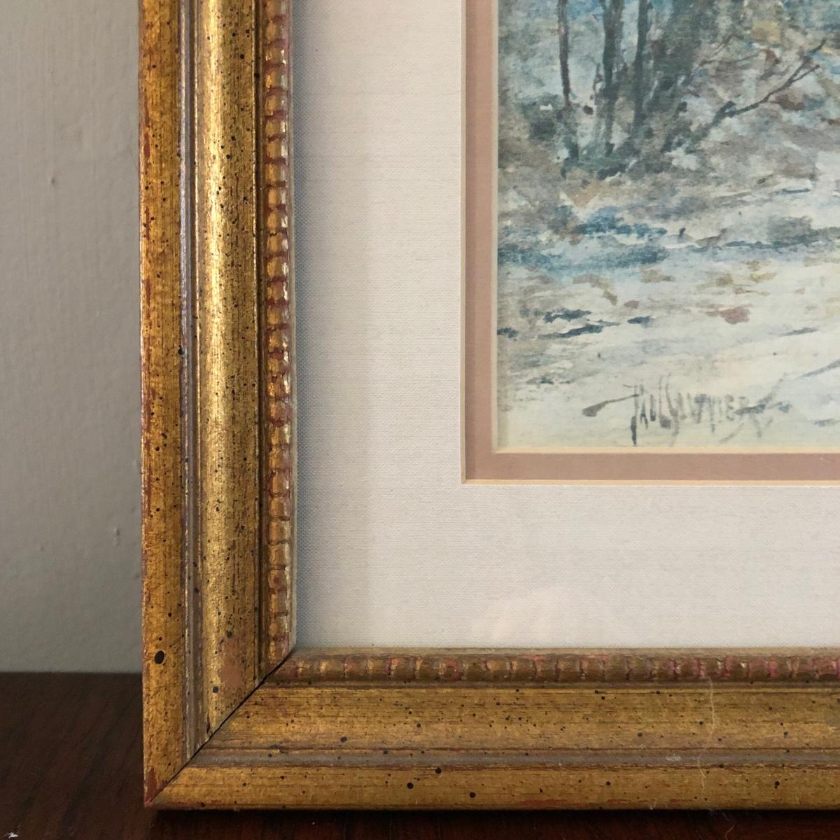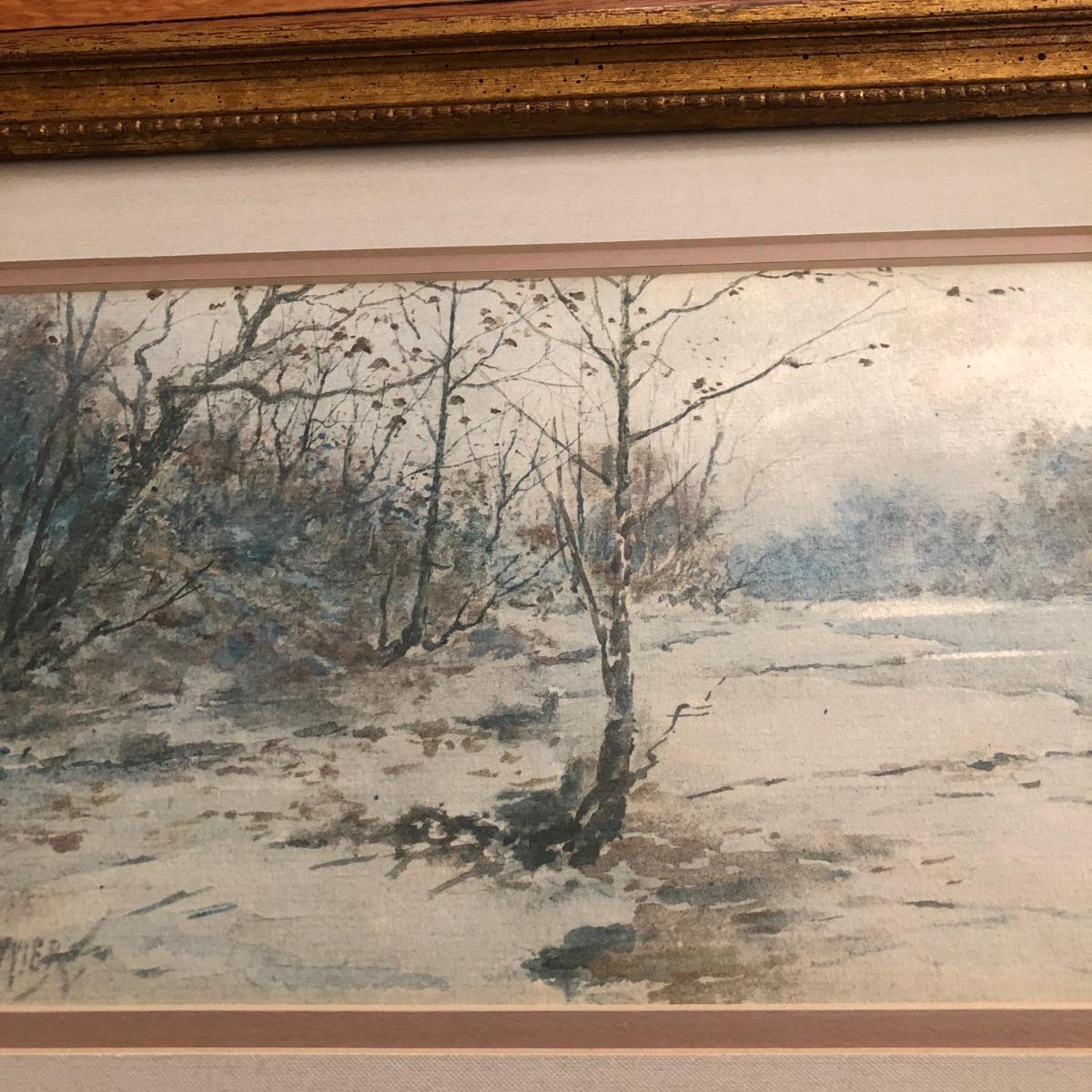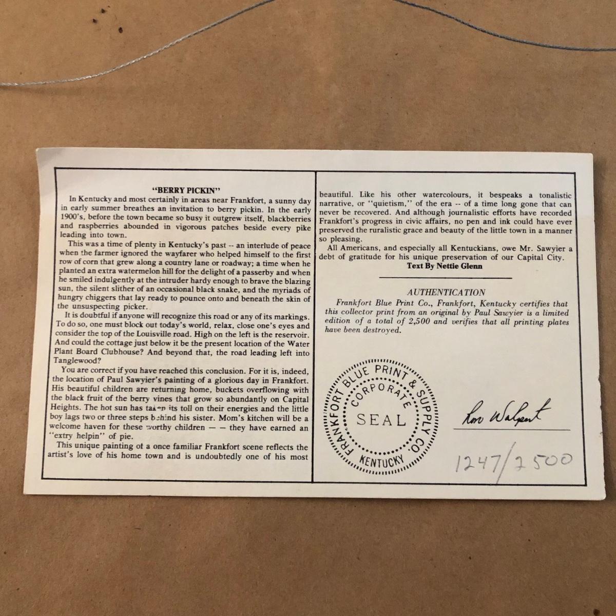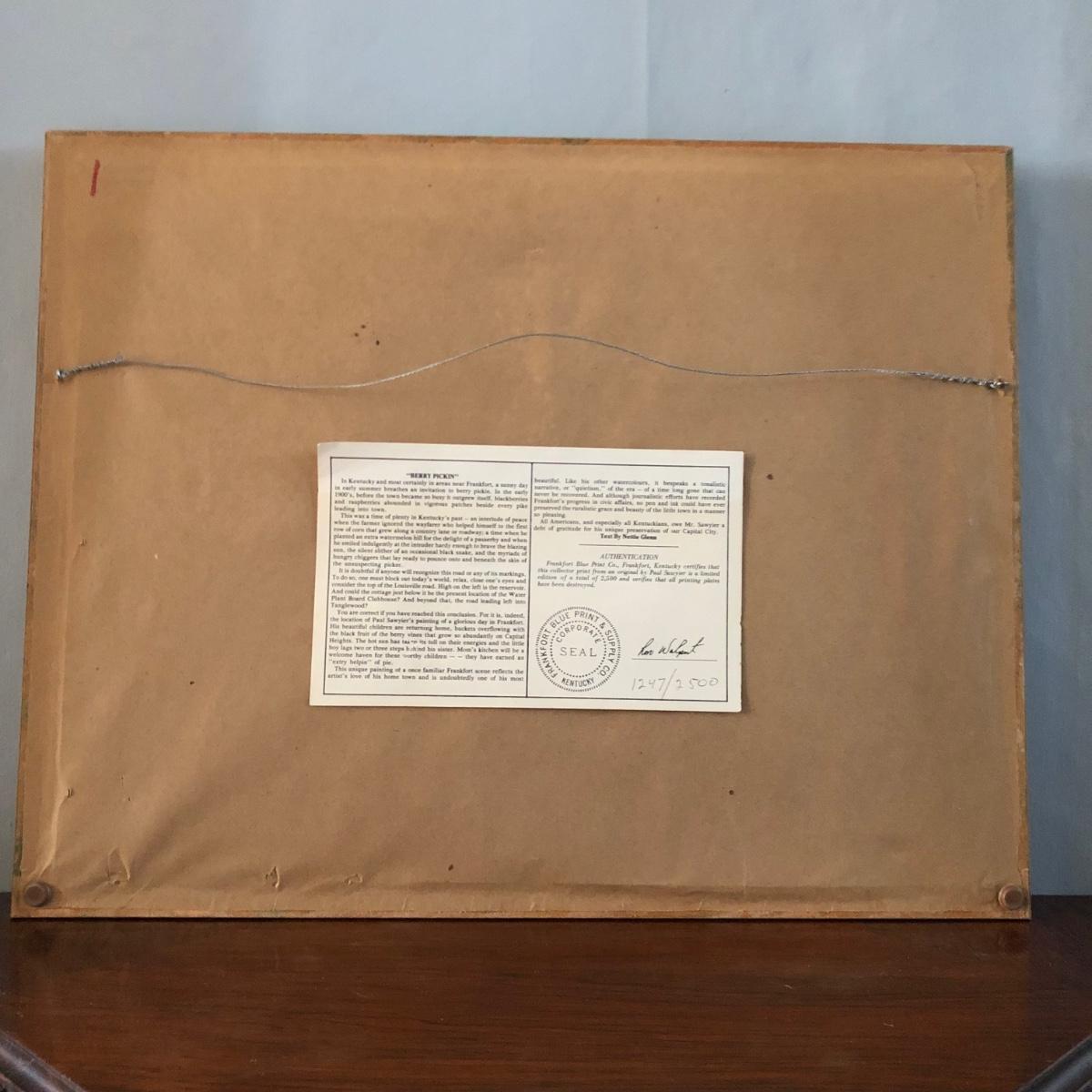 These 2 watercolor landscape prints have gold frames and the signature of Paul Sawyier. The larger print has Authentication paperwork attached to the back as pictured and is titled “Berry Pickin’”. “Berry Pickin’” is 20” x 16” x 1” and shows a young girl and boy walking down a dirt road in the country holding small baskets. The smaller print is 20” x 11” x 1” and features a partially frozen lake in winter with trees missing their leaves along the shore. Shipping available. Shipping art can be costly. Please contact the local UPS store to get a shipping quote.