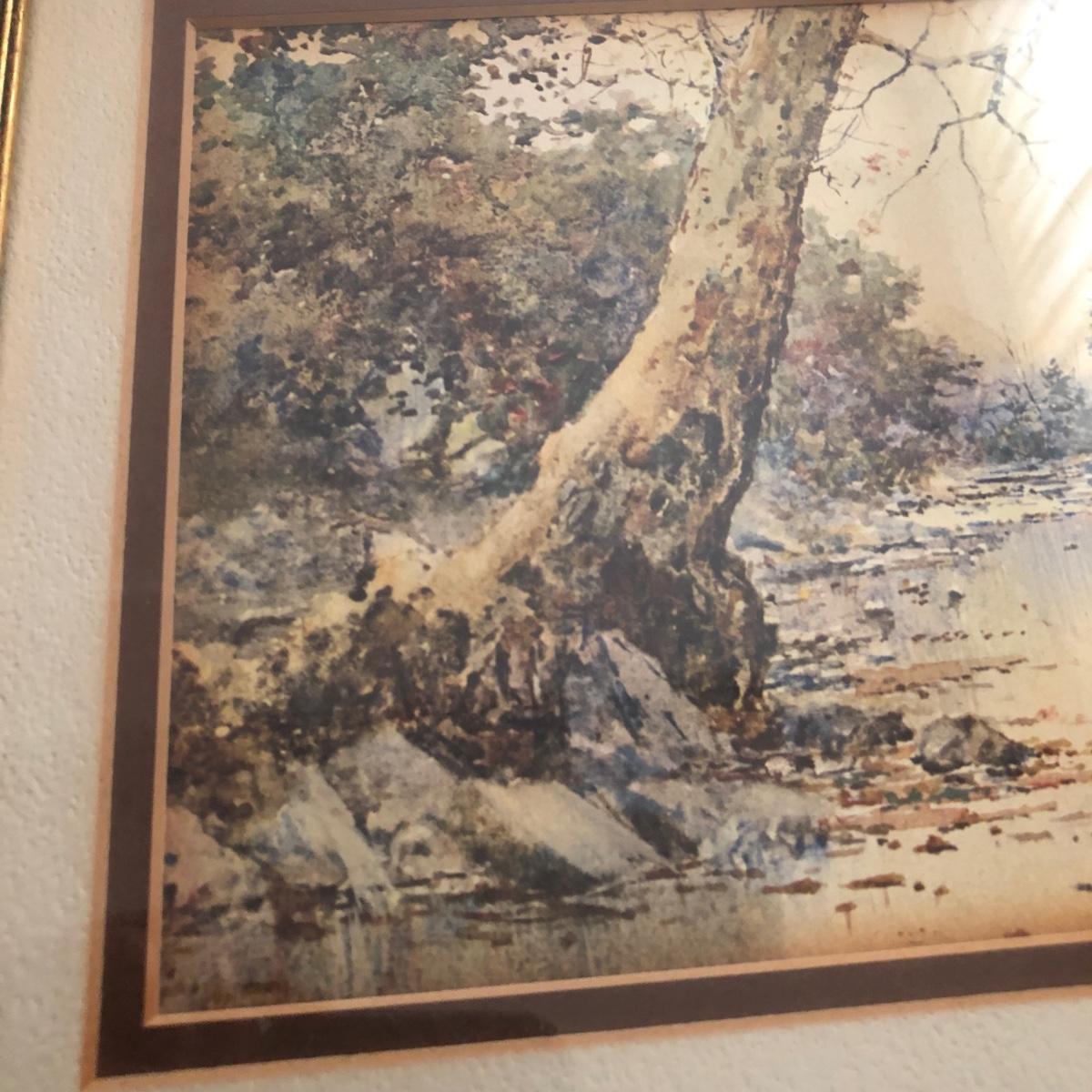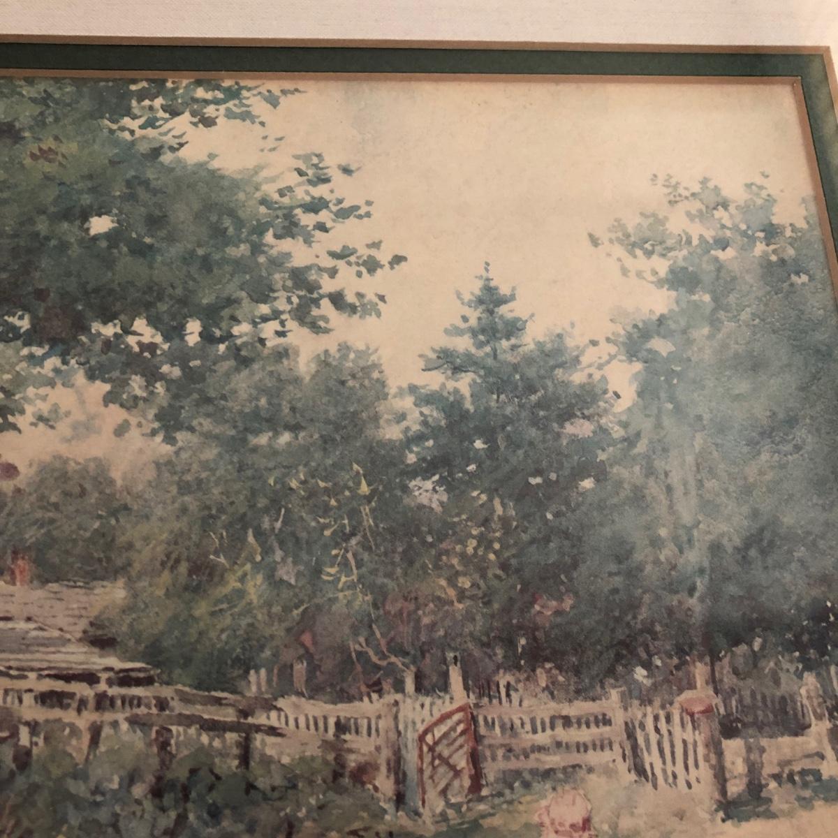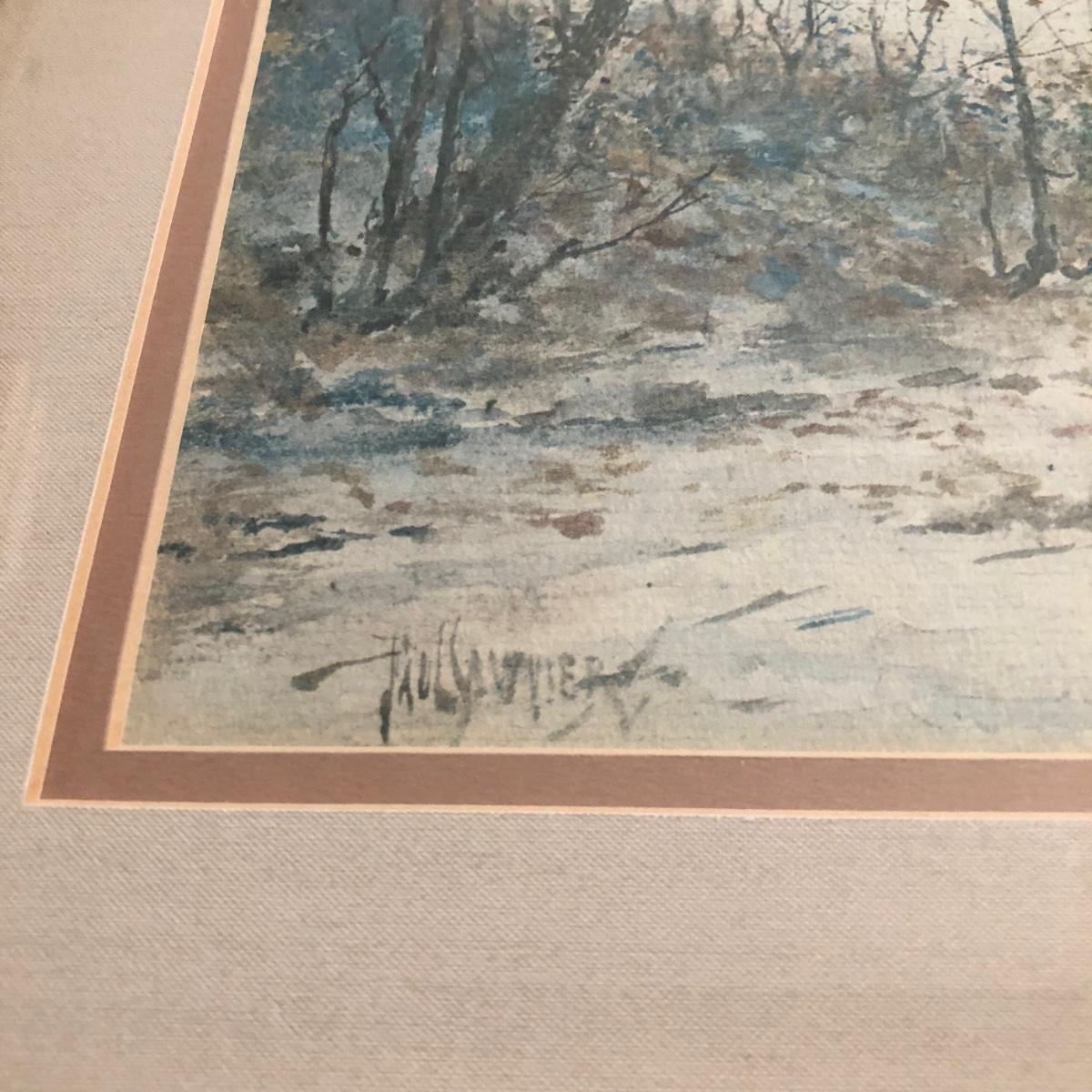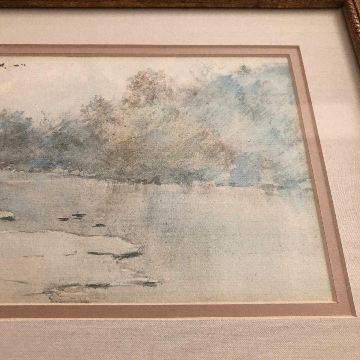 These 2 watercolor landscape prints have gold frames and the signature of Paul Sawyier. The larger print has Authentication paperwork attached to the back as pictured and is titled “Berry Pickin’”. “Berry Pickin’” is 20” x 16” x 1” and shows a young girl and boy walking down a dirt road in the country holding small baskets. The smaller print is 20” x 11” x 1” and features a partially frozen lake in winter with trees missing their leaves along the shore. Shipping available. Shipping art can be costly. Please contact the local UPS store to get a shipping quote.